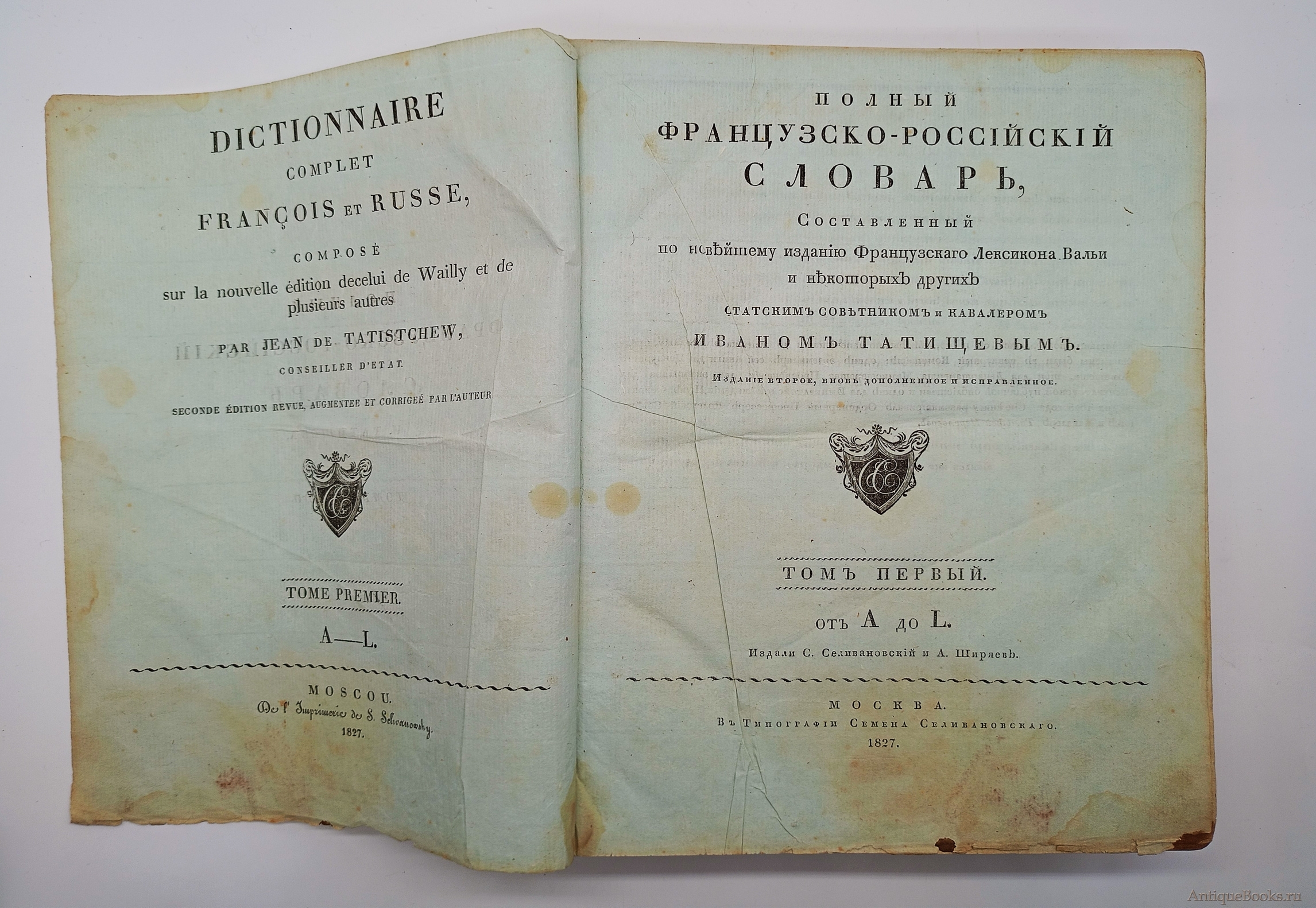Полный французско-российский словарь, составленный по новейшему изданию Французского Лексикона Вальи и некоторых других Статским Советником и Кавалером Иваном Татищевым. Издание второе, вновь дополненное и исправленное. Издали С.Селивановский и А.Ширяев.
