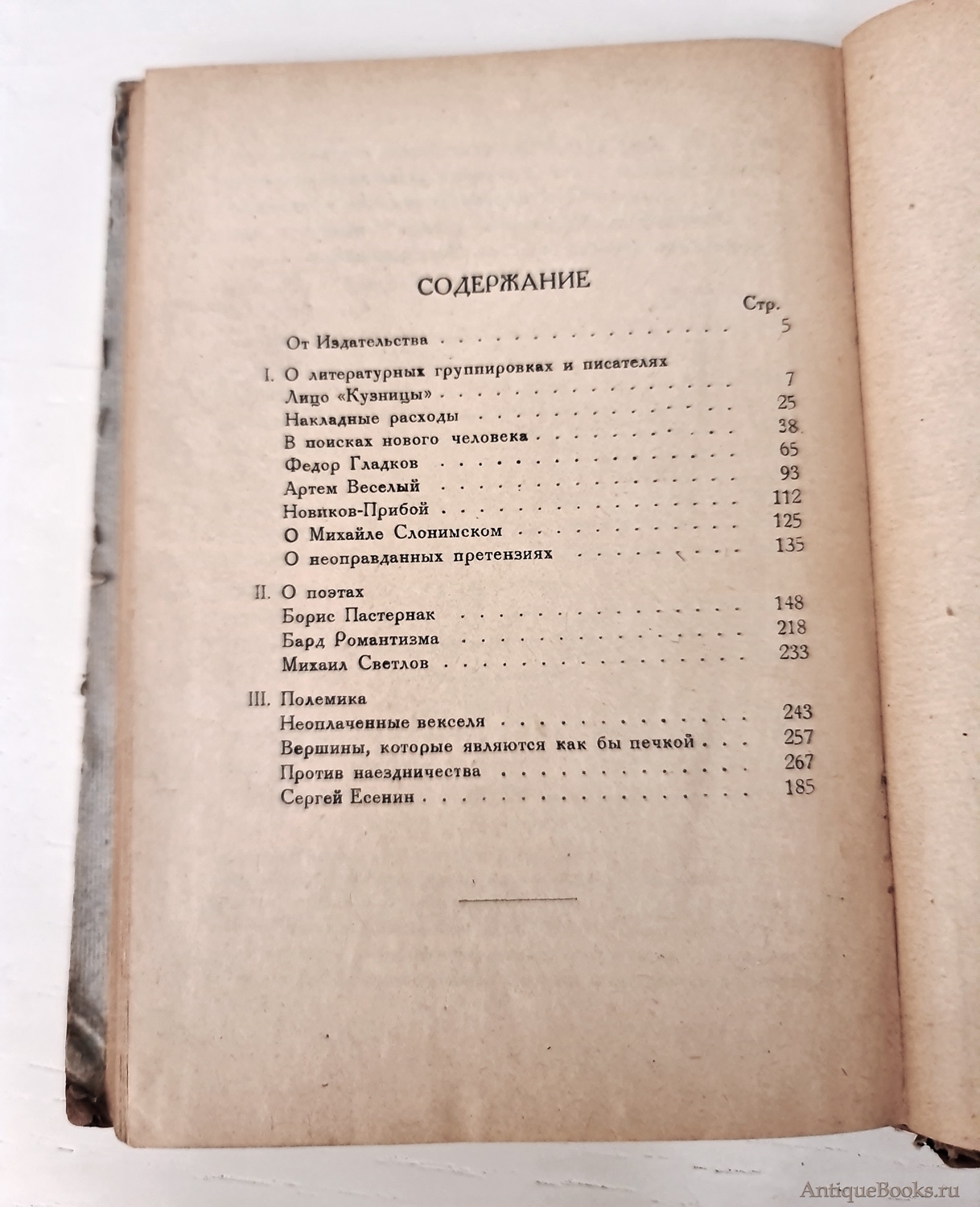 Содержание сборника: 1. О литературных группировках и писателях. Лицо "Кузницы". Накладные расходы. В поисках нового человека. Федор Гладков. Артемий Веселый. Новиков-Прибой. О Михаиле Слонимском. О неоправданных претензиях. 2. О поэтах. Борис Пастернак. Бард Романтизма. Михаил Светлов. 3. Полемика. Неоплаченные векселя. Вершины, которые являются как бы печкой. Против наездничества. Сергей Есенин. Цена: 5 000 руб.