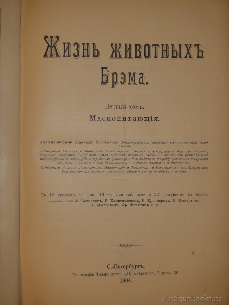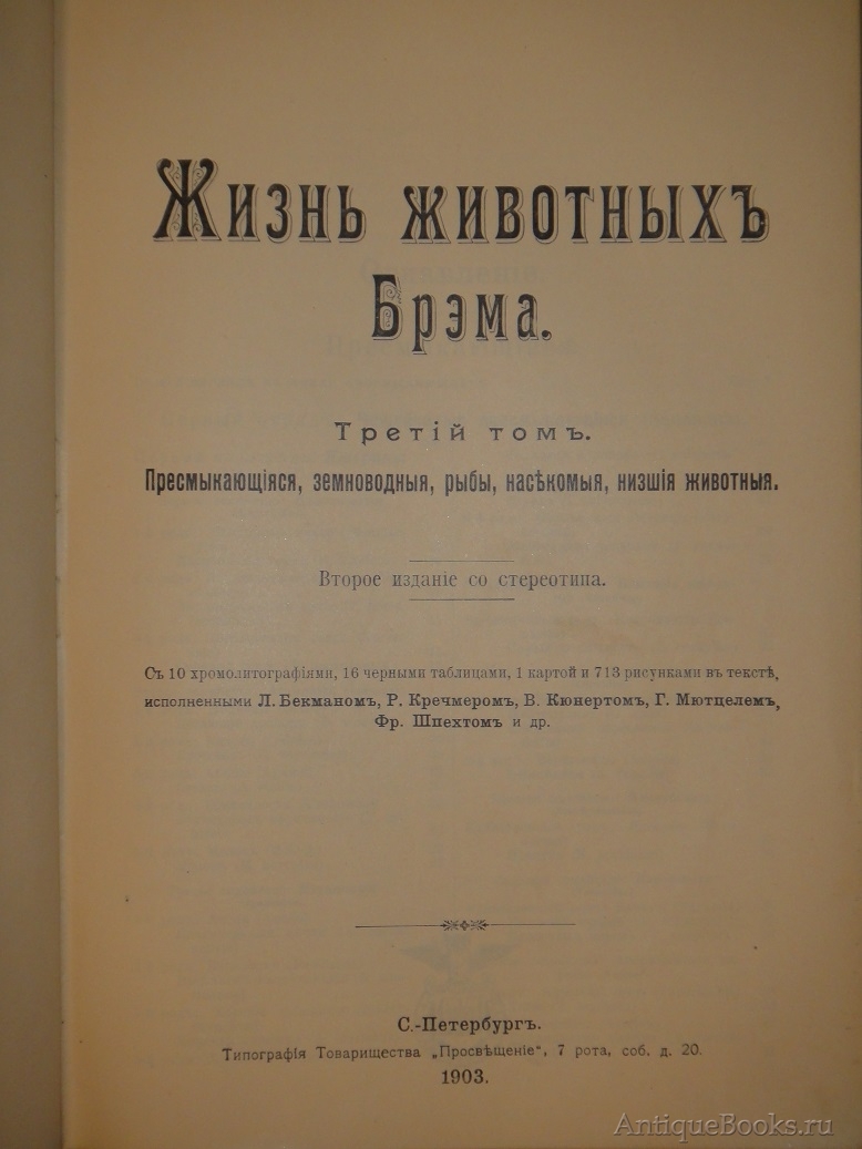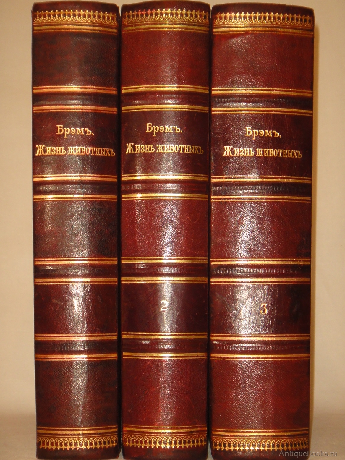 Том 1. Млекопитающие. 1904. XXI, 853, [9] стр. С 10 хромолитографиями, 16 чёрными таблицами и 221 рисунком в тексте. Том 2. Птицы. 1903. XXI, 880, [8] стр. С 10 хромолитографиями, 19 чёрными таблицами и 225 рисунками в тексте. Том 3. Пресмыкающиеся, земноводные, рыбы, насекомые, низшие животные. 1903. XLIII, 1066, [10] стр. С 10 хромолитографиями, 16 чёрными таблицами, цветной картой и 713 рисунками в тексте.