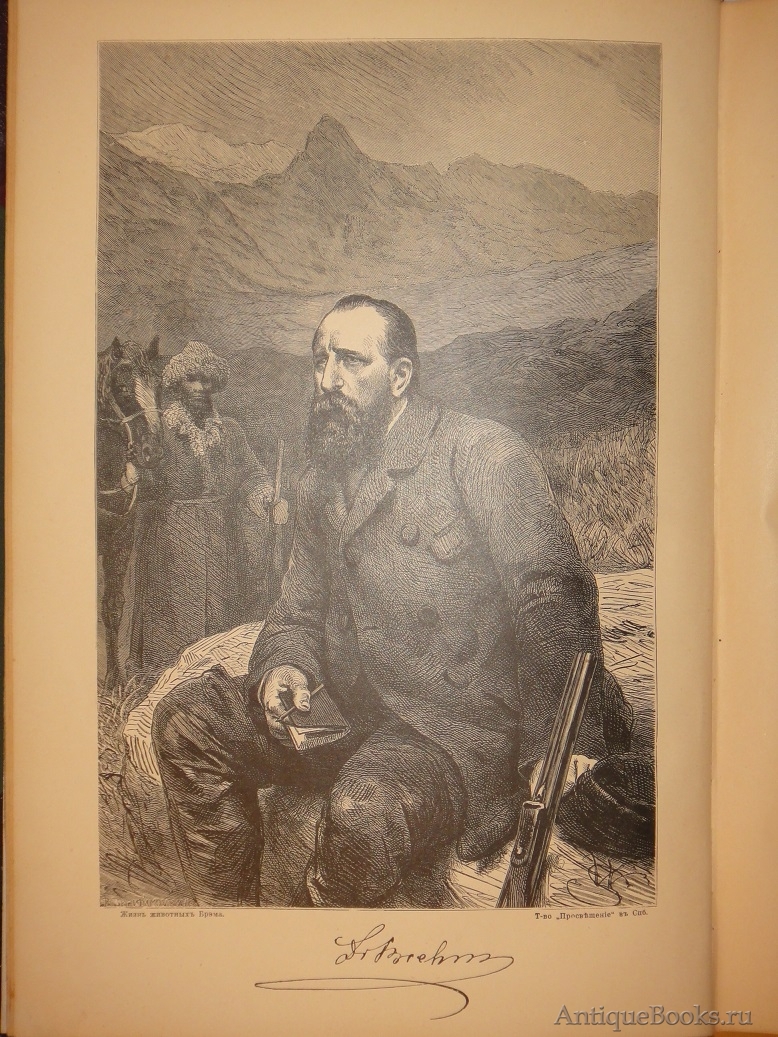 На фронтисписе первого тома портрет А.Брема, сидящего на привале с записной книжкой и ружьём.