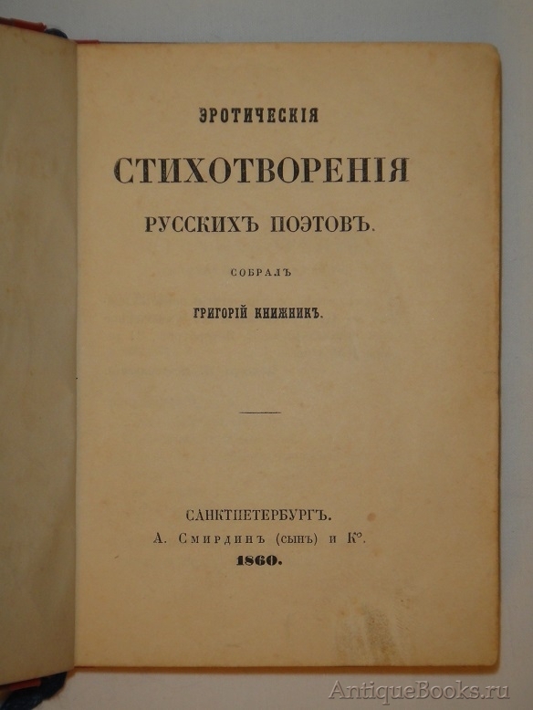 "Любовь. Эротические стихотворения русских поэтов" Собрал Григорий Книжник ( псевд. ) С.-Петербург, Издание А.Смирдин ( сын ) и К°, Типография Эдуарда Праца, 1860г.