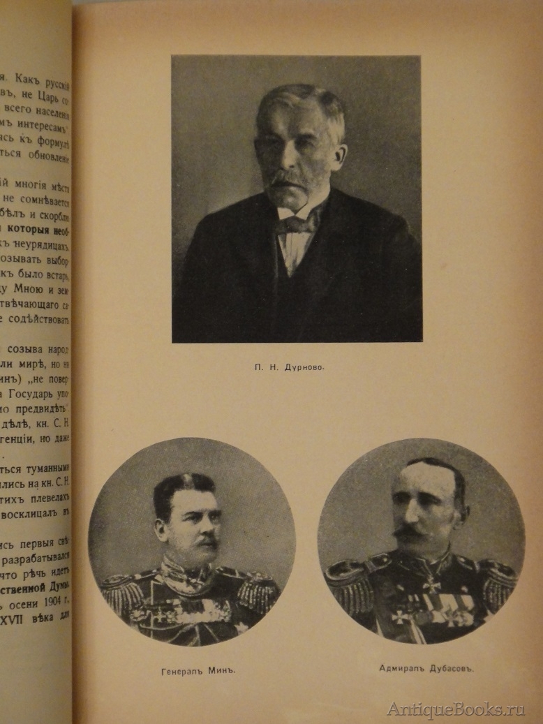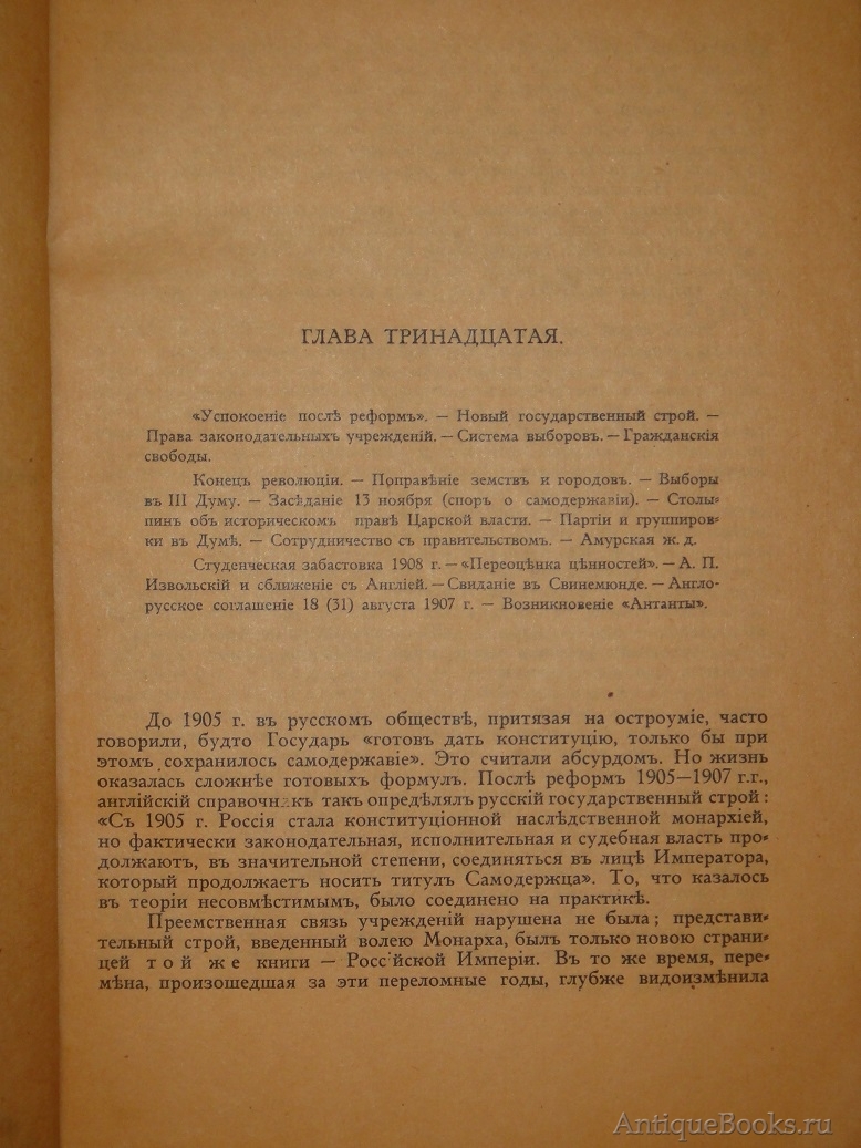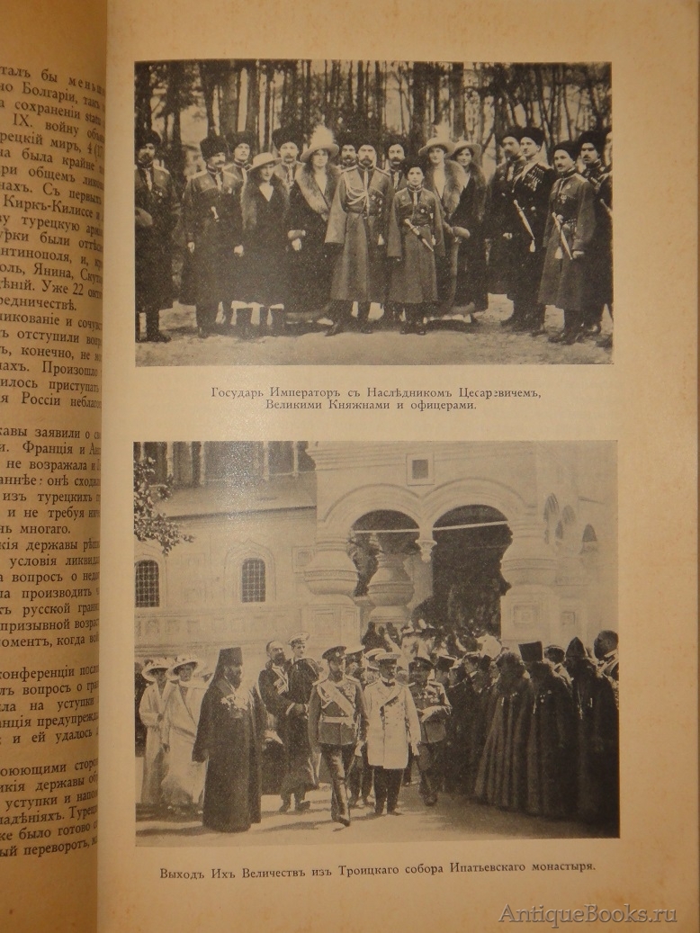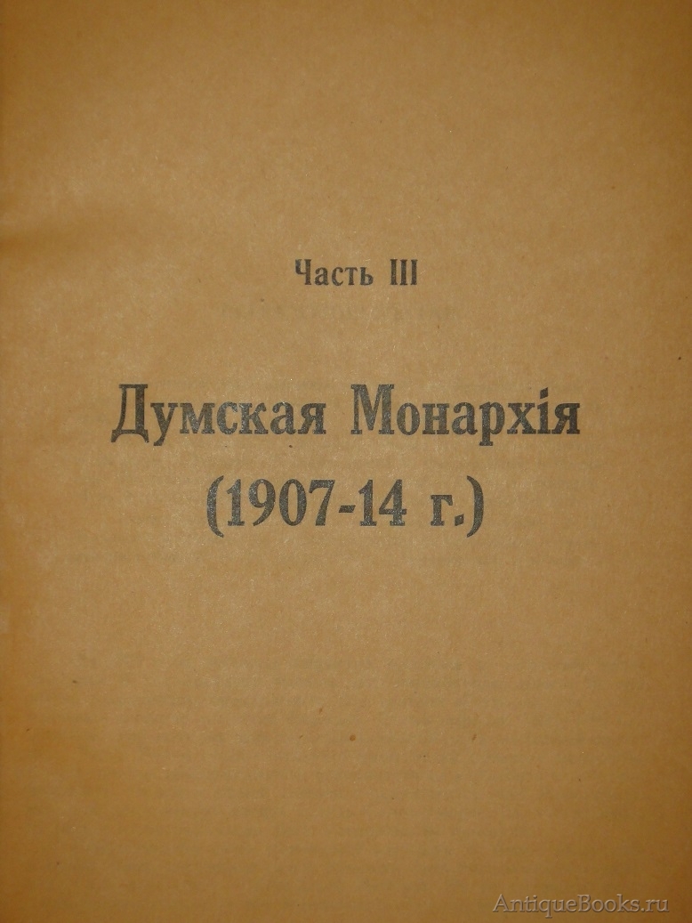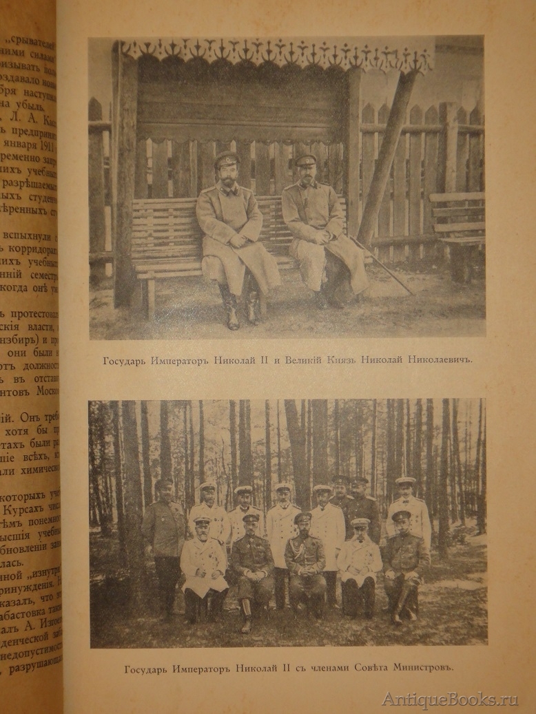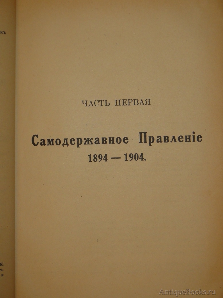 Т.I ( Кн. 1-2 ). Белград. Издание Общества Распространения Русской Национальной и Патриотической Литературы. 1939. Часть первая: Главы I-VIII. Самодержавное правление ( 1894-1904 ). Шестнадцать иллюстраций на отдельных вклейках. Стр. 1-224. Часть вторая: Главы IX-XII. Переломные годы ( 1904-1907 ). Восемь иллюстраций на отдельных вклейках. Стр. 225-388. Т.II ( Кн. 3 ). Мюнхен. Издание Общества Распространения Русской Национальной и Патриотической Литературы. 1949. Часть третья: Главы XIII-XVII. Думская монархия ( 1907-1914 ). Пять иллюстрации на отдельных вклейках. Часть четвёртая: Главы XVIII-XXI. Мировая война ( 1914-1917 ). Шесть иллюстраций на отдельных вклейках. 260 стр.