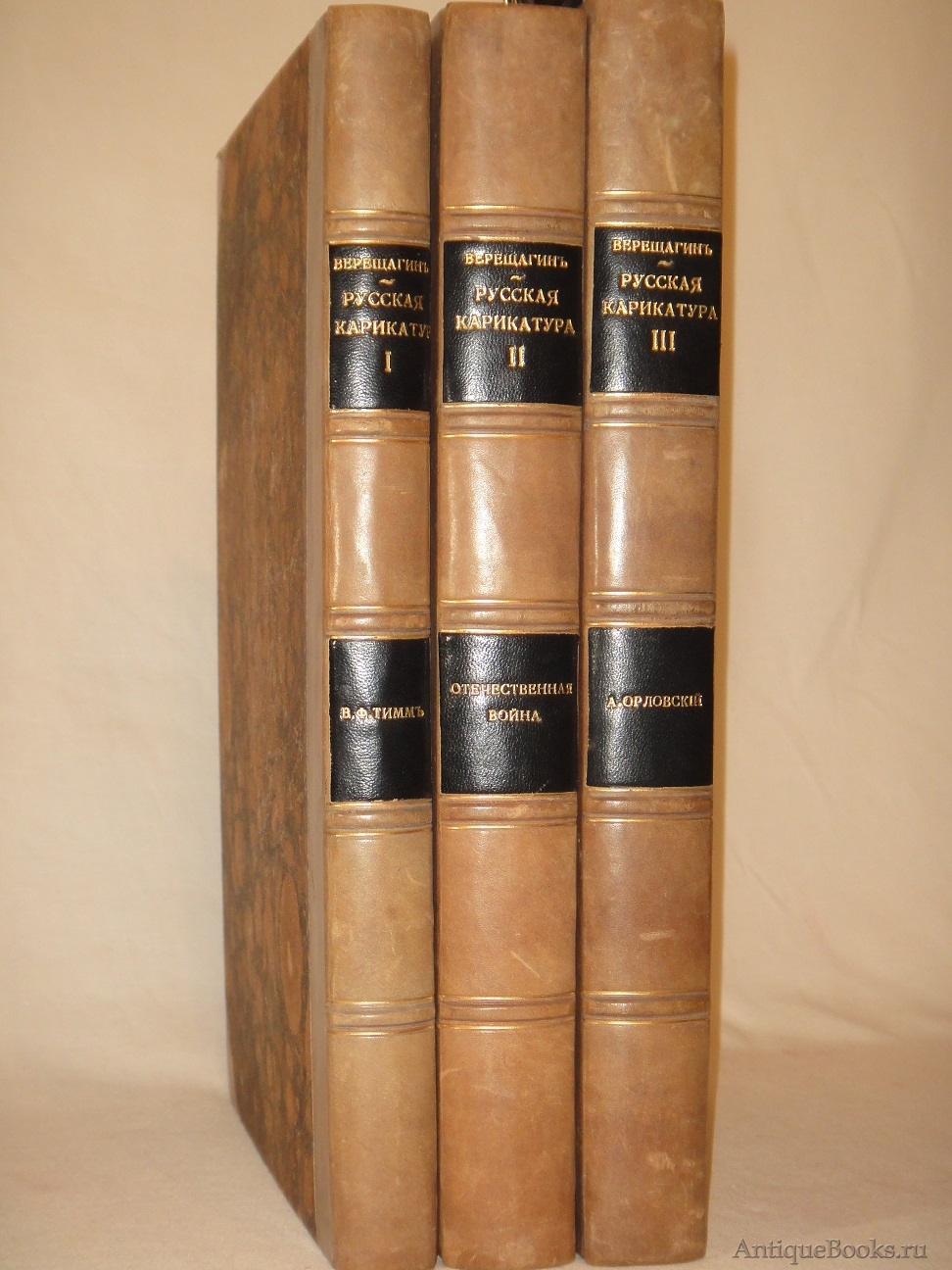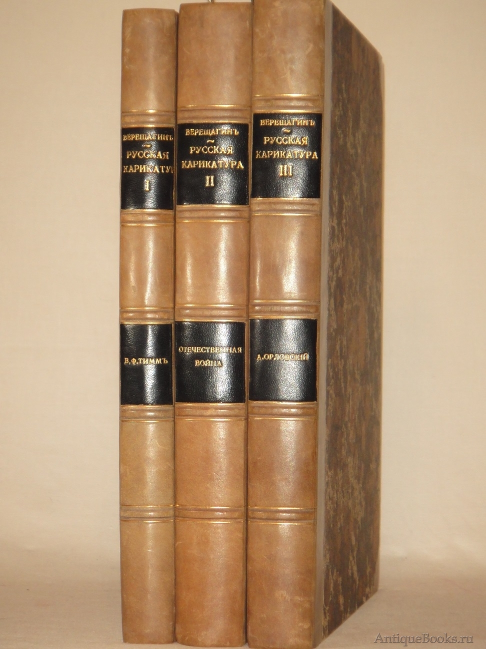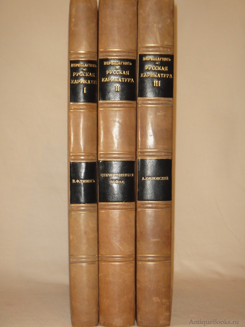 Эти три книги, составленные знаменитым русским историком искусства, издателем, членом Совета Императорской Академии художеств Василием Андреевичем Верещагиным ( 1859-1931 ), представляют собой основательное исследование истории русской карикатуры, жанра, который в России развивался с конца XVIII века и приобрёл особое значение в XIX и начале XX века. В книгах собраны как известные, так и редкие карикатуры, освещающие политические, социальные и культурные реалии своей эпохи. Карикатуры, часто остросоциальные и сатирические, отражают важнейшие события, личности и настроения, критикуют общественные и государственные институты, высмеивают пороки власти, знати и обычных людей. В этих книгах карикатура рассматривается не только как искусство, но и как важный инструмент в общественной жизни, играющий значительную роль в политических и социальных процессах. Издание охватывает несколько десятилетий развития карикатуры в России и включает работы выдающихся художников и карикатуристов того времени.