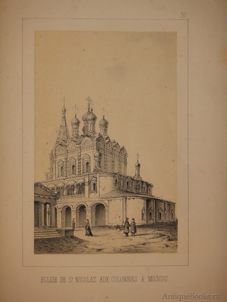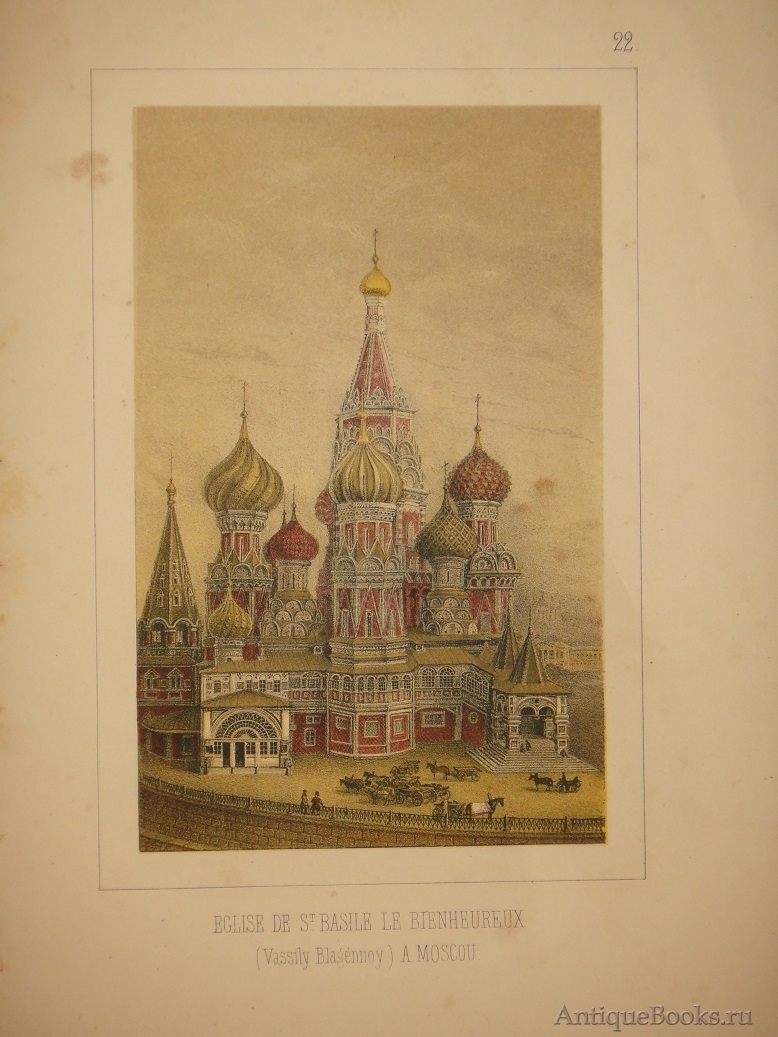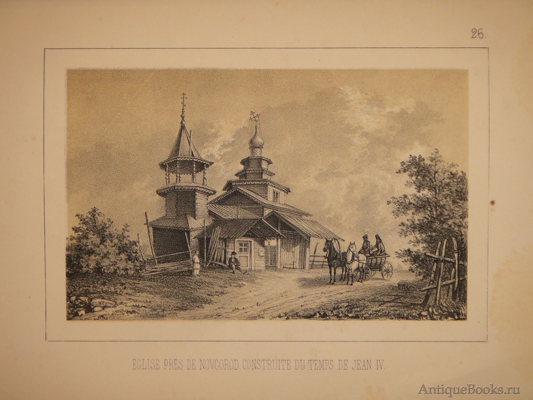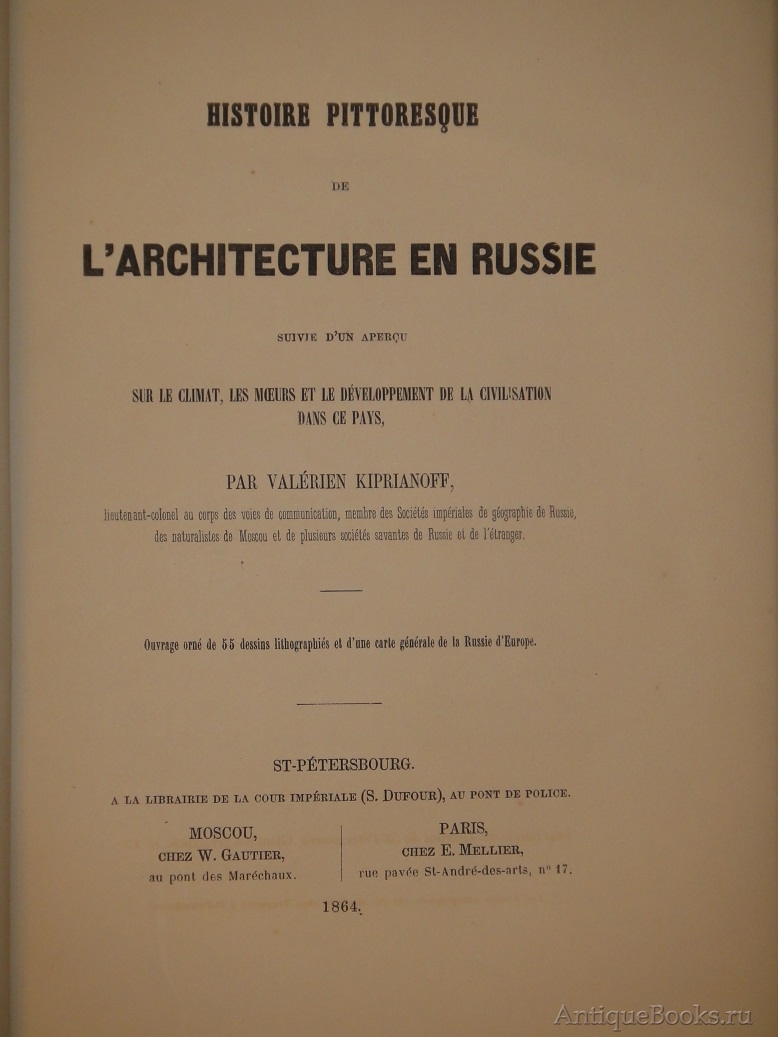 "Живописная история архитектуры в России с описанием климата, обычаев и развития цивилизации в этой стране. Histoire pittoresque de l'architecture en Russie suivie d'un aperqu sur le climat, les moeurs et le développement de la civilisation dans ce pays" Валериан Киприанов ( Valérien Kiprianoff ) St-Pétersbourg, À la librairie de la cour impériale ( S.Dufour ), 1864.