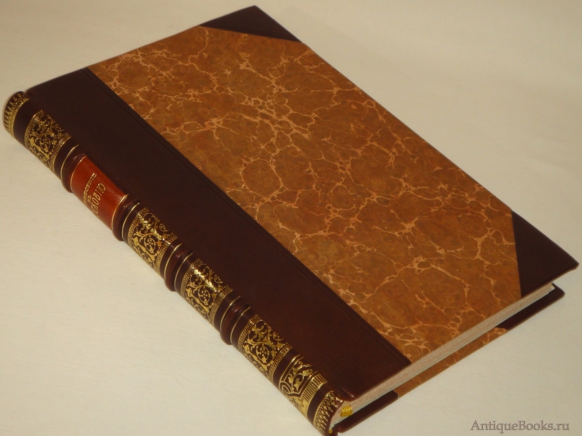 Книга в современном полукожаном французском переплёте с золотым художественным узорным тиснением на бинтовом корешке и контрастной декоративной вставке. Крышки с углами оклеены бумагой под мрамор.