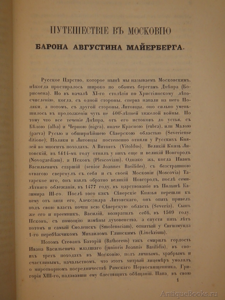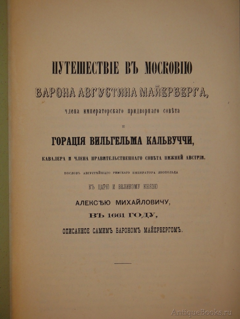 1). Барон Августин Мейерберг " Путешествие в Московию барона Августина Майерберга, члена Придворного совета и Горация Вильгельма Кальвуччи, кавалера и члена Правительственного совета нижней Австрии, послов августейшего римского императора Леопольда к царю и великому князю Алексею Михайловичу в 1661 году, описанное самим бароном Майербергом ".