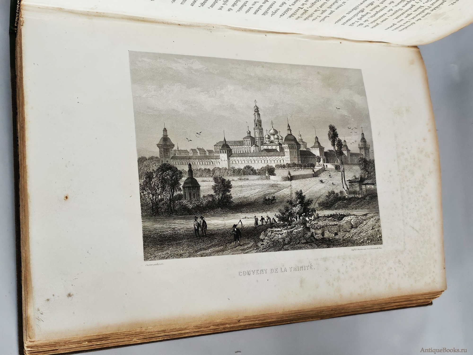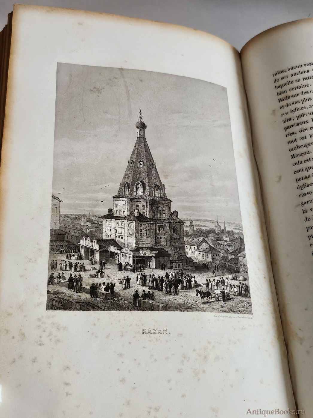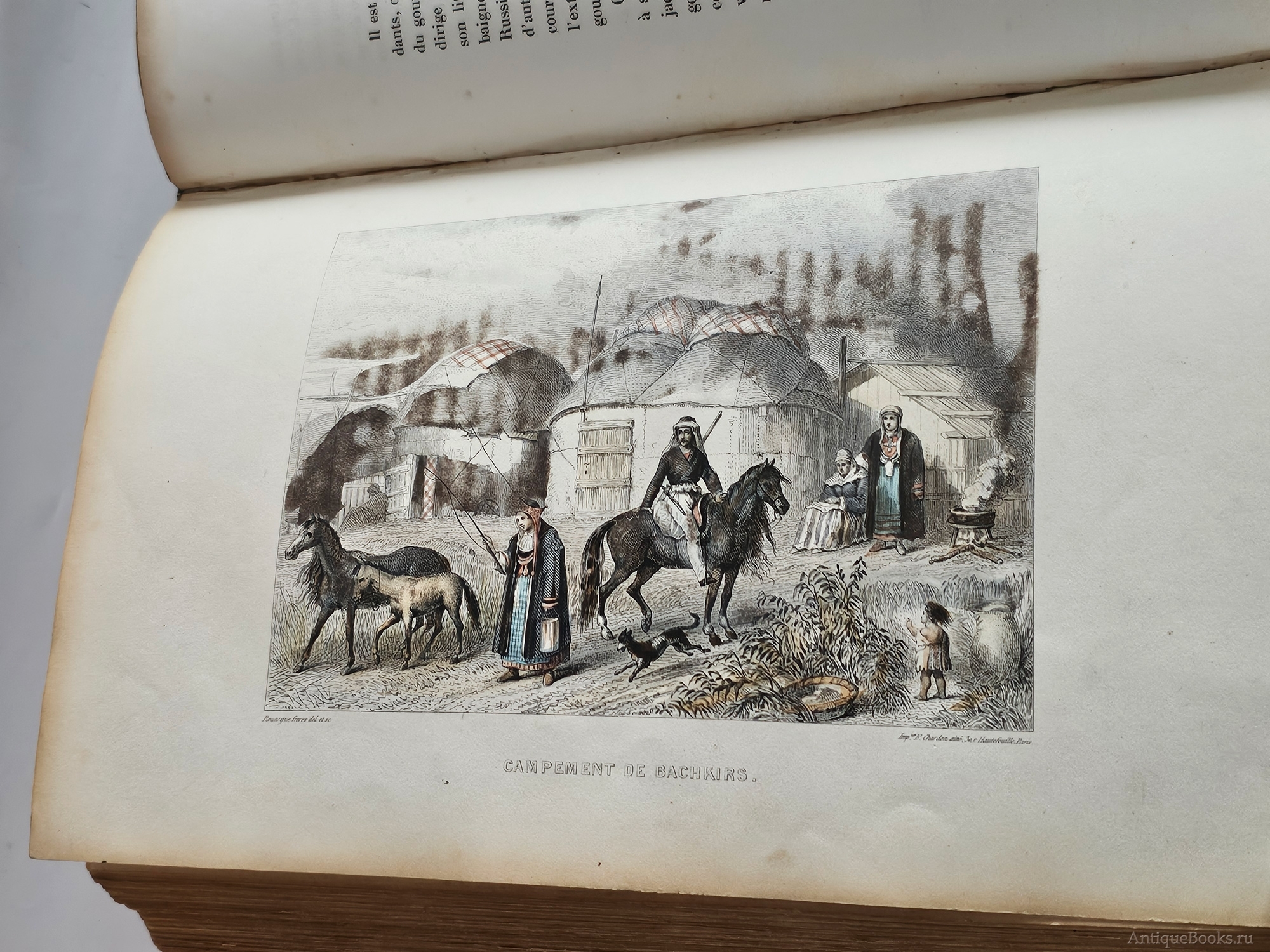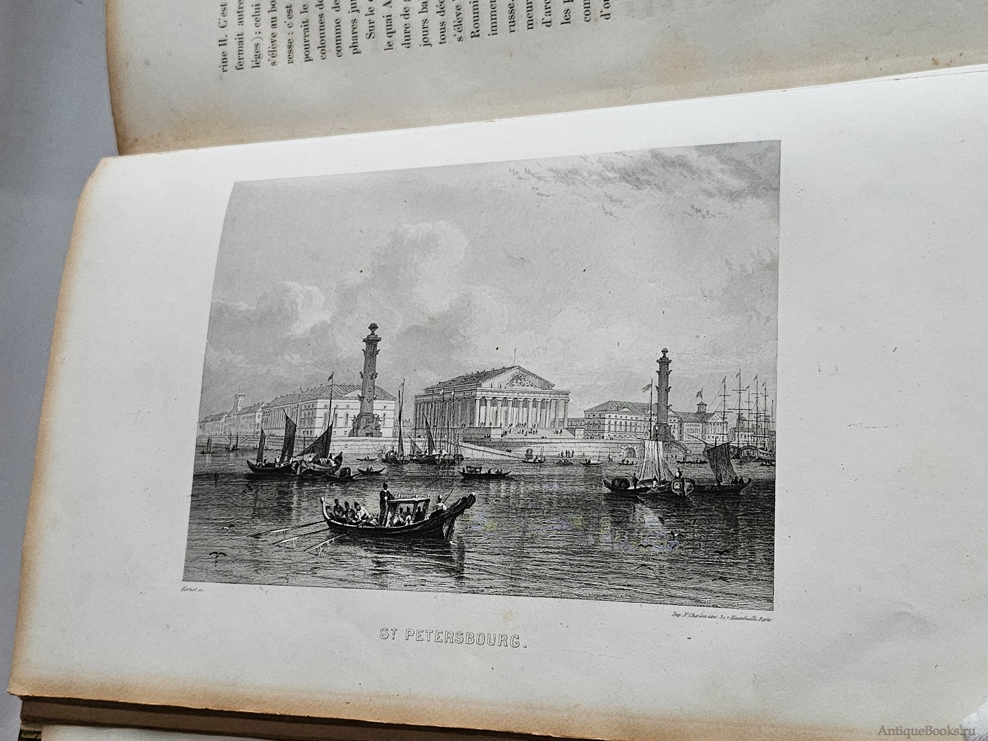 Титульная виньетка и 20 гравюр на стали работы Руарга, Оутвейта и Керно, включая 8 жанровых сцен с раскрашенными вручную костюмами. Первое издание этого знаменитого путевого очерка, от Санкт-Петербурга до Кавказа через Финляндию, Москву и Нижний Новгород, а затем путешествие из Санкт-Петербурга на Камчатку.