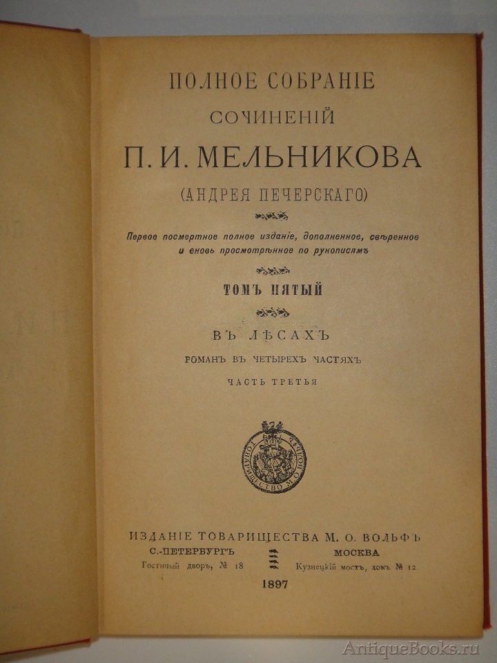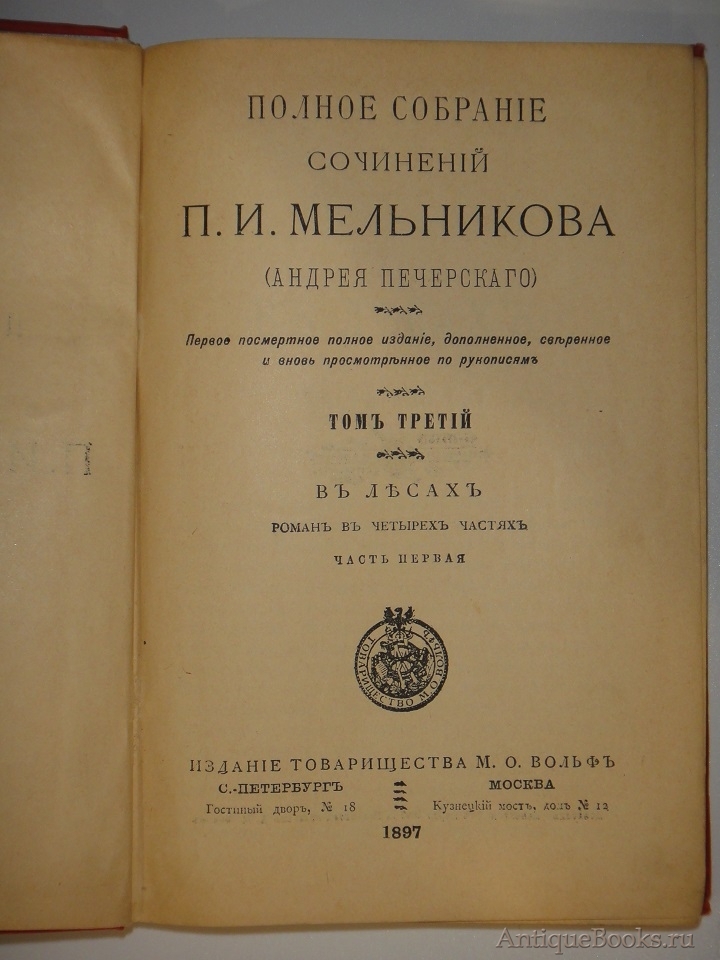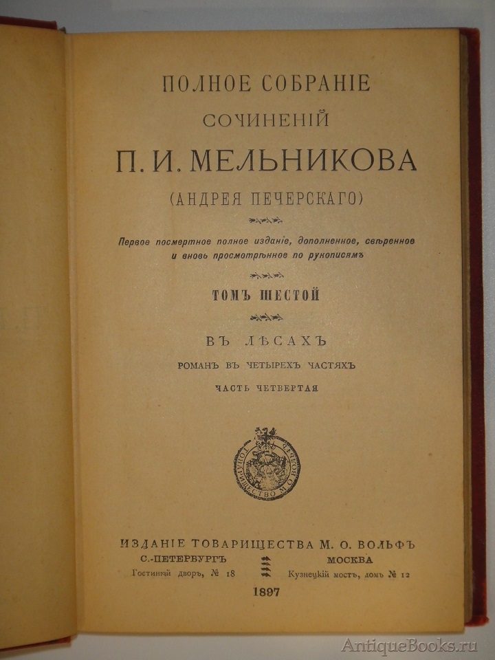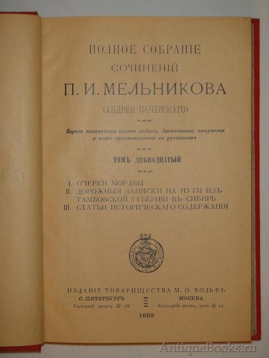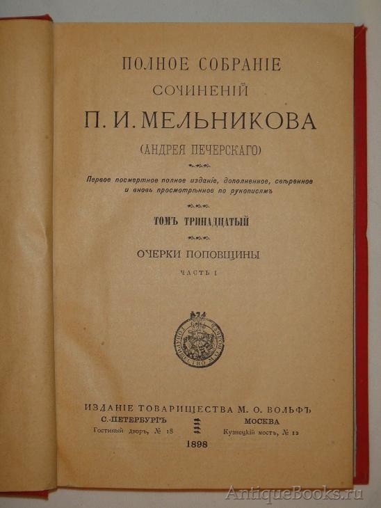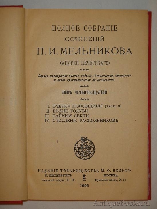"Полное собрание сочинений П.И.Мельникова ( Андрея Печерского ) в четырнадцати томах" П.И.Мельников-Печерский С.-Петербург-Москва, Издание Товарищества М.О.Вольф, 1897-1898гг.