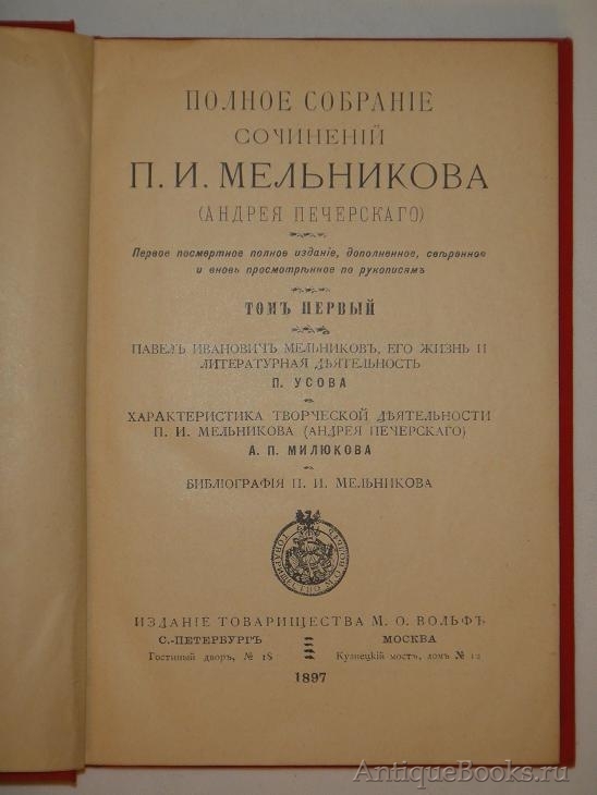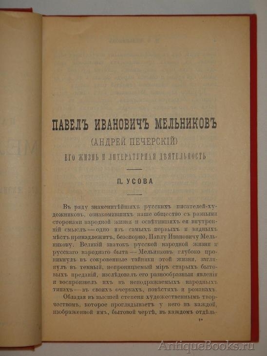 Том 1. П.С.Усов " Павел Иванович Мельников ( Андрей Печерский ), его жизнь и литературная деятельность ". - А.П.Милюков " Характеристика творческой деятельности П.И.Мельникова ( Андрея Печерскаго ). - Библиография П.И.Мельникова. 1897. [X], 324 стр.; иллюстрации.