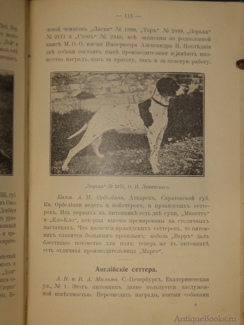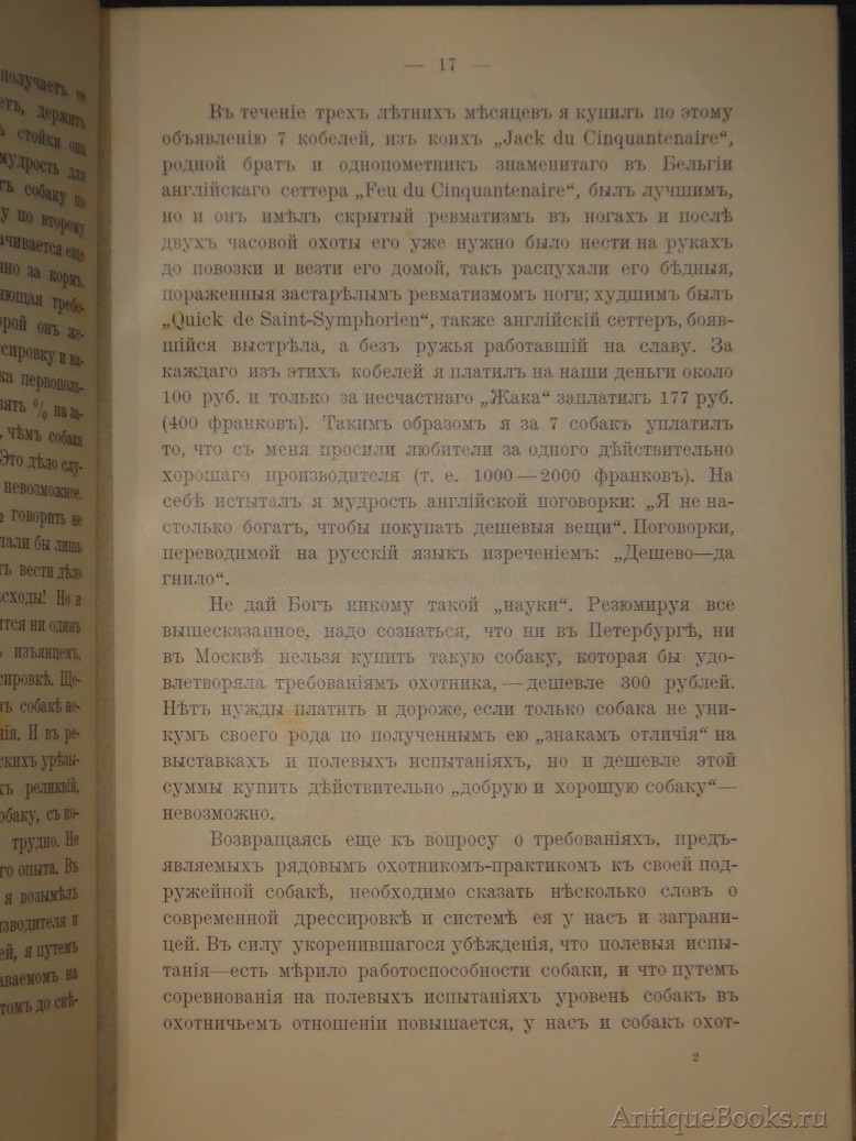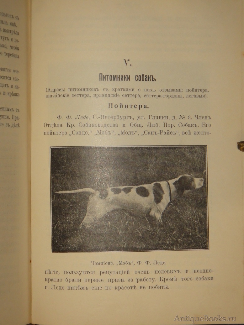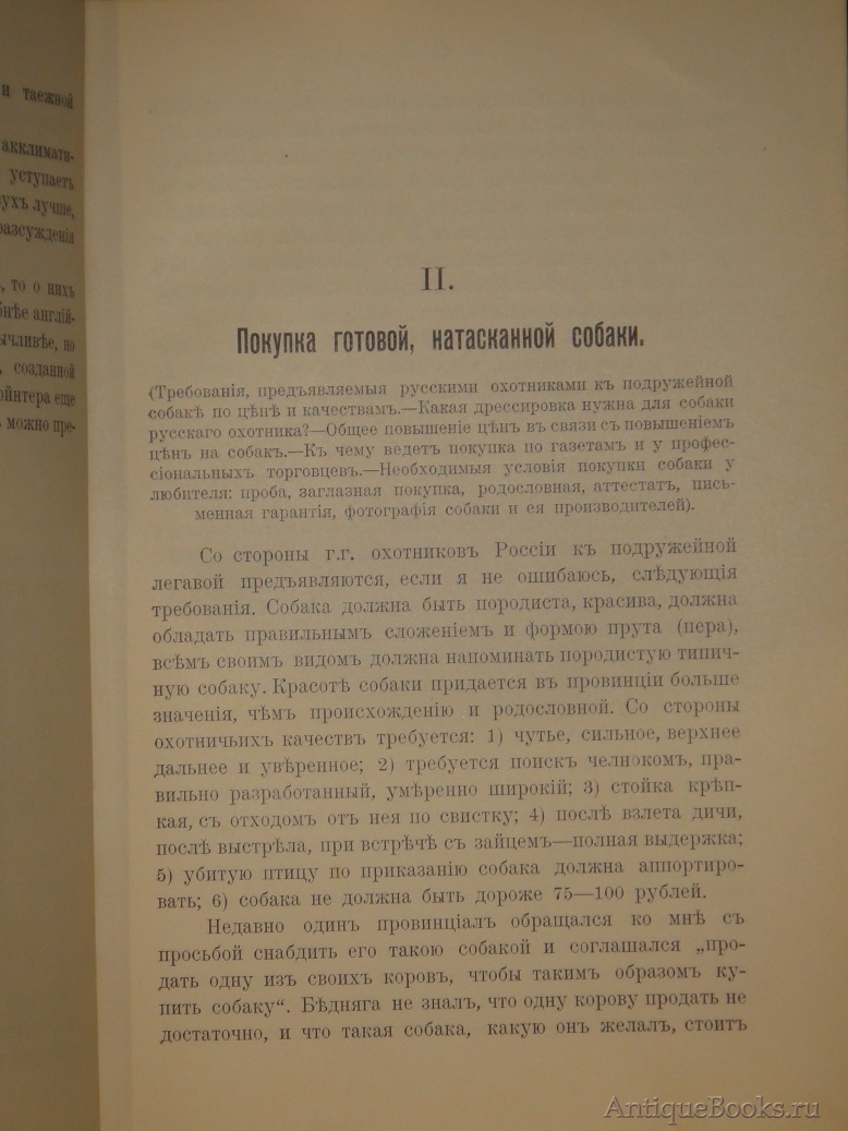 Авторское предисловие. " Отрывочность и разнообразие сведений по вопросам собаководства и охоты с легавой собакой, разбросанность этих сведений в течение многих лет по страницам журналов, из коих многие прекратили существование за недостатком подписчиков, другие ещё дышат, но по цене не доступны рядовому охотнику, - всё это исключает возможность систематизации материала воедино. Большая публика, читающая журналы лишь случайно, и каждый охотник-провинциал найдут в предлагаемой книге этой не " труд ", и не " монографию ", а лишь сборник советов по наиболее жгучим вопросам собаководства. Размеры издания не позволяют охватить вопросы эти шире, полнее и разнообразнее, но и то, что, мы предлагаем читателю, - представляет собою единственную русскую книгу " и т.д.