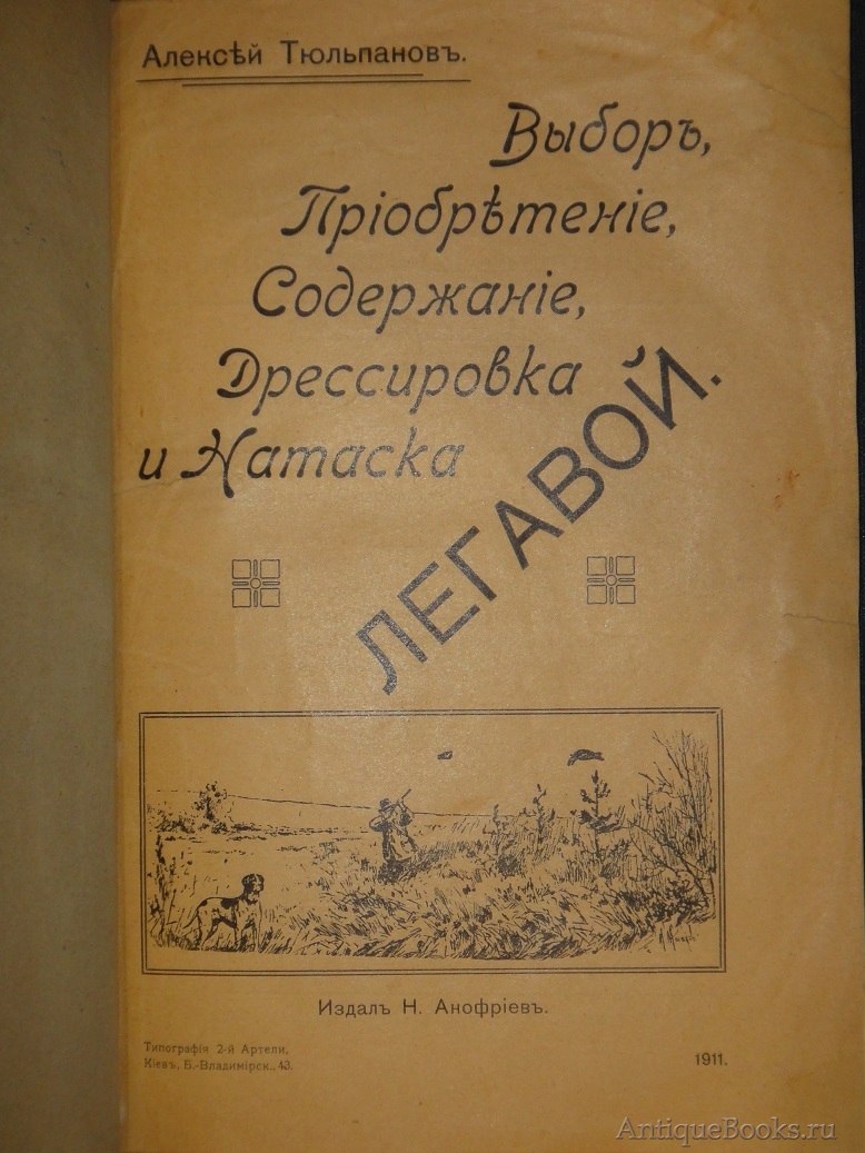 "Выбор, приобретение, содержание, дрессировка и натаска легавой" Алексей Тюльпанов Киев, Типография 2-ой Артели, 1911г.
