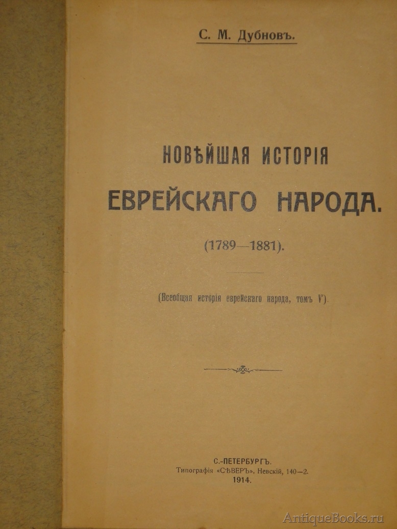 "Новейшая история еврейского народа. ( 1789-1881 )" С.М.Дубнов С.-Петербург, Типография " Север ", 1914г.