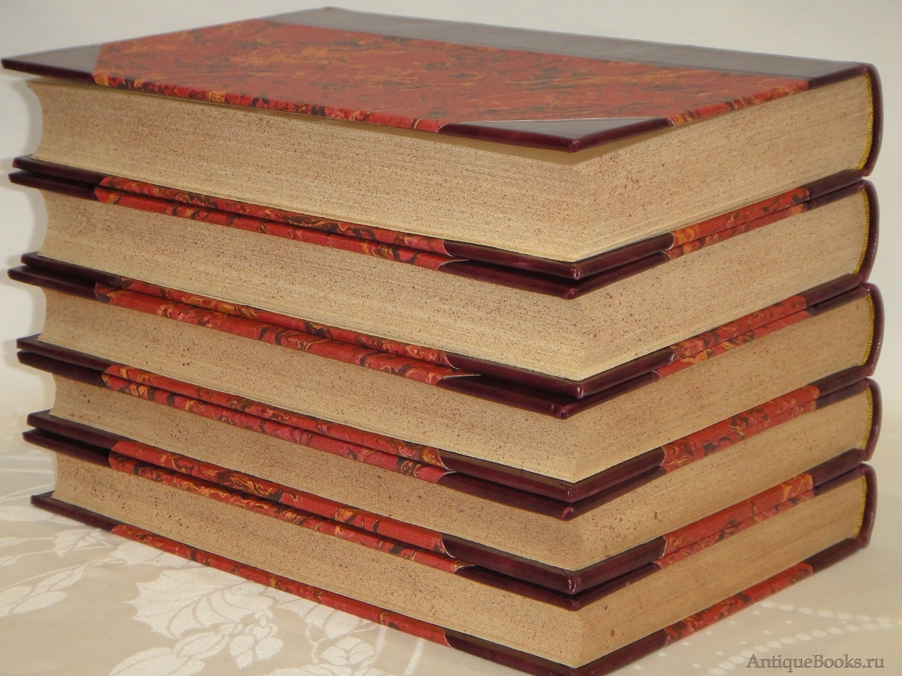 Экземпляр в двух роскошных полукожаных владельческих переплётах с золотым высокохудожественным орнаментальным тиснением на бинтовых корешках и контрастных декоративных вставках. Крышки с углами оклеены бумагой под мрамор.
