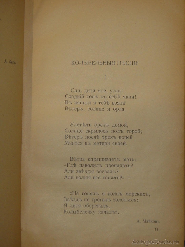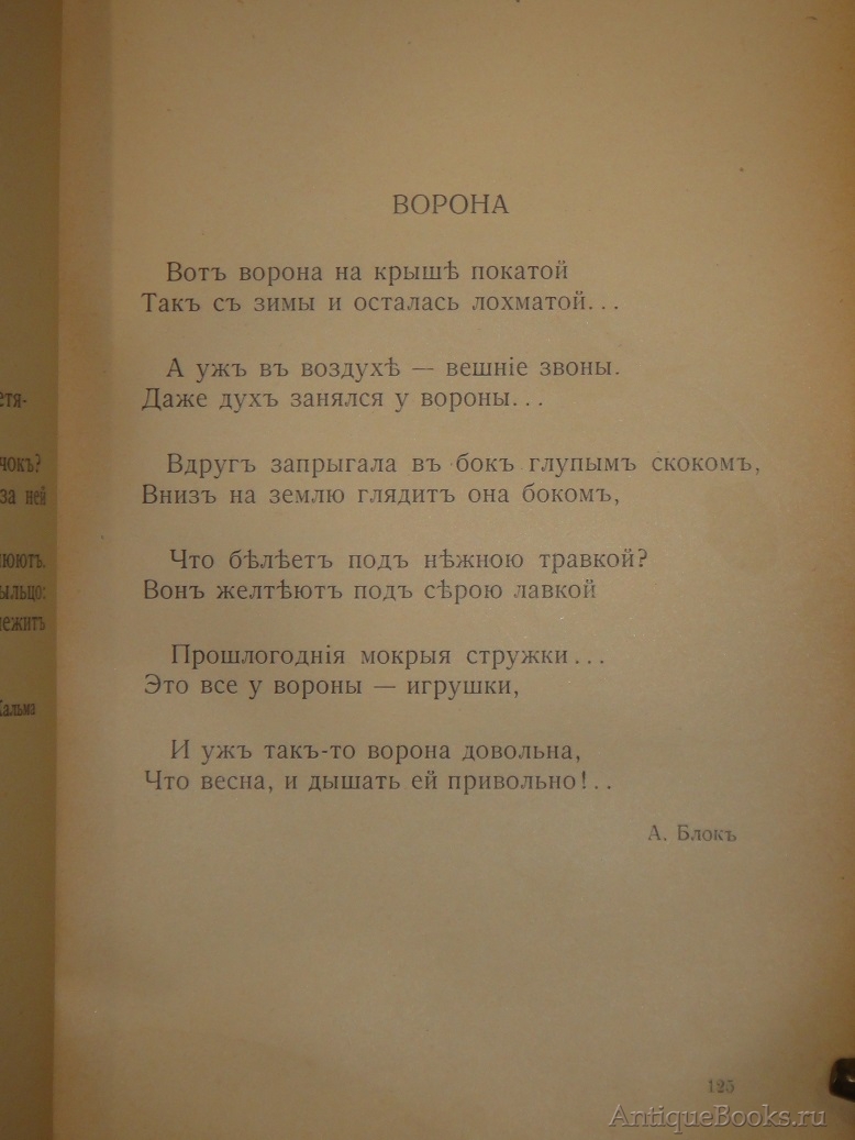 " Перед нами действительно уникальный библиографический артефакт. Это, по сути, антология российской детской поэзии, созданной до 1922 года. Много позже появятся известные всем рождённым в СССР С.Маршак, С.Михалков, К.Чуковский, А.Барто и своими " Кошкиным домом ", " Дядей Стёпой ", " Тараканищем " и " Идёт бычок качается ", а в ту пору российской детворе родители на ночь читали совсем другие стихи. А.Пушкин, М.Лермонтов, В.Жуковский, И.Бунин, В.Набоков, Ф.Сологуб, Е.Баратынский, А.Ахматова, А.Блок, К.Бальмонт, В.Брюсов, А.Фет, А.Майков, Н.Некрасов, А.Плещеев, И.Никитин, Л.Мей, М.Лохвицкая, В.Бенедиктов, Я.Полонский, Н.Языков, А.Дельвиг, Н.Цыганов, Г.Державин, К.Фофанов, Г.Данилевский, Д.Мережковский… Как видим, составитель этого объёмного 400-страничного сборника, поэт Саша Чёрный, не обошёл своим вниманием ни лучших представителей Золотого века отечественной поэзии, ни ярких звёзд века Серебряного. Примечательно, что все они не были детскими поэтами, посвящали юным читателям лишь часть своего творчества. Именно его по крупицам бережно и собрал в эту книгу Саша Чёрный.