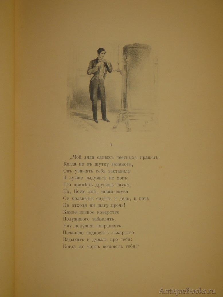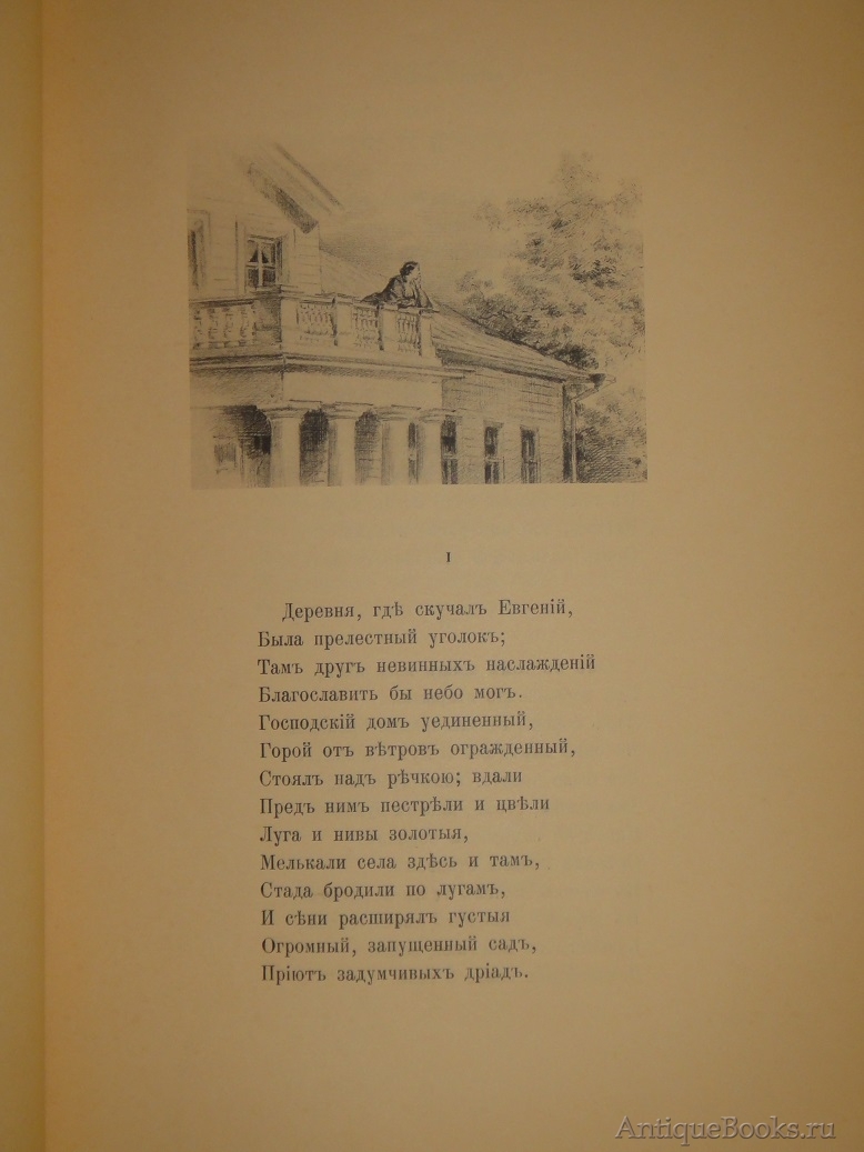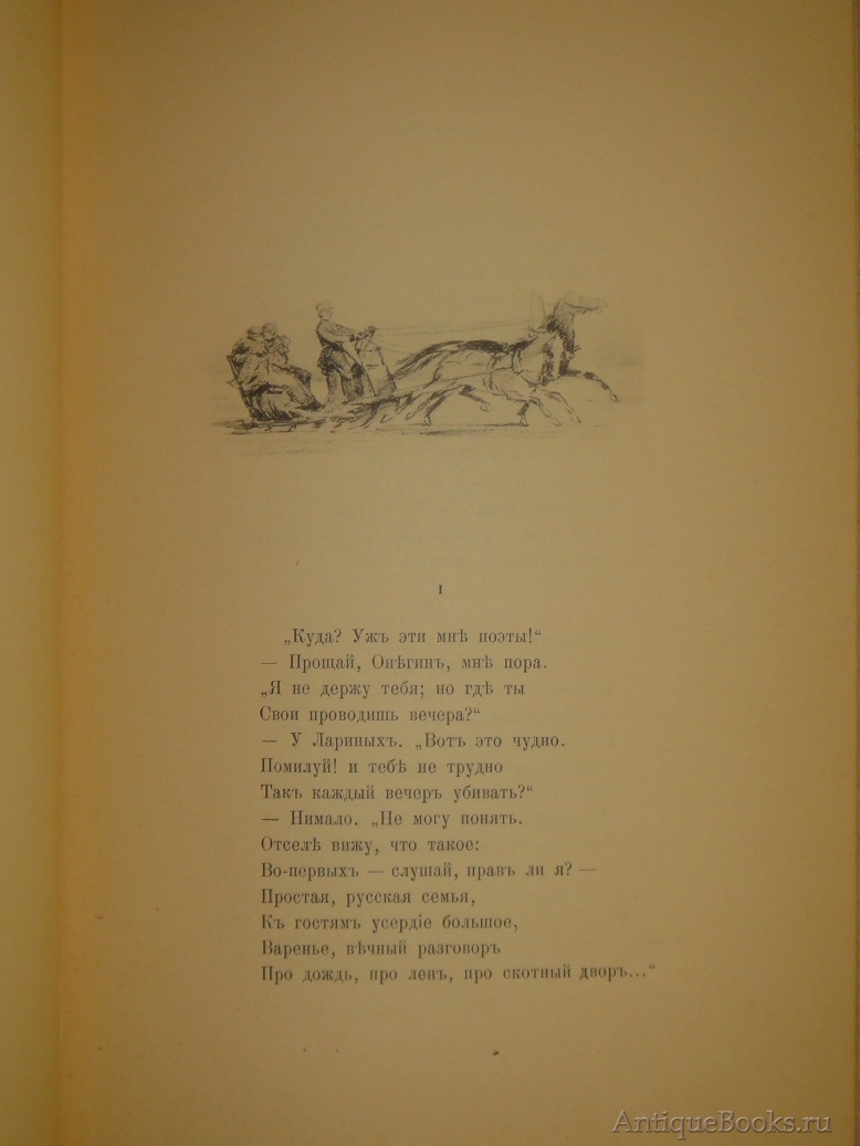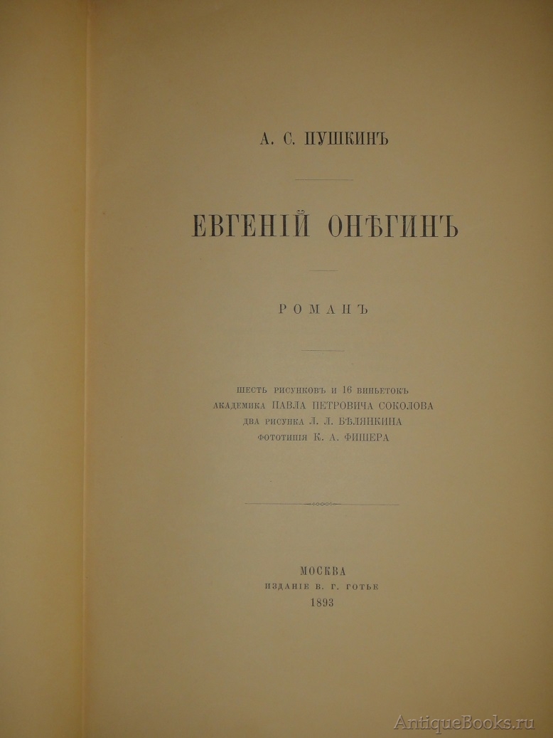 Знаменитое подарочное издание В.Г.Готье 1893 года с иллюстрациями академика живописи Павла Петровича Соколова, а также двумя рисунками художника-миниатюриста и графика Лавра Лавровича Белянкина, выполненными близко к стилю Соколова. Предыстория его появления на свет такова: различные издатели давно мечтали выпустить иллюстрированное издание " Евгения Онегина ", но чрезвычайно трудно было найти художника, который бы выполнил иллюстрации столь же точно, как и сам роман, передающие дух эпохи, адекватно отражающие настроение произведения, его характеры - всё то, что так дорого в нём каждому читателю. Задача была почти невыполнима, поскольку не было иллюстраций, современных пушкинской эпохе, и тем сложнее было их создать, чем дальше эта эпоха уходила в прошлое.