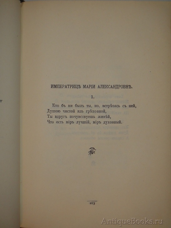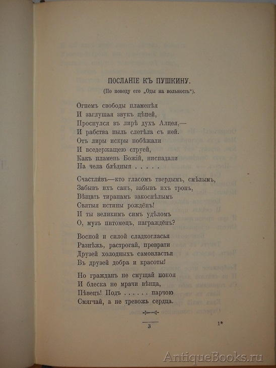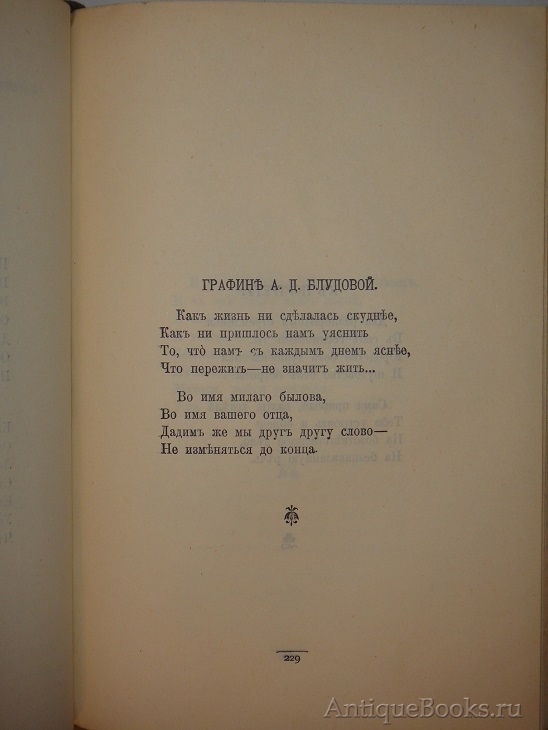 На фронтисписе на веленевой бумаге помещён страничный погрудный портрет автора, выполненный в Артистическом заведении Товарищества А.Ф.Маркс в СПБ. Далее, на жёлтой вержированной бумаге, двухстороннее факсимильное воспроизведение стихотворений: " Святая ночь " ( " Святая ночь на небосклон взошла " ) и " Пророчество " ( " Не гул молвы прошёл в народе " ).