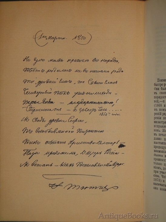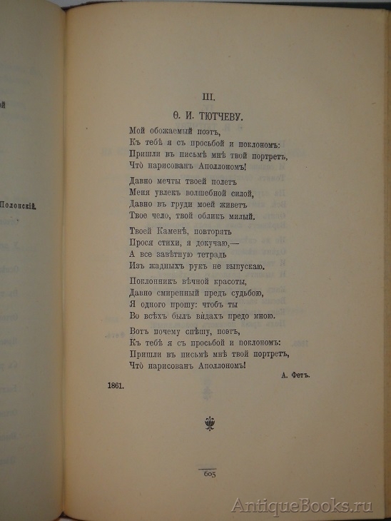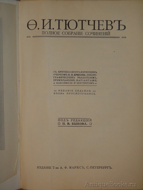 "Полное собрание сочинений Ф.И.Тютчева с критико-биографическим очерком В.Я.Брюсова, библиографическим указателем, примечаниями, вариантами, факсимиле и портретом" Фёдор Тютчев С.-Петербург, Издание Товарищества А.Ф.Маркс, 1912г.