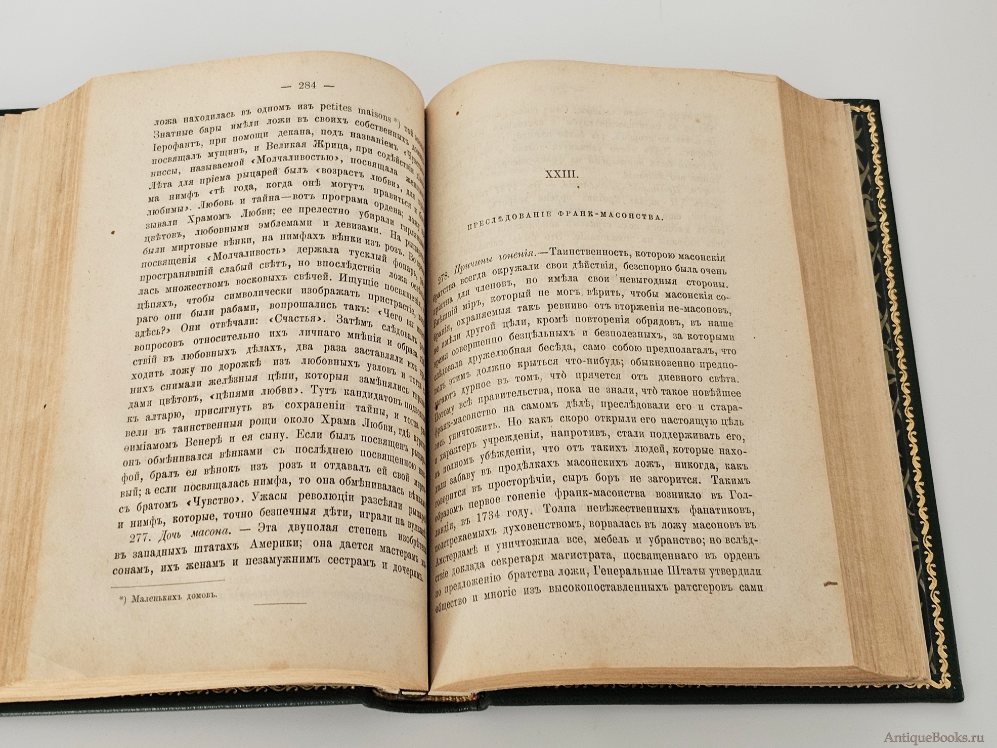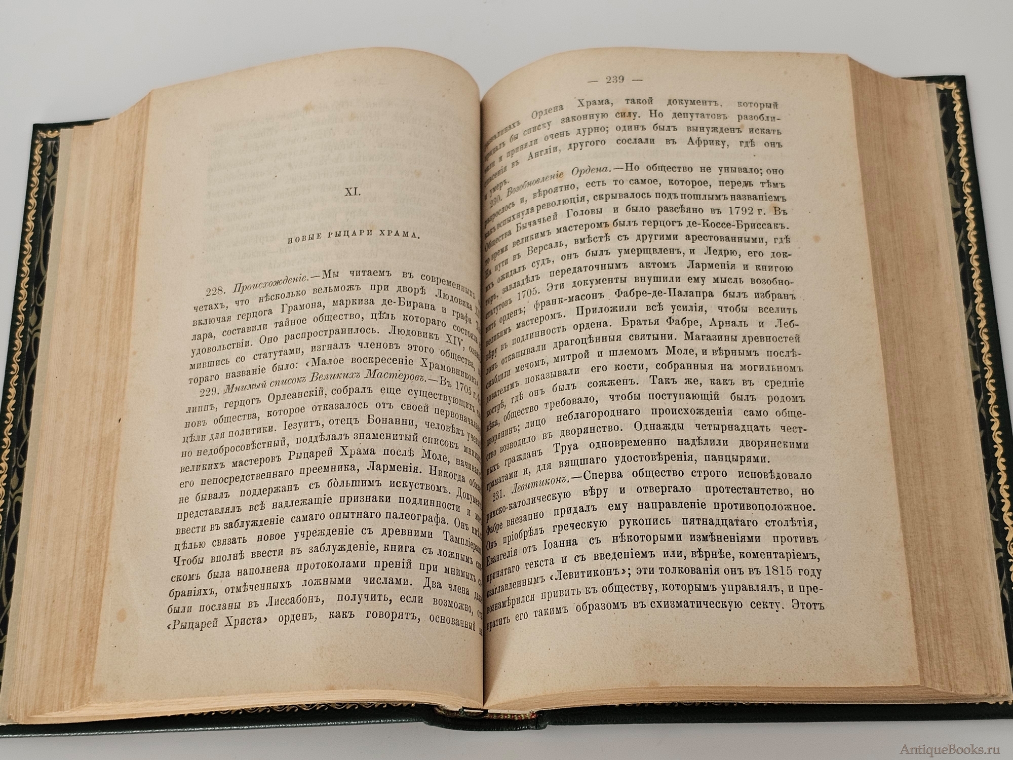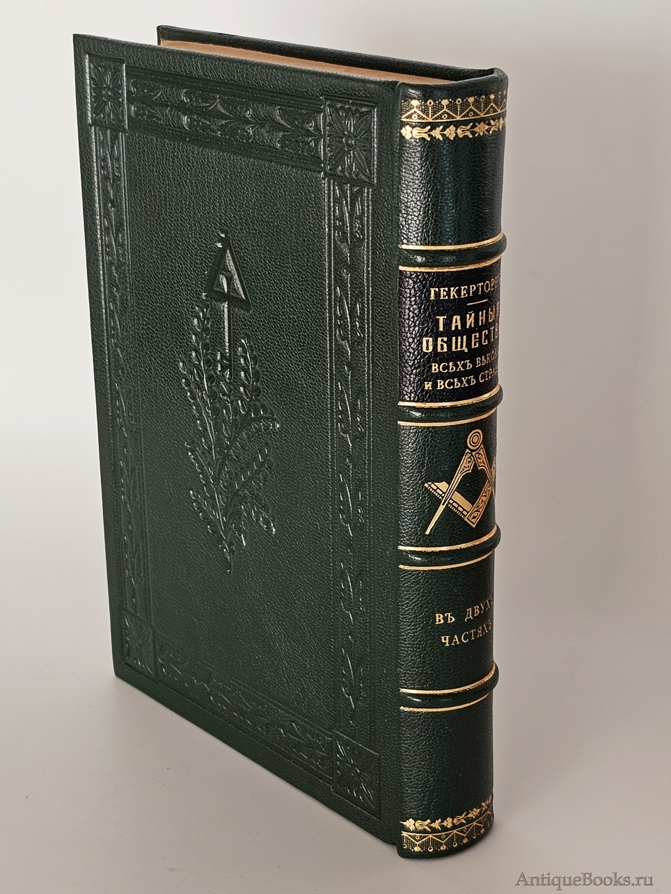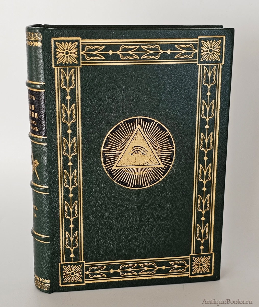 Экземпляр в современном цельнокожаном переплёте. Корешок украшен известным масонским символом - циркуль с линейкой, на крышке переплета изображен масонский символ, символизирующий Великого Архитектора Вселенной - всевидящее око (глаз, вписанный в треугольник). Труд состоит из двух томов. Т.1: 304 стр., т.2: 250 стр. Формат: 22 x 16,5 см. Полный комплект двух частей в одном переплете. Редкость.