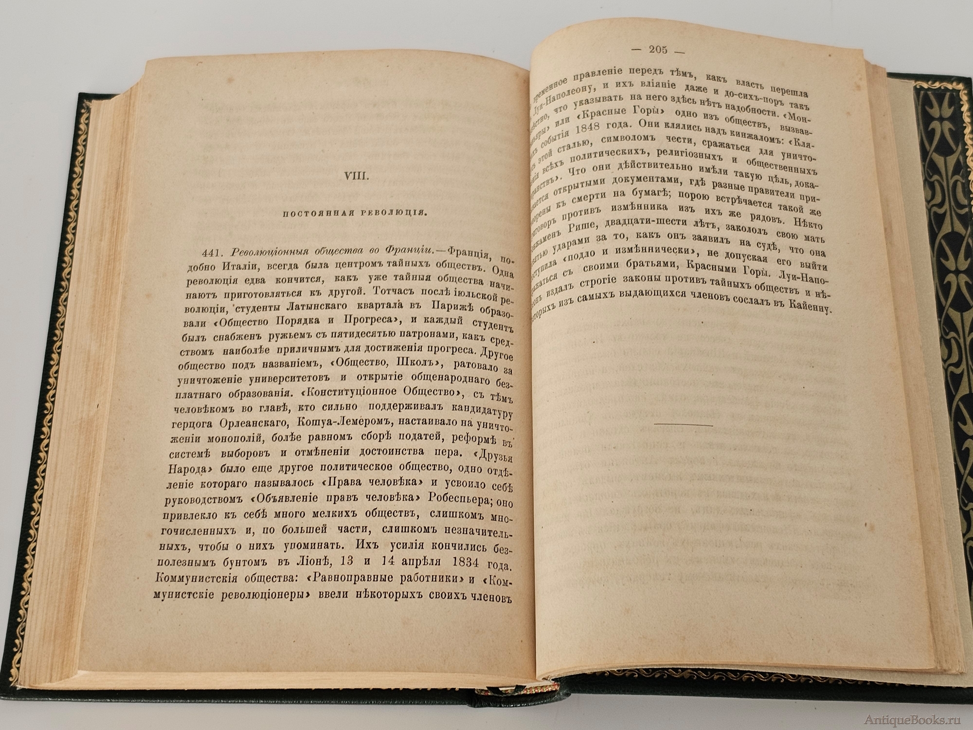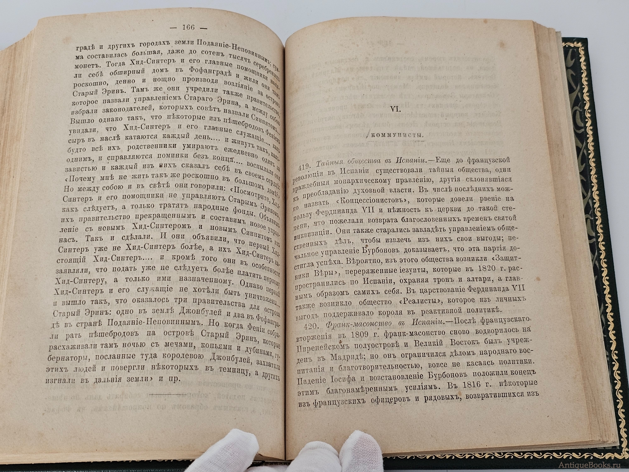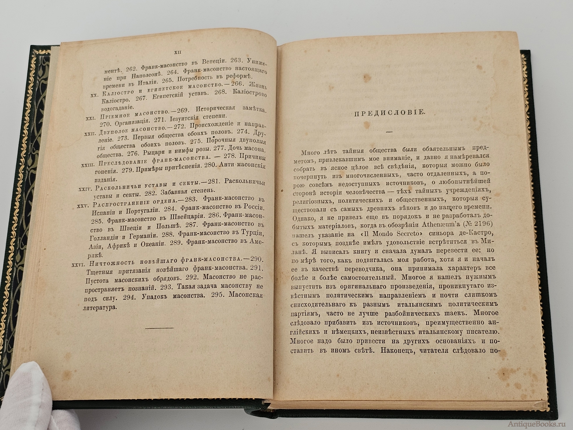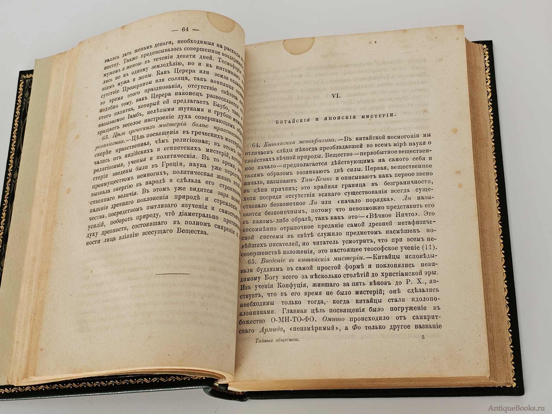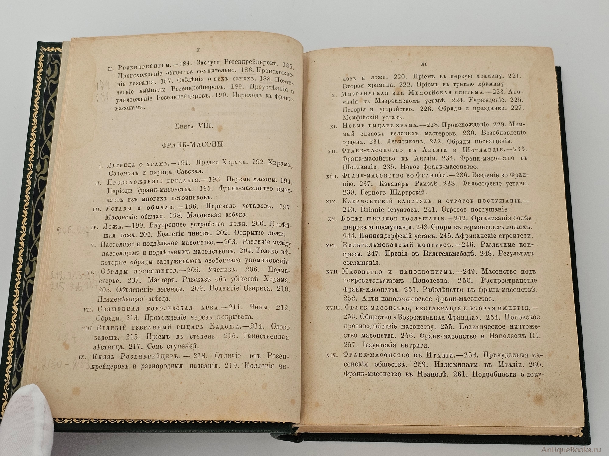 Экземпляр в современном цельнокожаном переплёте. Корешок украшен известным масонским символом - циркуль с линейкой, на крышке переплета изображен масонский символ, символизирующий Великого Архитектора Вселенной - всевидящее око (глаз, вписанный в треугольник). Труд состоит из двух томов. Т.1: 304 стр., т.2: 250 стр. Формат: 22 x 16,5 см. Полный комплект двух частей в одном переплете. Редкость.