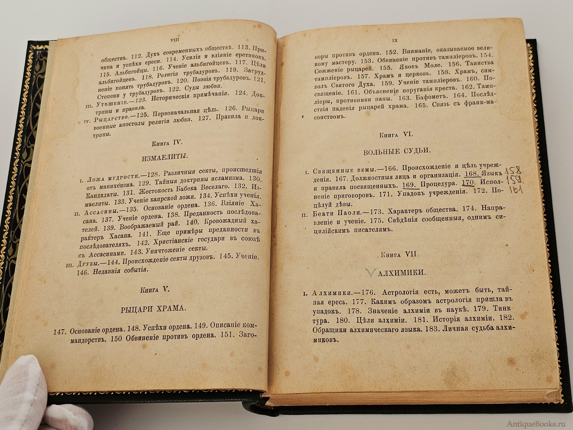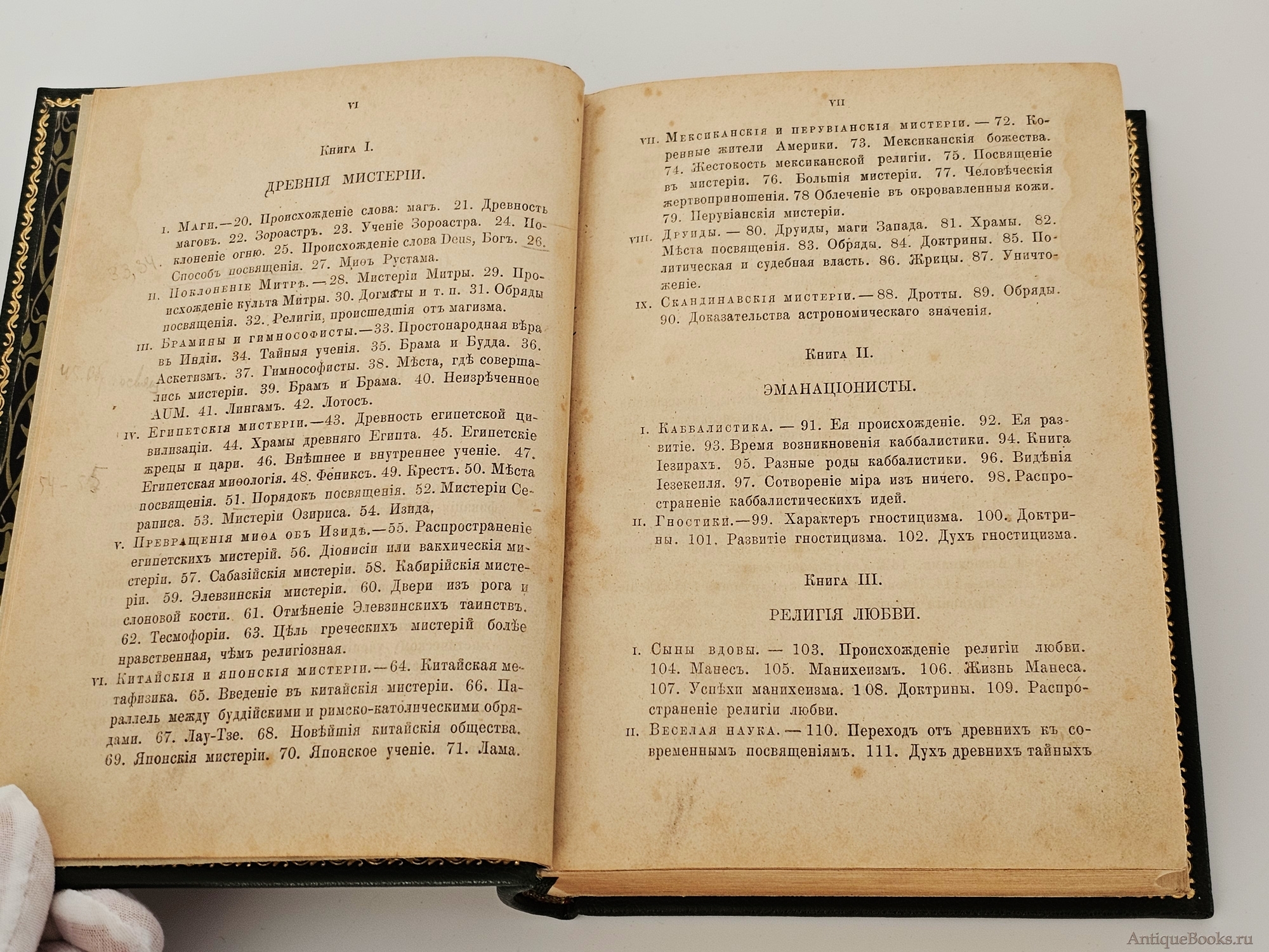 Часть I посвящена древней мистерии, в ней рассказывается о магах, поклонении Митре, браминах и гимнософистах, египетских, китайских, японских, мексиканских, перуанских, скандинавских мистериях, друидах. Кн. II рассказывает об эманационистах, здесь речь идет о кабалистике и гностиках. Кн. III посвящена религии любви, кн. IV — измаелитам, кн. V — рыцарям храма, кн. VI — вольным судьям, кн. VII — алхимикам, кн. VIII — франкмасонам.