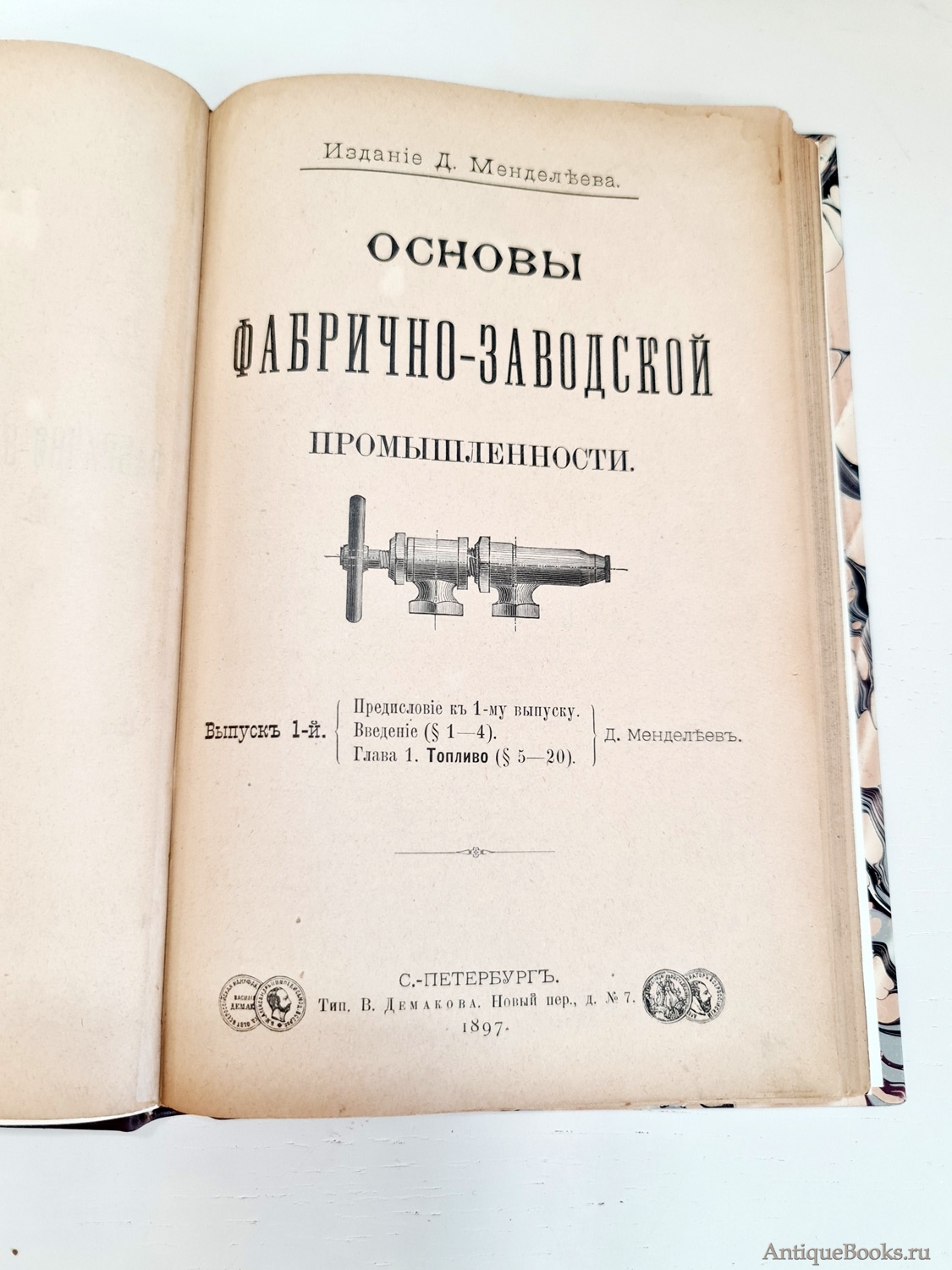 «Основы фабрично‑заводской промышленности», выпуск 1, изданный в 1897 году в Санкт‑Петербурге, принадлежит перу выдающегося русского учёного Дмитрия Ивановича Менделеева (1834–1907). Книга напечатана в типографии В. Демакова как издание самого Менделеева. Объём работы — [4], 196 страниц, формат: 23х16х1,5 см. Редкость.
