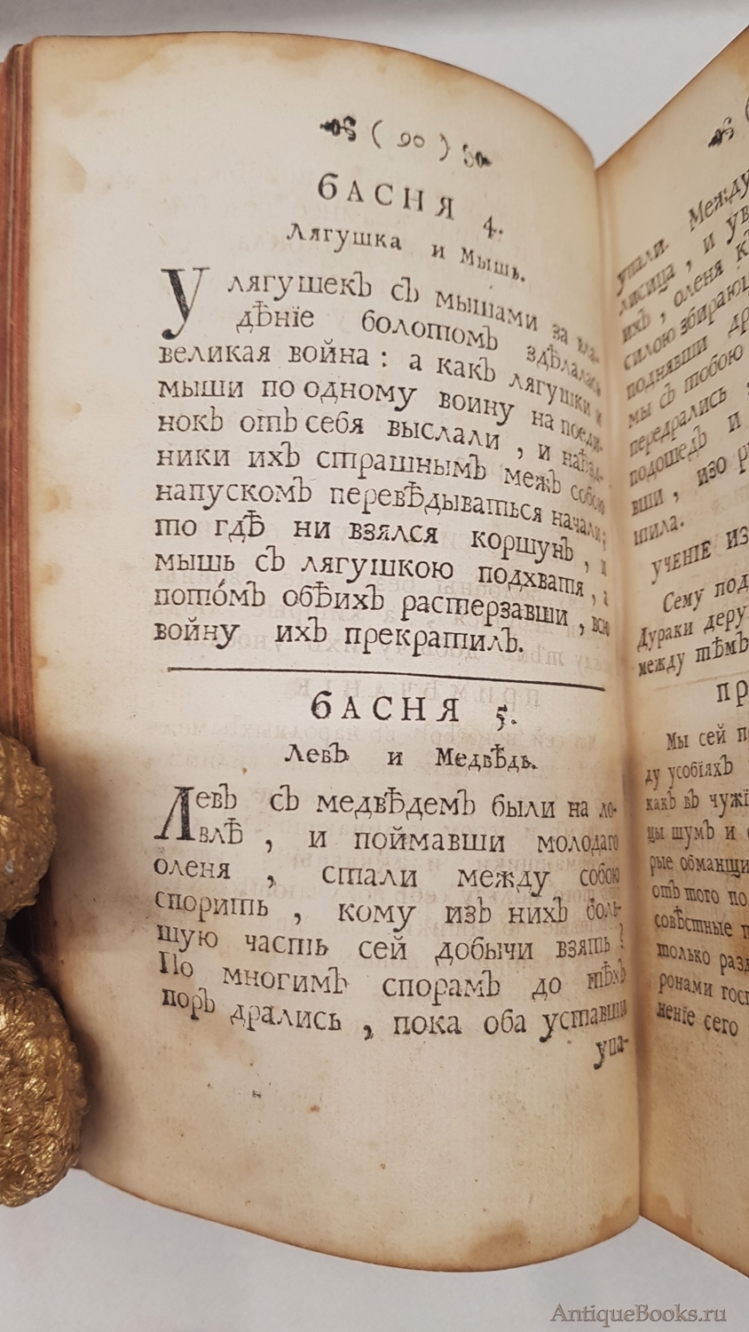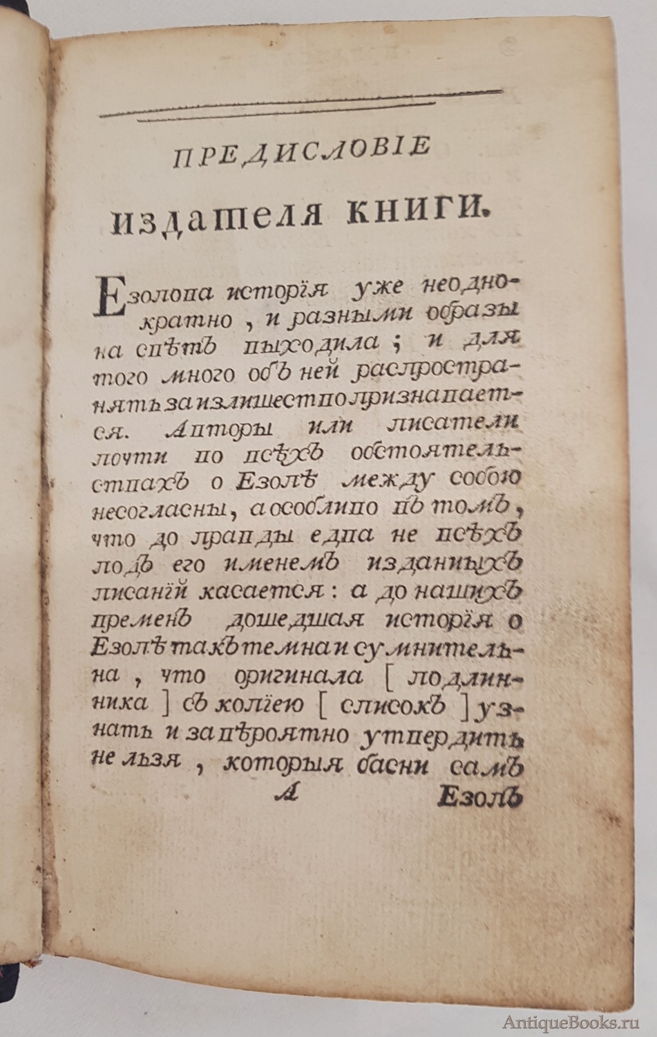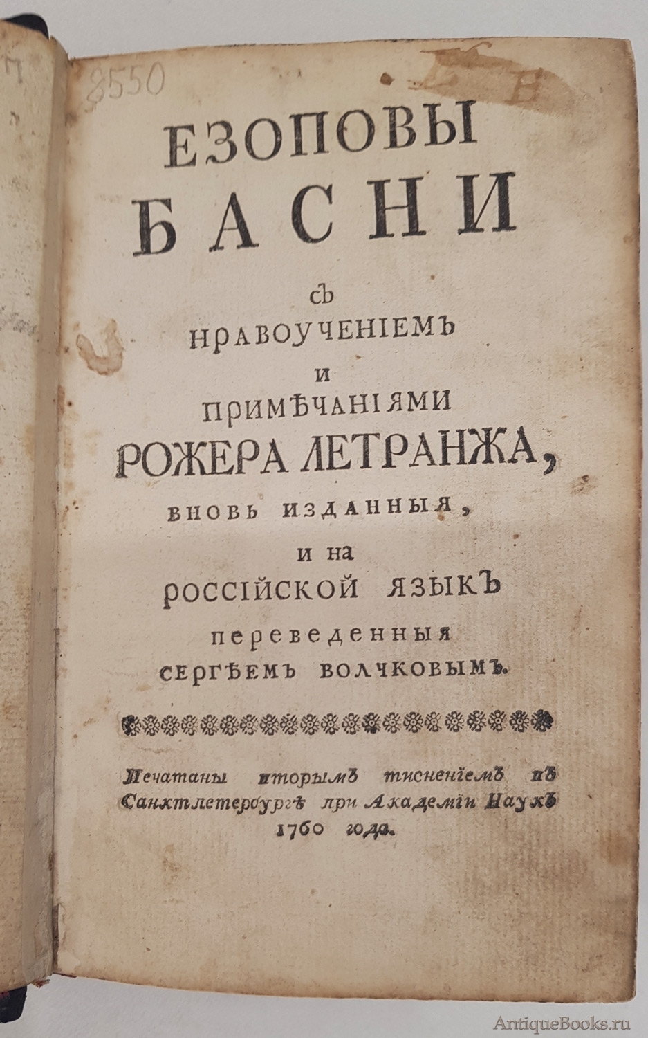 Фотографии предлагаемого издания "Езоповы басни с нравоучением и примечаниями Рожера Летранжа". Эзоп. в Санктпетербурге При Академии наук, 1760 г.
