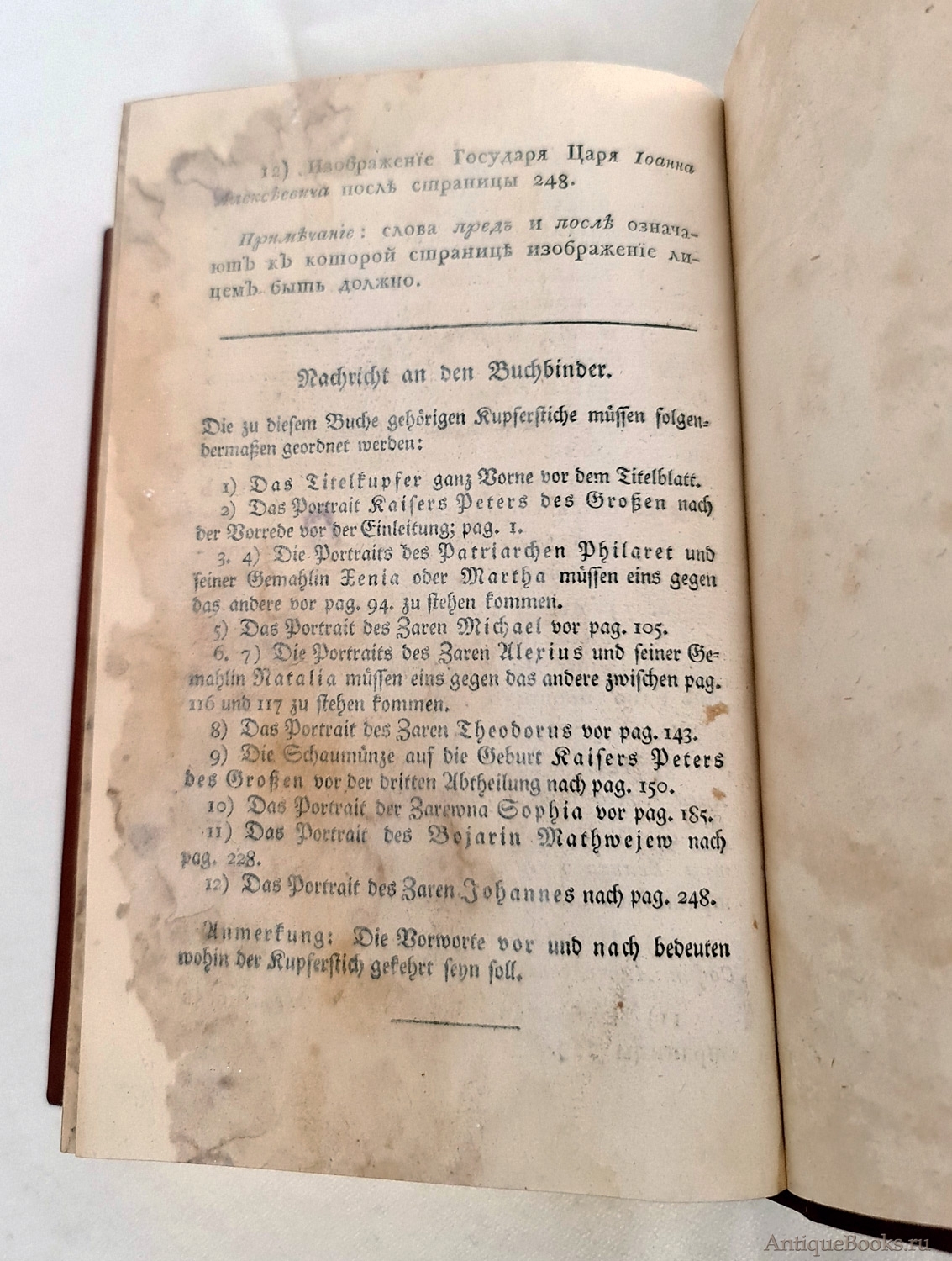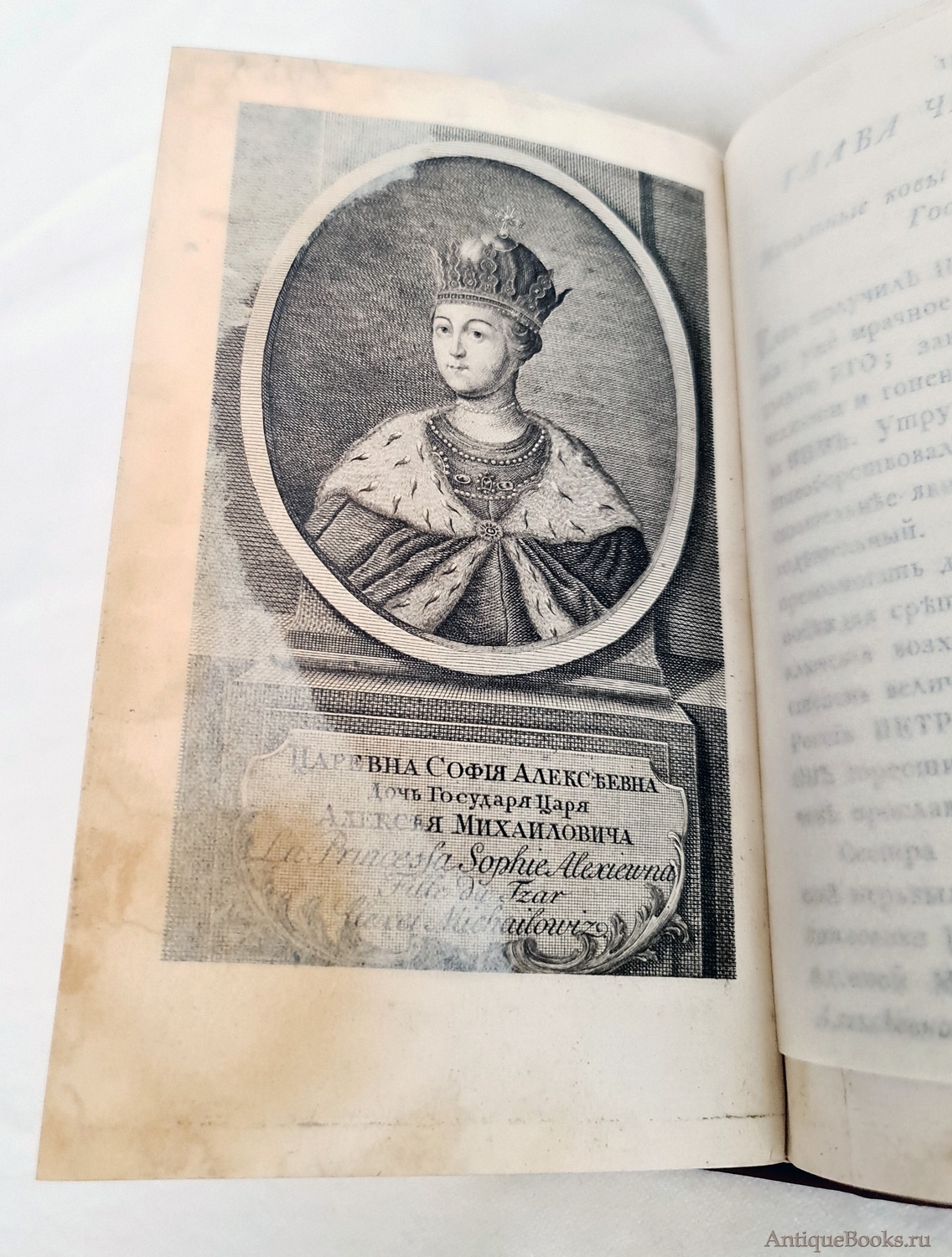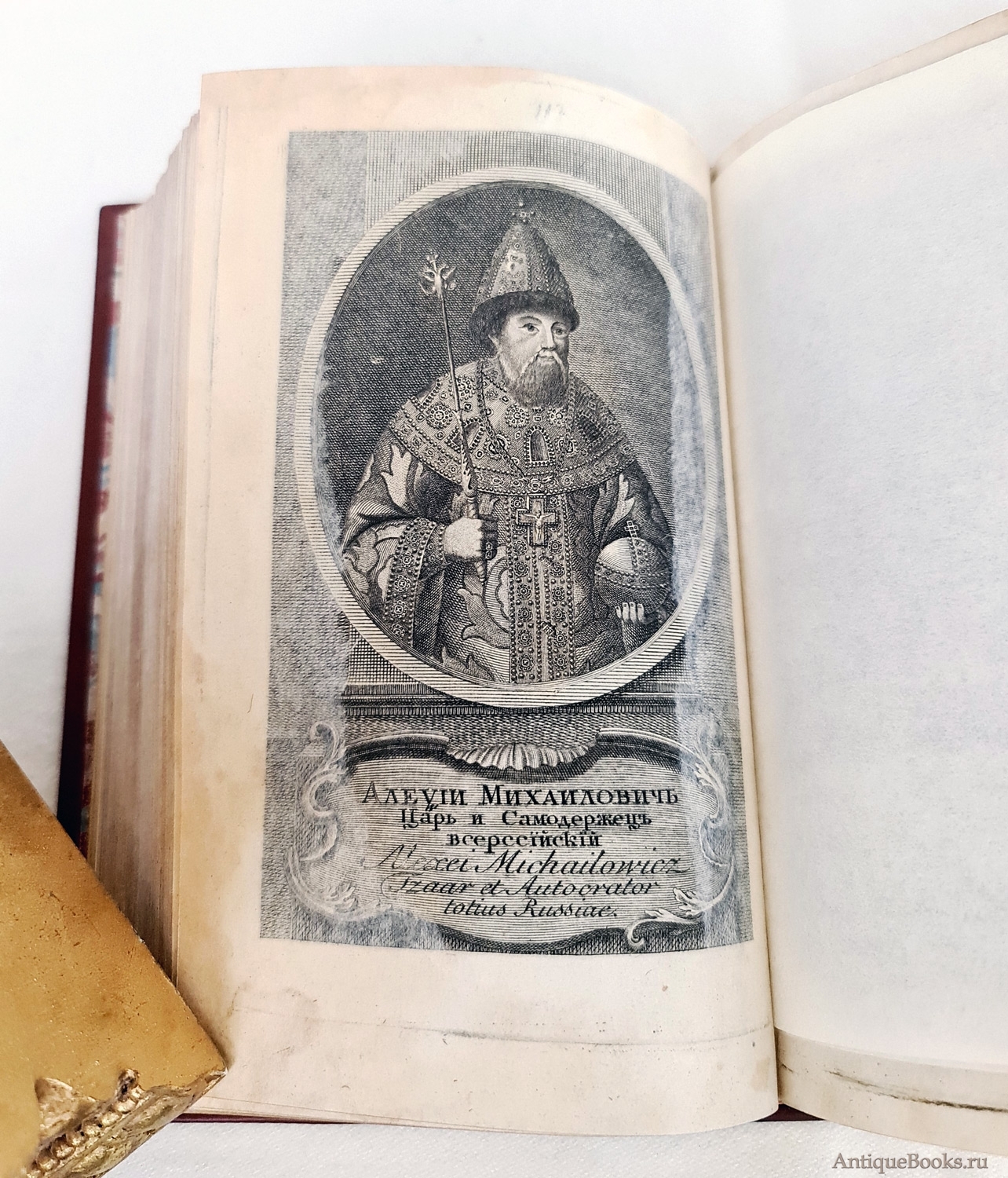 Иллюстрации, портреты: императора Петра I с подписью: "Вырезан с подлинника хранящагося у его сиятельства графа Ивана Григорьевича Чернышева"; патриарха Филарета (а также на виньетке на с.97); инокини Марфы ; царя Михаила Федоровича; царя Алексея Михайловича; царицы Наталии Кирилловны; царя Федора Алексеевича; царевны Софьи Алексеевны; боярина А.С. Матвеева; царя Ивана V Алексеевича. С разных оригиналов. На отдельном листе изображение медали на рождение Петра I, на лицевой стороне которой портрет царя Алексея Михайловича и царицы Наталии Кирилловны. Резцовая гравюра (портрет царя Иоанна Алексеевича - гравюра резцом и пунктиром).