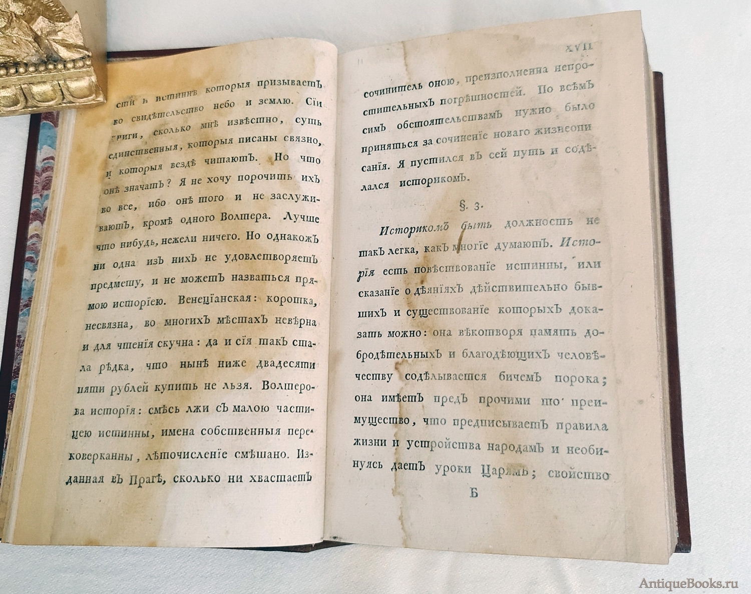 В цельнокожаном переплете первой половины XIX века с художественным золотым тиснением на корешке и крышке. С золотым трехсторонним обрезом. 10 гравированных портретов исторических лиц на отдельных листах. Формат: 20x13,5см. Загрязнения, реставрация страниц японской бумагой. Личный штемпель "Из библиотеки К.Я. Голейзовского" (Касьян Ярославович Голейзовский (1892-1970) — один из крупнейших российских и советских хореографов, балетмейстер Большого театра. Сотрудничал с Д.Д. Шостаковичем, Л.О. Утесовым, И.Д. Дунаевским. Ставил танцы великим танцорам балета Е. Максимовой и В. Васильеву.)