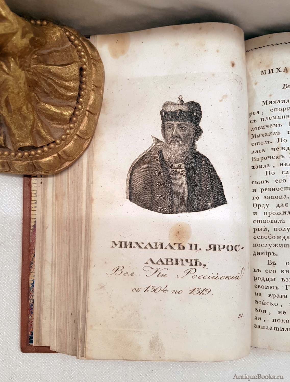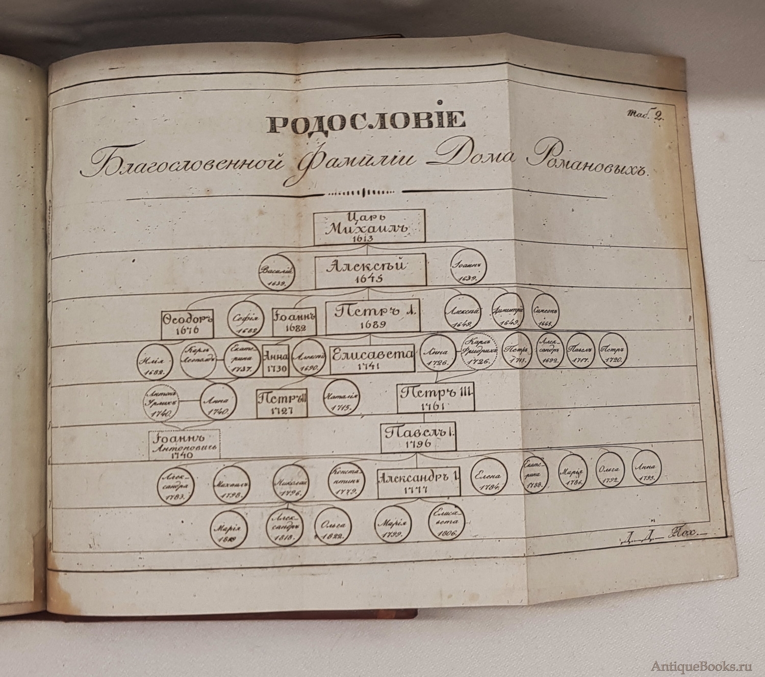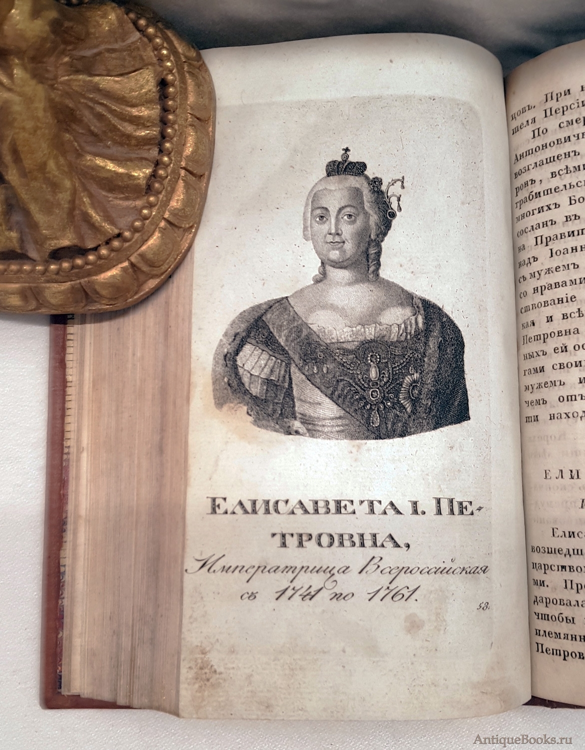 Экземпляр в цельнокожаном переплёте первой половины XIX Века, с художественным золотым тиснением на бинтовом корешке и крышках. Крышки обрамлены орнаментированными блинтовыми рамками. Тройной золотой обрез! Издание украшено 62 гравированными полностраничными портретами Великих Государей, выполненных пунктиром и резцом одним из самых талантливых гравёров первой трети XIX века А.Афанасьевым. Под каждым портретом дано имя "державного правителя" и годы его царствования. 183 стр, 65 л. портретов, 2 родословные таблицы Романовых, 1 большая карта. Полный комплект. Формат 20х12,9 см. На части книги имеется залитие маслом. Книга очень редкая, особенно в полной комплектности.