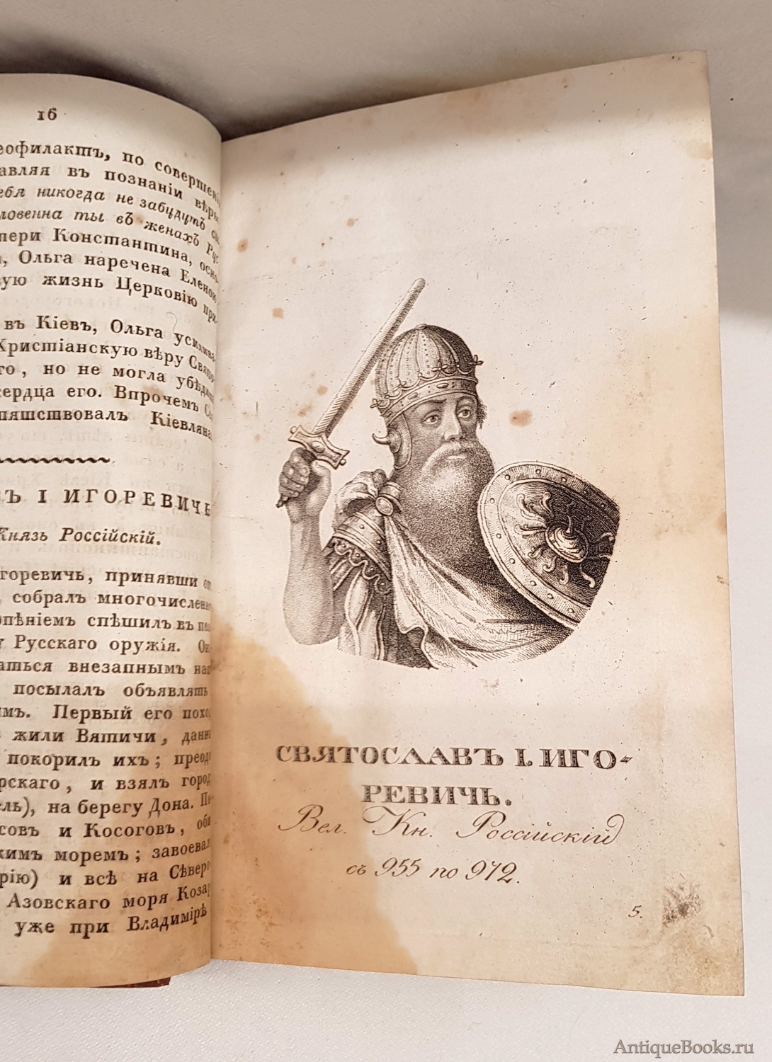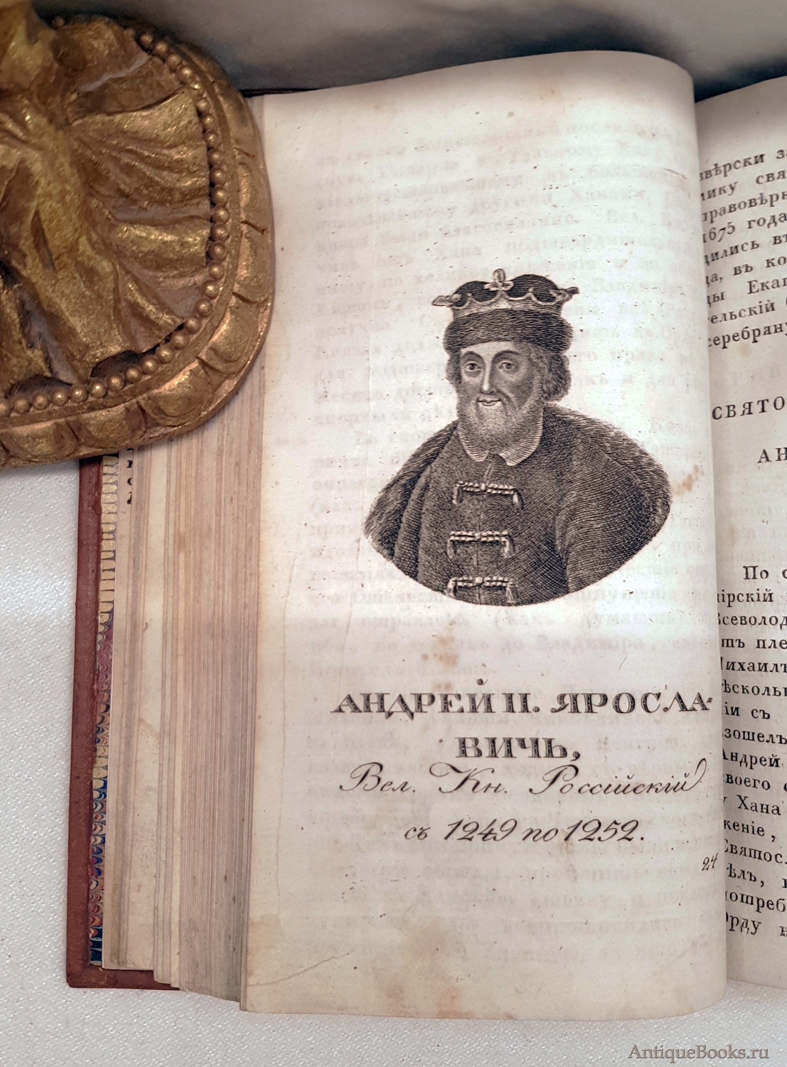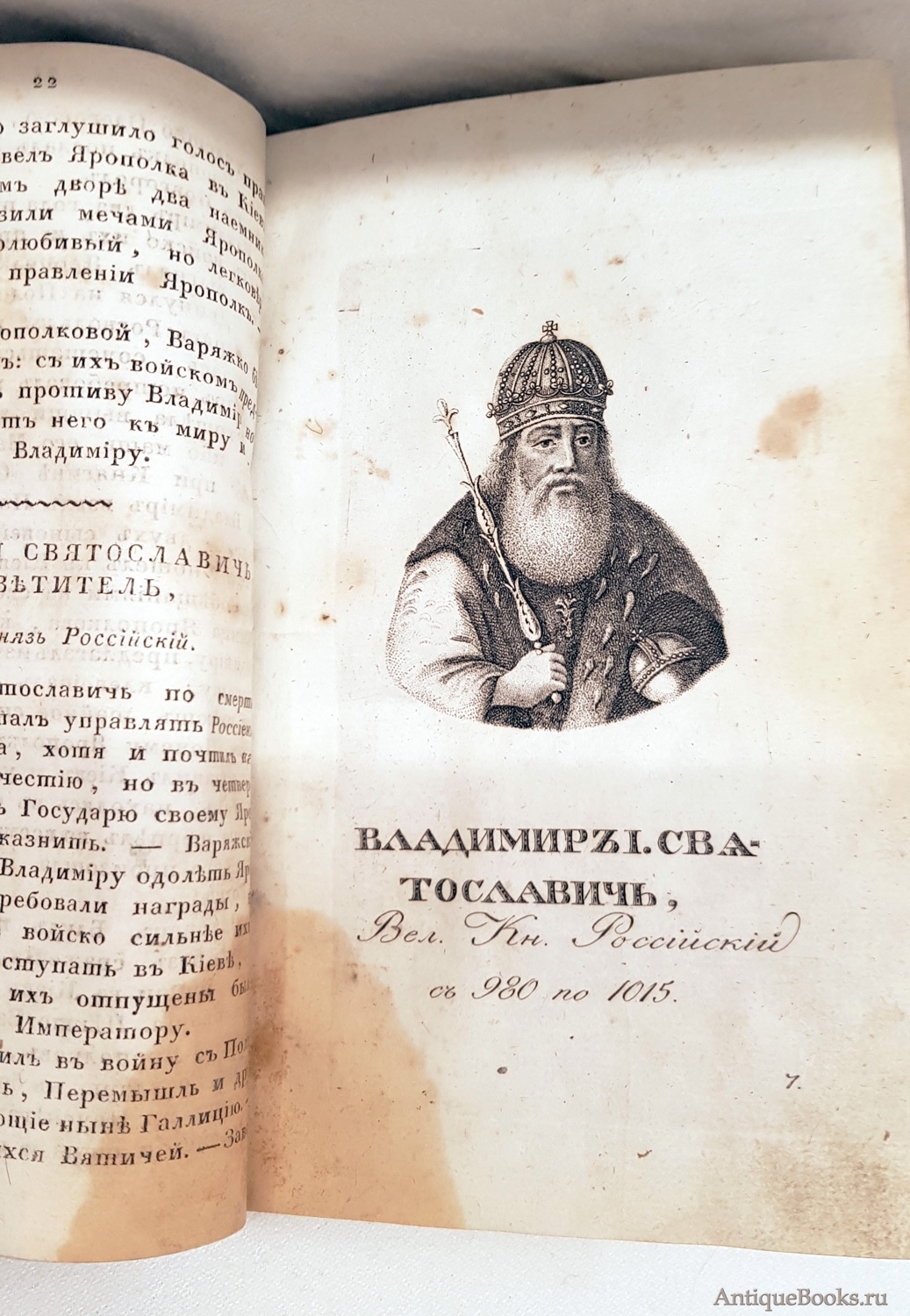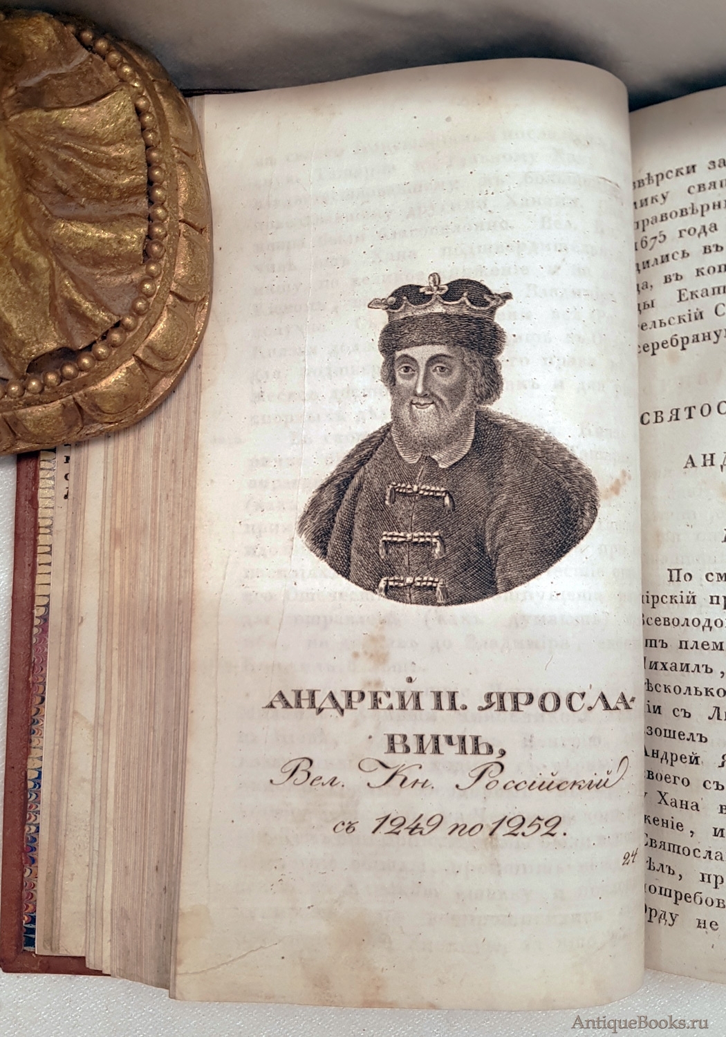 Экземпляр в цельнокожаном переплёте первой половины XIX Века, с художественным золотым тиснением на бинтовом корешке и крышках. Крышки обрамлены орнаментированными блинтовыми рамками. Тройной золотой обрез! Издание украшено 62 гравированными полностраничными портретами Великих Государей, выполненных пунктиром и резцом одним из самых талантливых гравёров первой трети XIX века А.Афанасьевым. Под каждым портретом дано имя "державного правителя" и годы его царствования. 183 стр, 65 л. портретов, 2 родословные таблицы Романовых, 1 большая карта. Полный комплект. Формат 20х12,9 см. На части книги имеется залитие маслом. Книга очень редкая, особенно в полной комплектности.