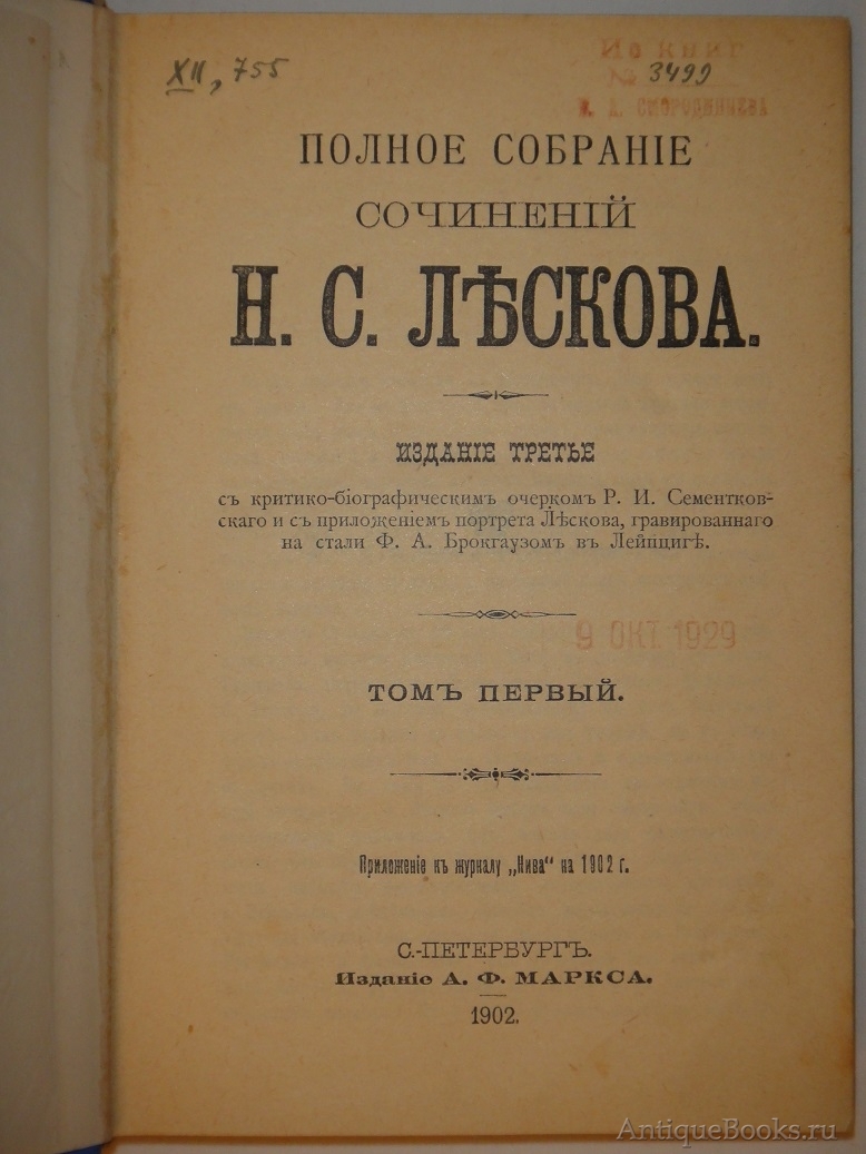 Том 1. Критико-биографический очерк Р.И.Сементковского " Николай Семенович Лесков ". - Соборяне. ( Хроника ). Часть 1. 1902. 189 стр.; один лист портрет.