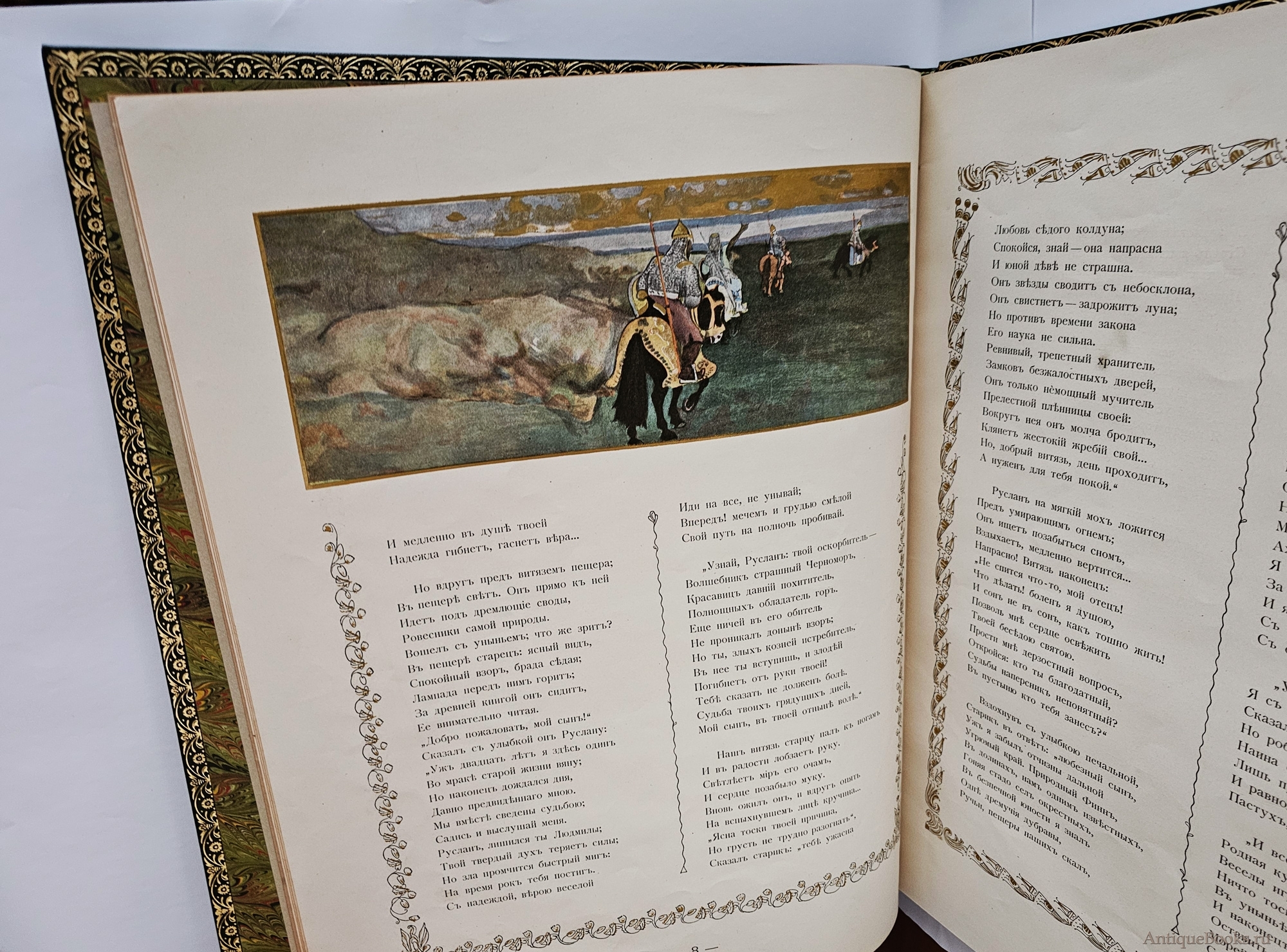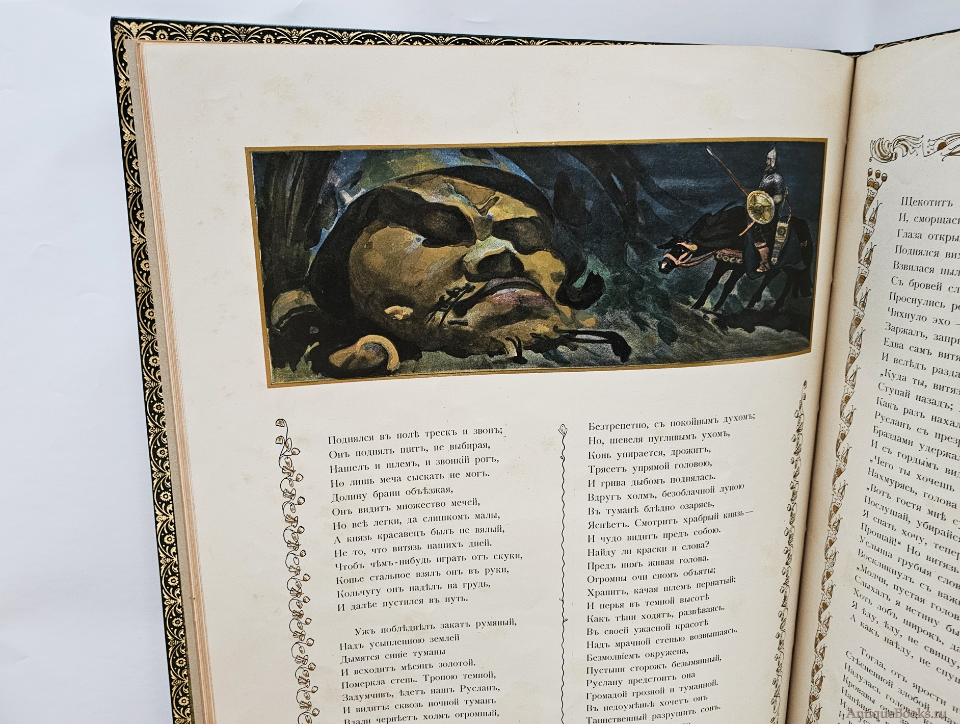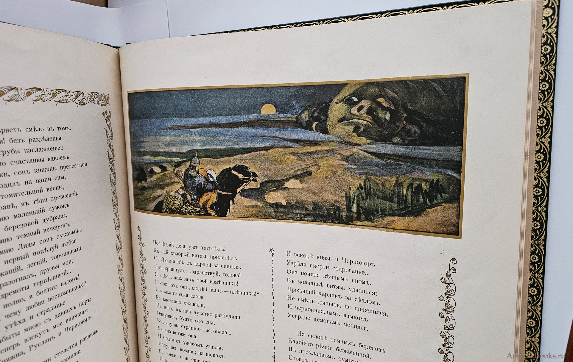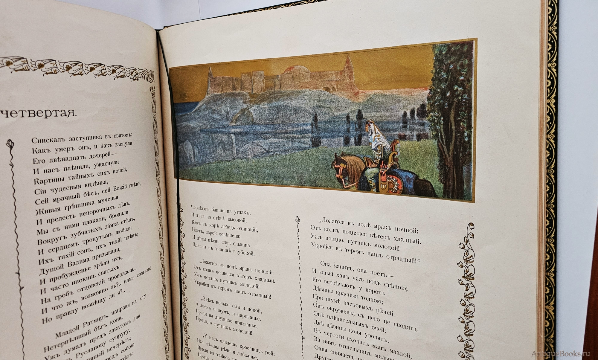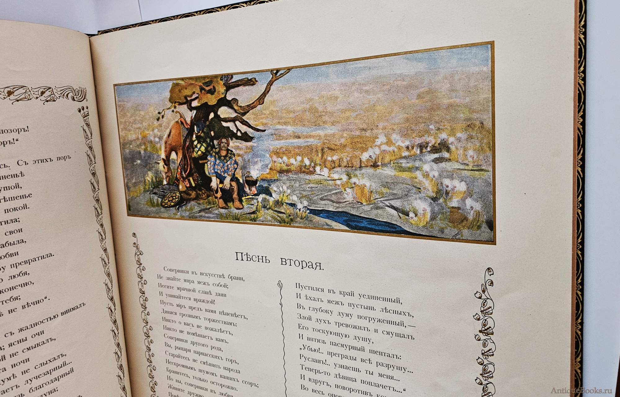 А.С. ПушкинИздание «Руслан и Людмила» А. С. Пушкина 1899 года от издательства А. И. Мамонтова — это юбилейное издание, приуроченное к 100-летию со дня рождения поэта. Книга выделяется богатым оформлением и иллюстрациями известного художника Сергея Васильевича Малютина.Цена: 180 000 руб.