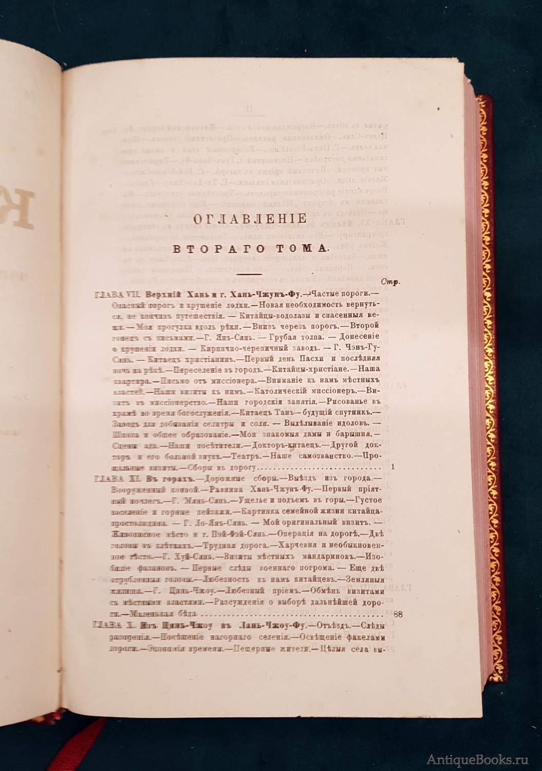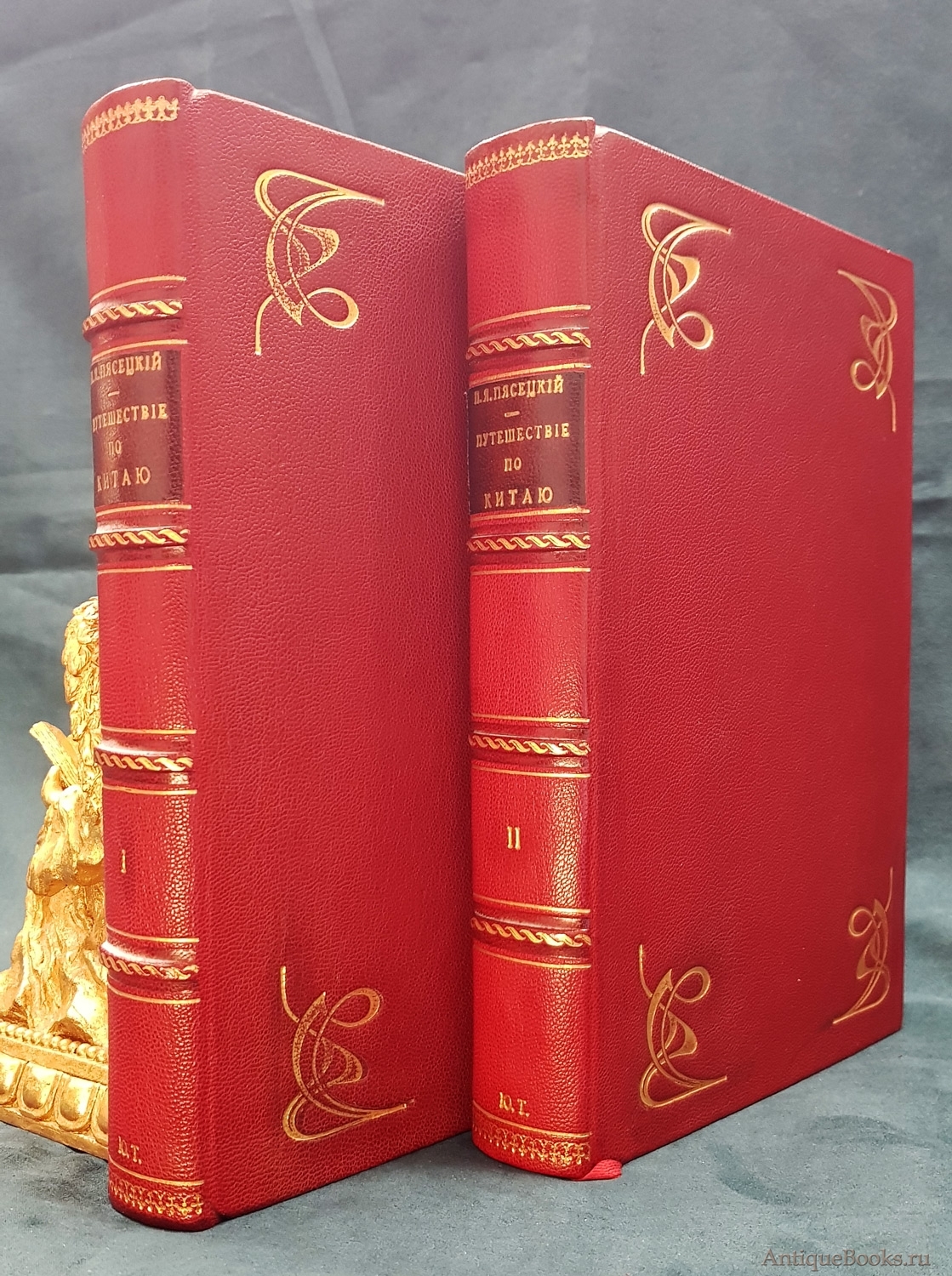 Два тома в красивых цельнокожаных переплетах красного цвета с золотым тиснением орнамента на уголках крышки. Золототисненная дублюра, ляссе. В очень хорошем состоянии.