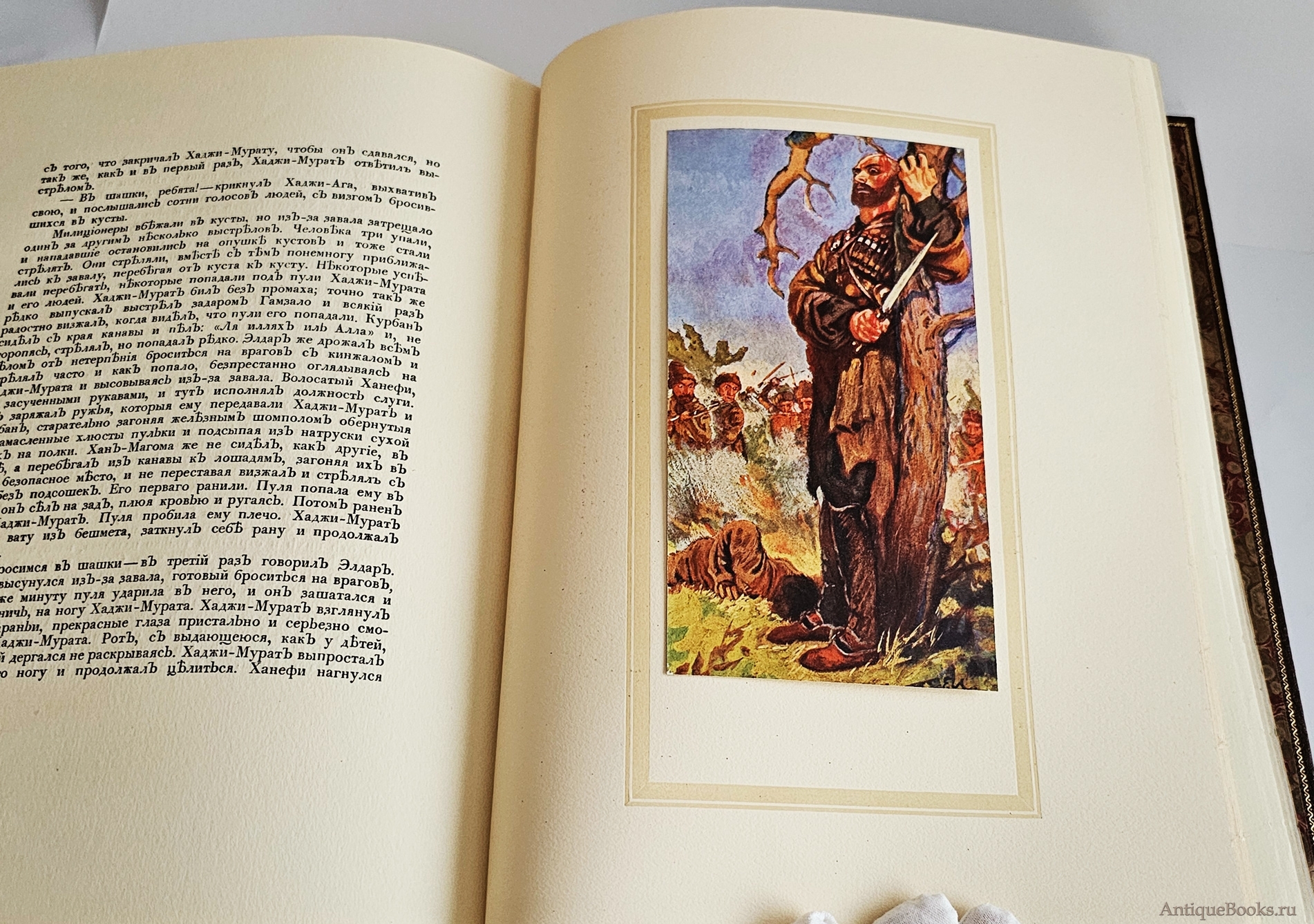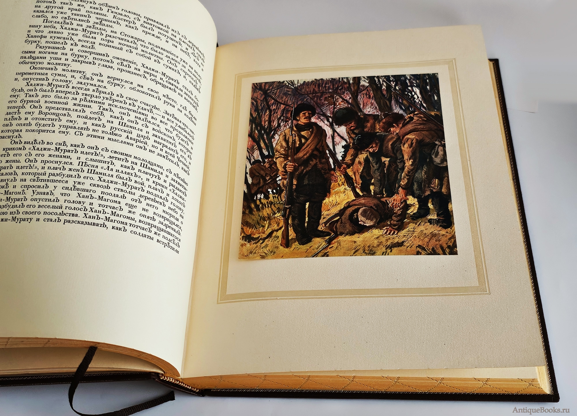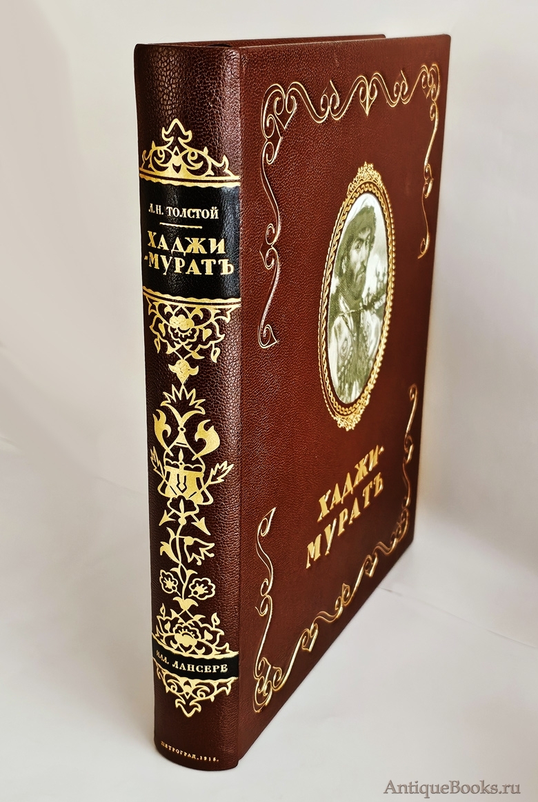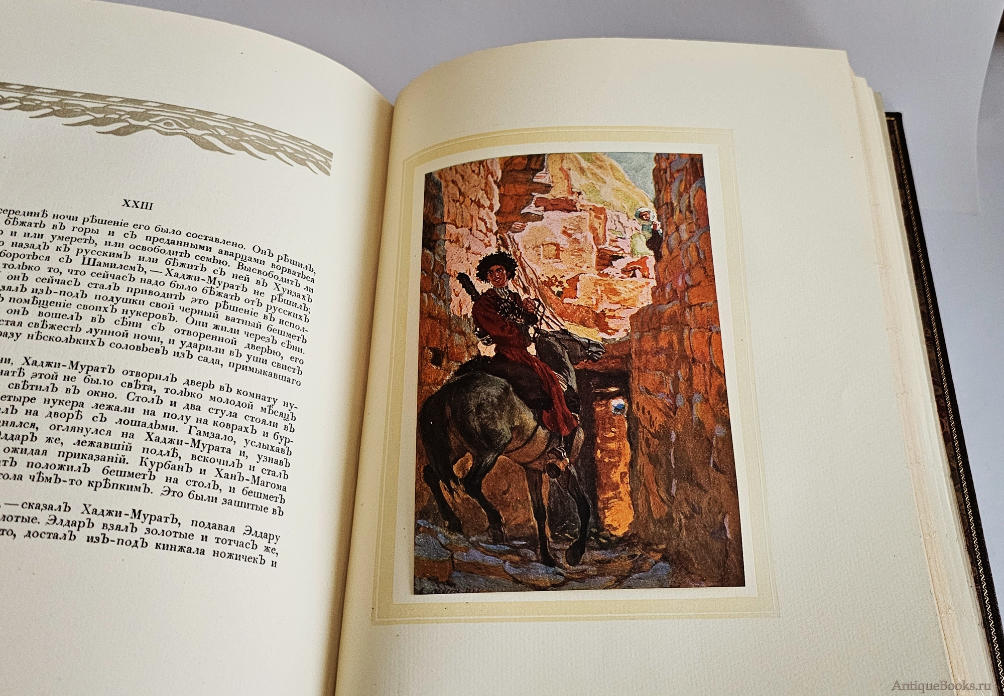 Антикварная книга в красивом современном цельнокожаном переплете с инкрустацией. На верхней крышке переплета - портрет Хаджи-Мурата, героя повести Л.Н.Толстого. Роскошное золотое тиснение по корешку. Золотой обрез с сеточкой. XXXII+162+XIII+[1] стр. Форзацы и золотая дублюра. Книга большого подарочного формата: 31x24 см. Качественная плотная вержированная бумага. С иллюстрациями выдающегося художника Е.Е. Лансере. Чистый красивый и редкий экземпляр.