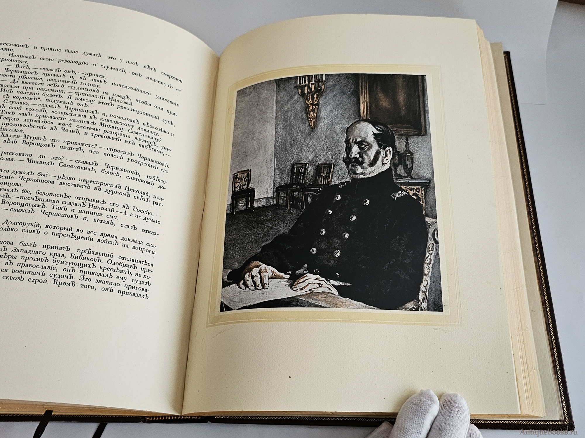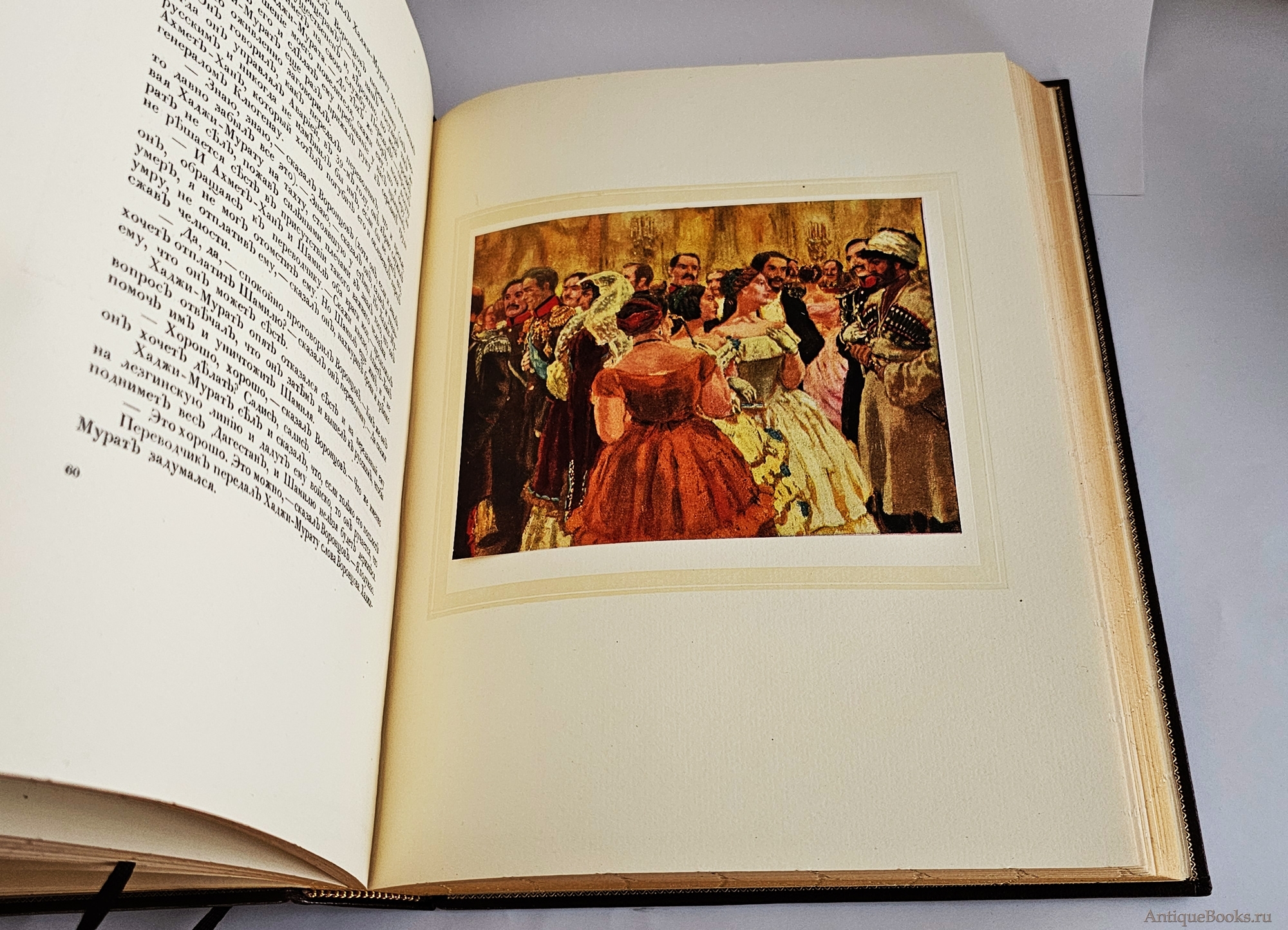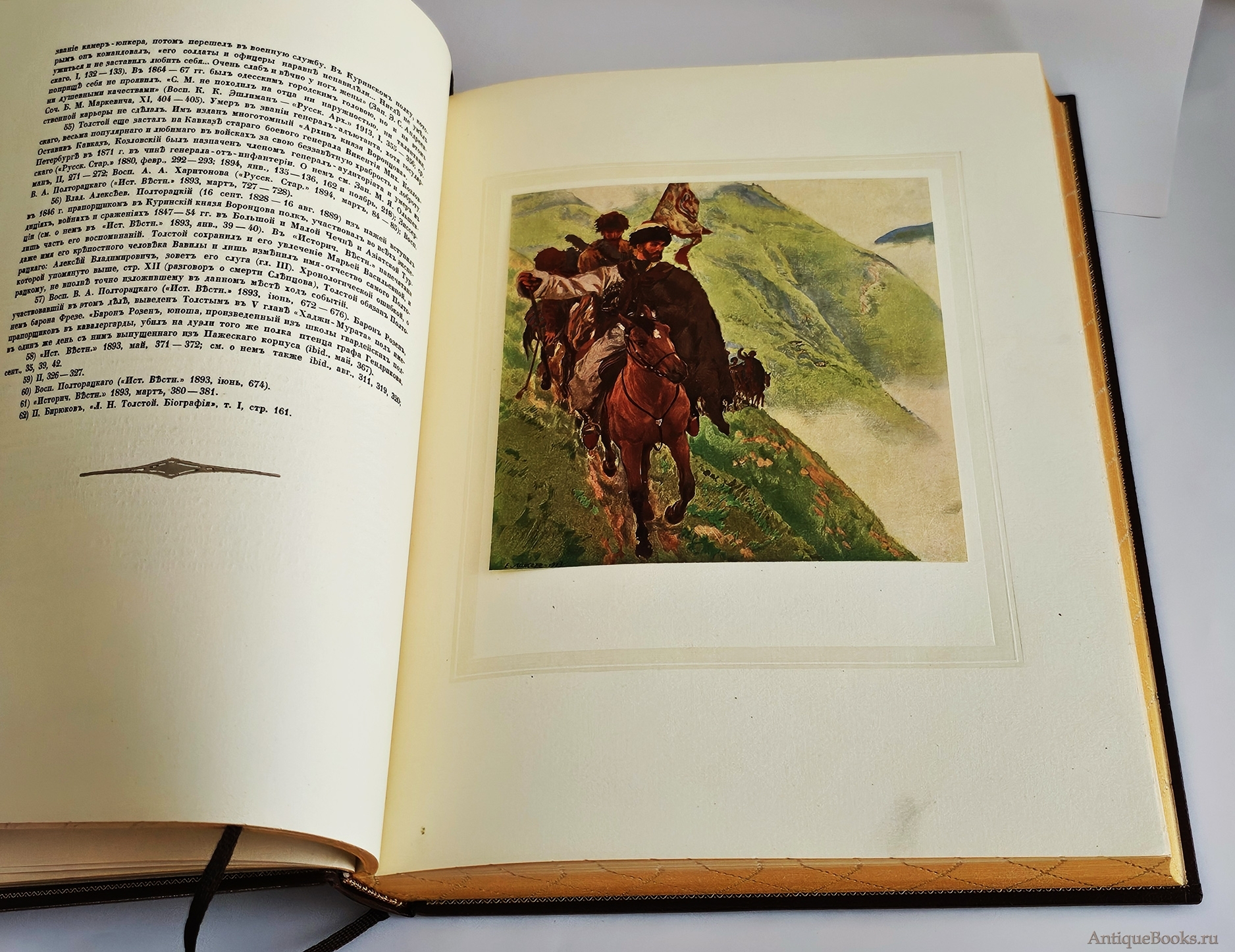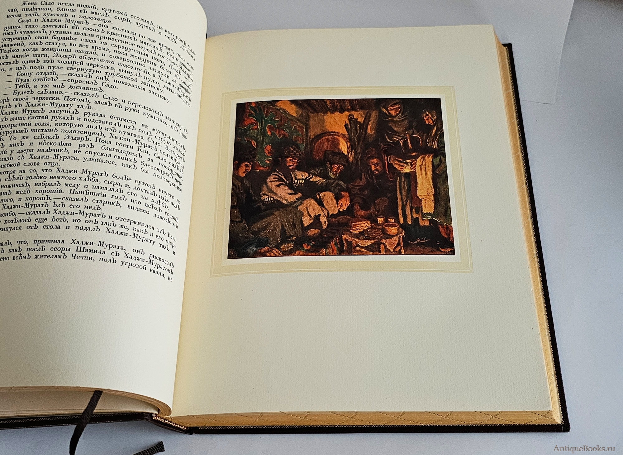 Антикварная книга в красивом современном цельнокожаном переплете с инкрустацией. На верхней крышке переплета - портрет Хаджи-Мурата, героя повести Л.Н.Толстого. Роскошное золотое тиснение по корешку. Золотой обрез с сеточкой. XXXII+162+XIII+[1] стр. Форзацы и золотая дублюра. Книга большого подарочного формата: 31x24 см. Качественная плотная вержированная бумага. С иллюстрациями выдающегося художника Е.Е. Лансере. Чистый красивый и редкий экземпляр.
