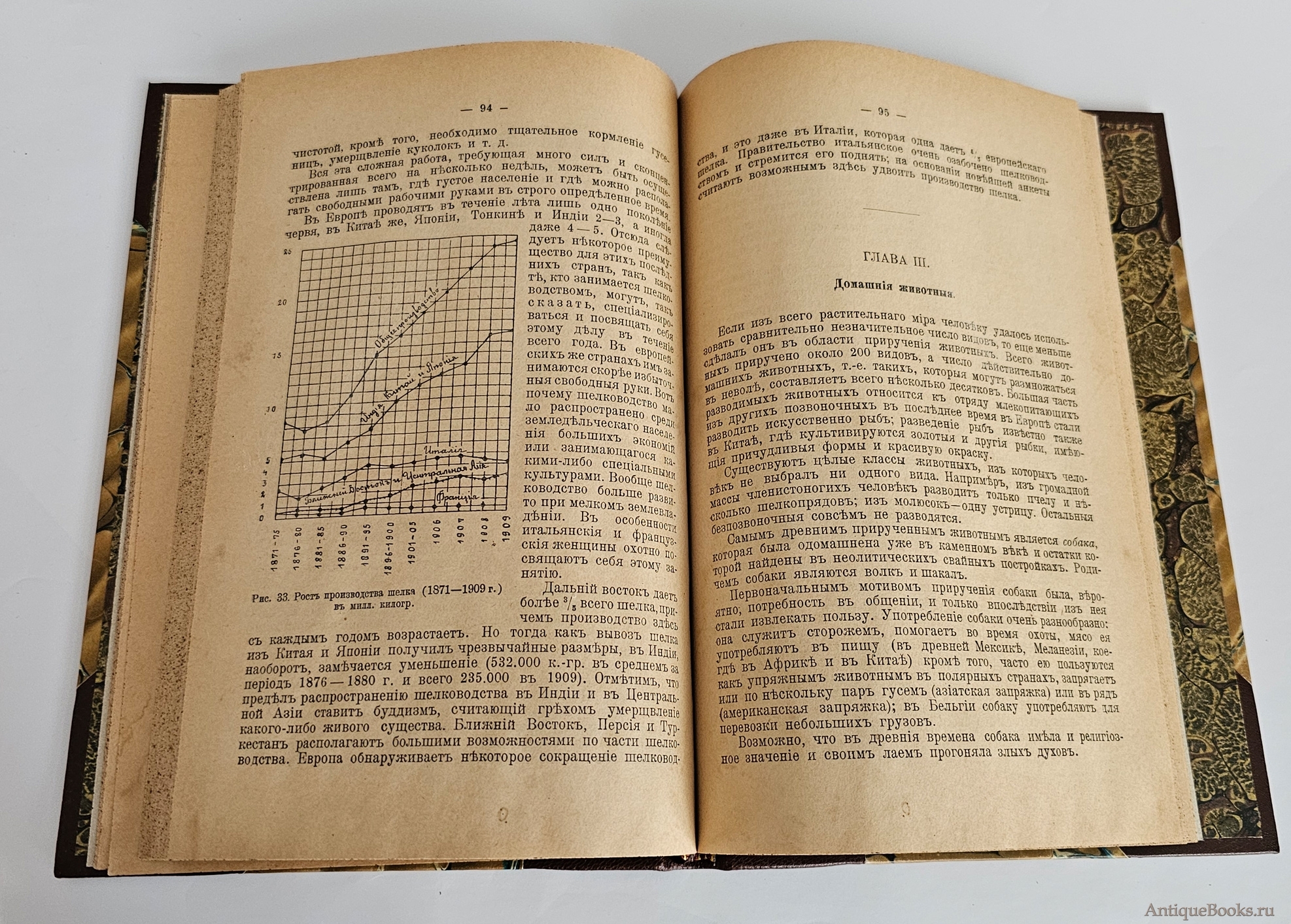 Автор детально разбирает эксплуатацию растительных ресурсов — от клубнеплодов и плодовых деревьев до наркотических и текстильных растений, рассматривает роль домашних животных и добычу горных богатств (каменный уголь, железо). Через конкретные примеры из разных стран Крубер показывает, как природные условия определяют хозяйственные практики, формируя региональные особенности экономики.