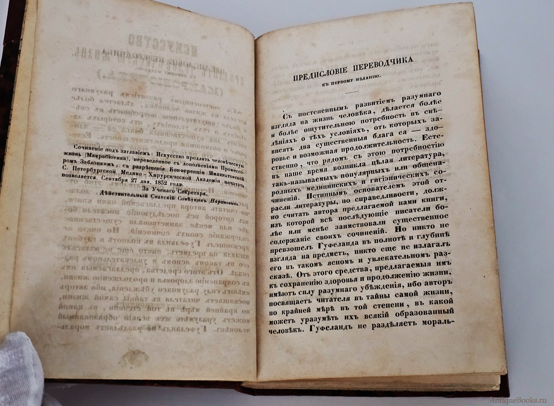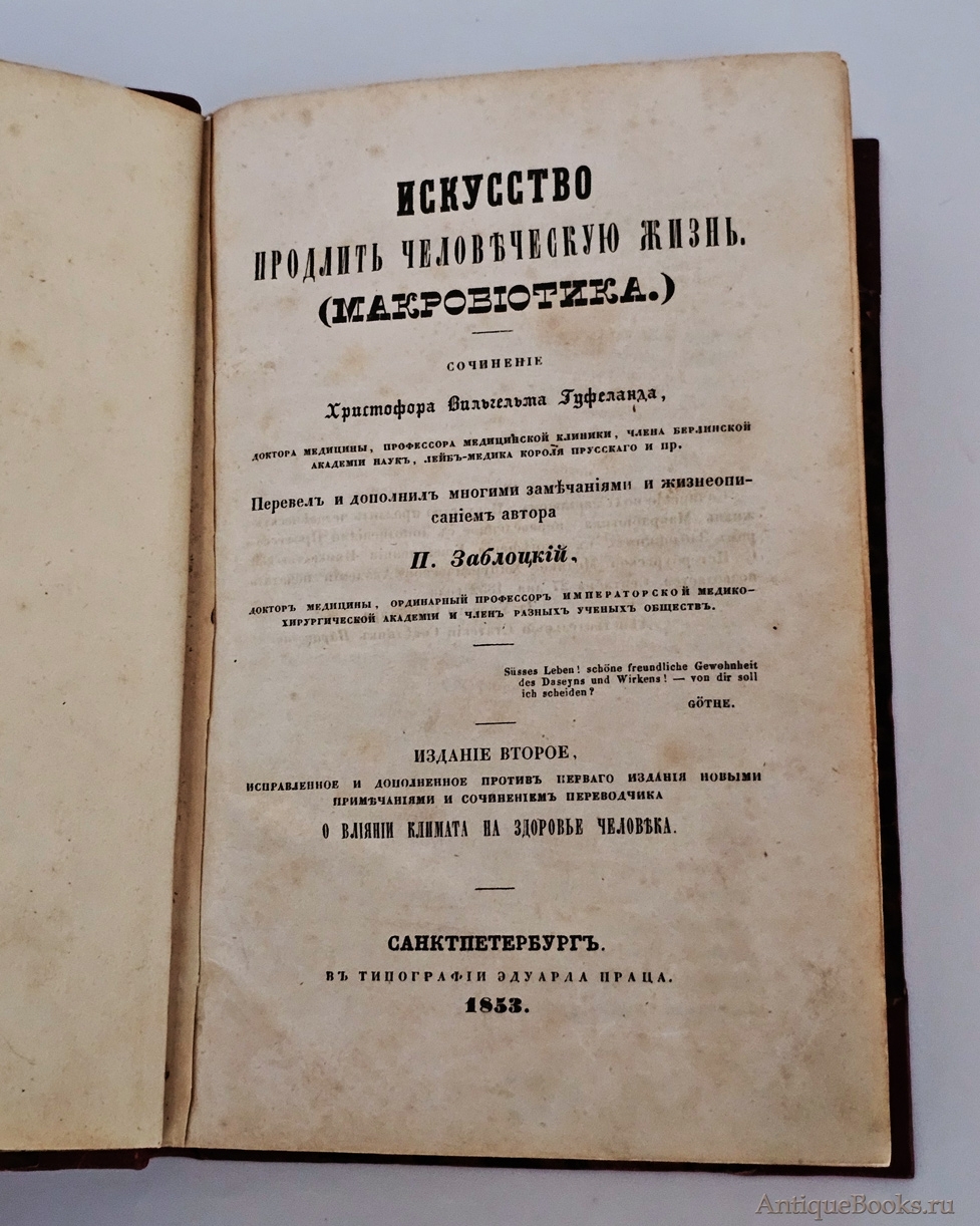 "Искусство продлить человеческую жизнь (макробиотика)" Х. В. Гуфеланд Санкт‑Петербург, типография Э. Праца, 1853 г.
