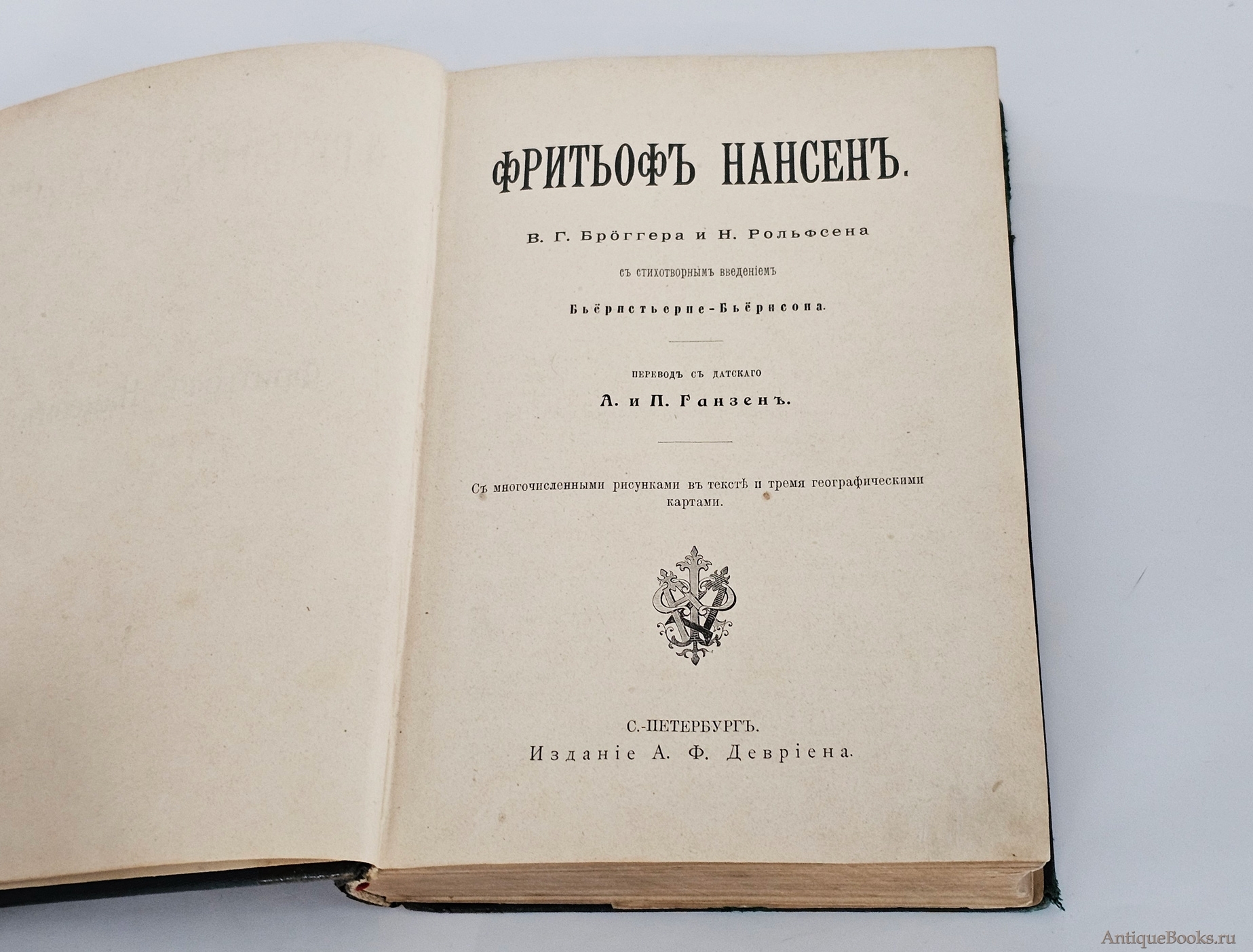 Книга «Фритьоф Нансен» авторов В. Г. Броггера и Н. Рольфсена вышла в Санкт‑Петербурге в 1896 году в издательстве А. Ф. Девриена. Это первое издание, посвящённое жизни и экспедициям норвежского исследователя Арктики Фритьофа Нансена (1861–1930).