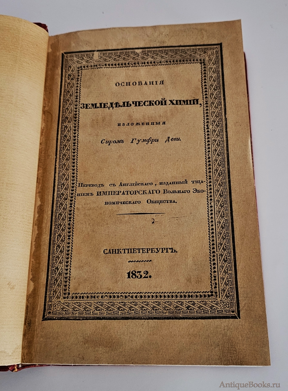 "Основания земледельческой химии" изложенные сиром Гумфри Деви Санкт-Петербург : типография вдовы Байковой, 1832 г.
