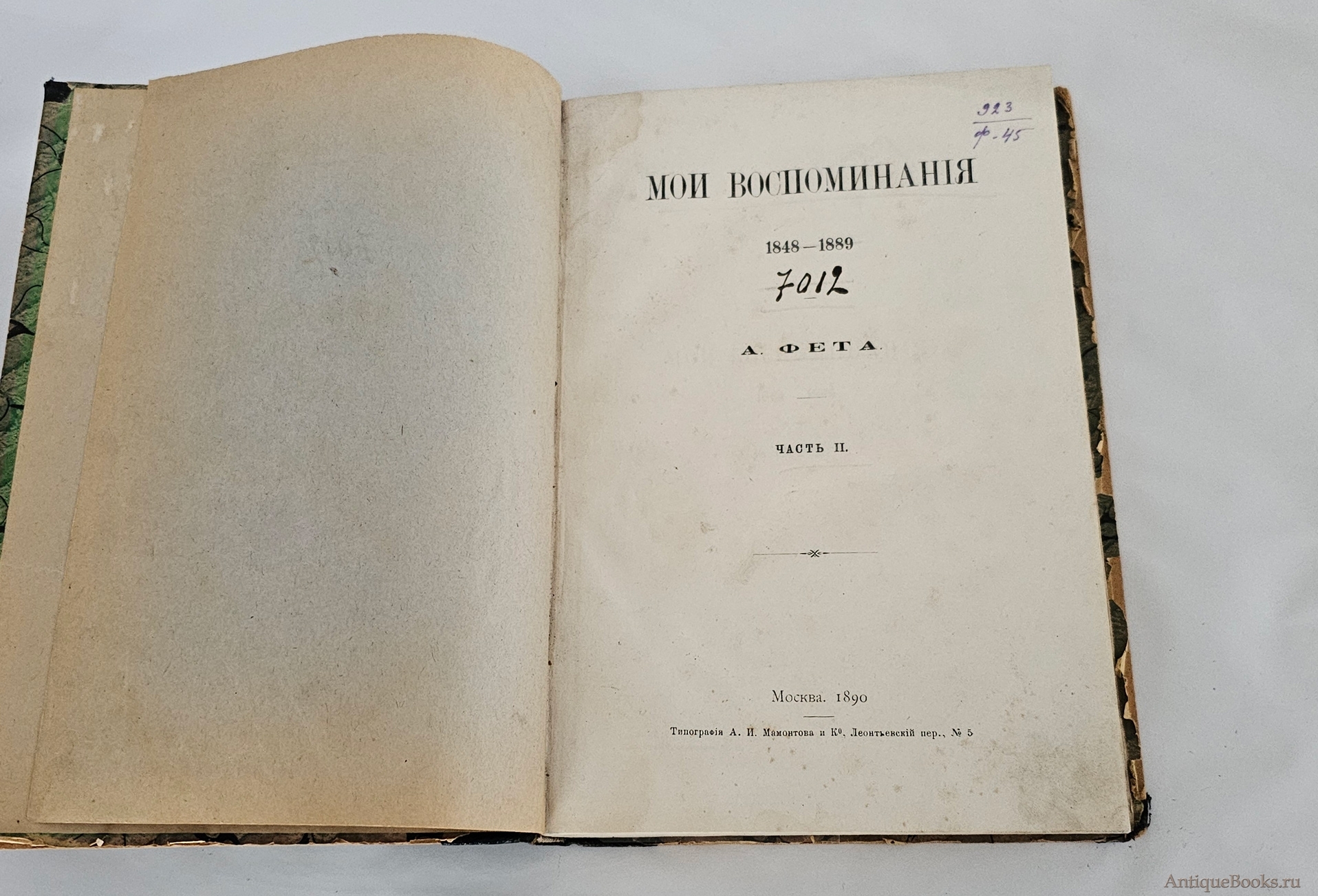 "Мои воспоминания : 1848-1889" А. А. Фет ч. 1-2 - Москва : Типография А.И. Мамонтова и Кº, 1890 г.