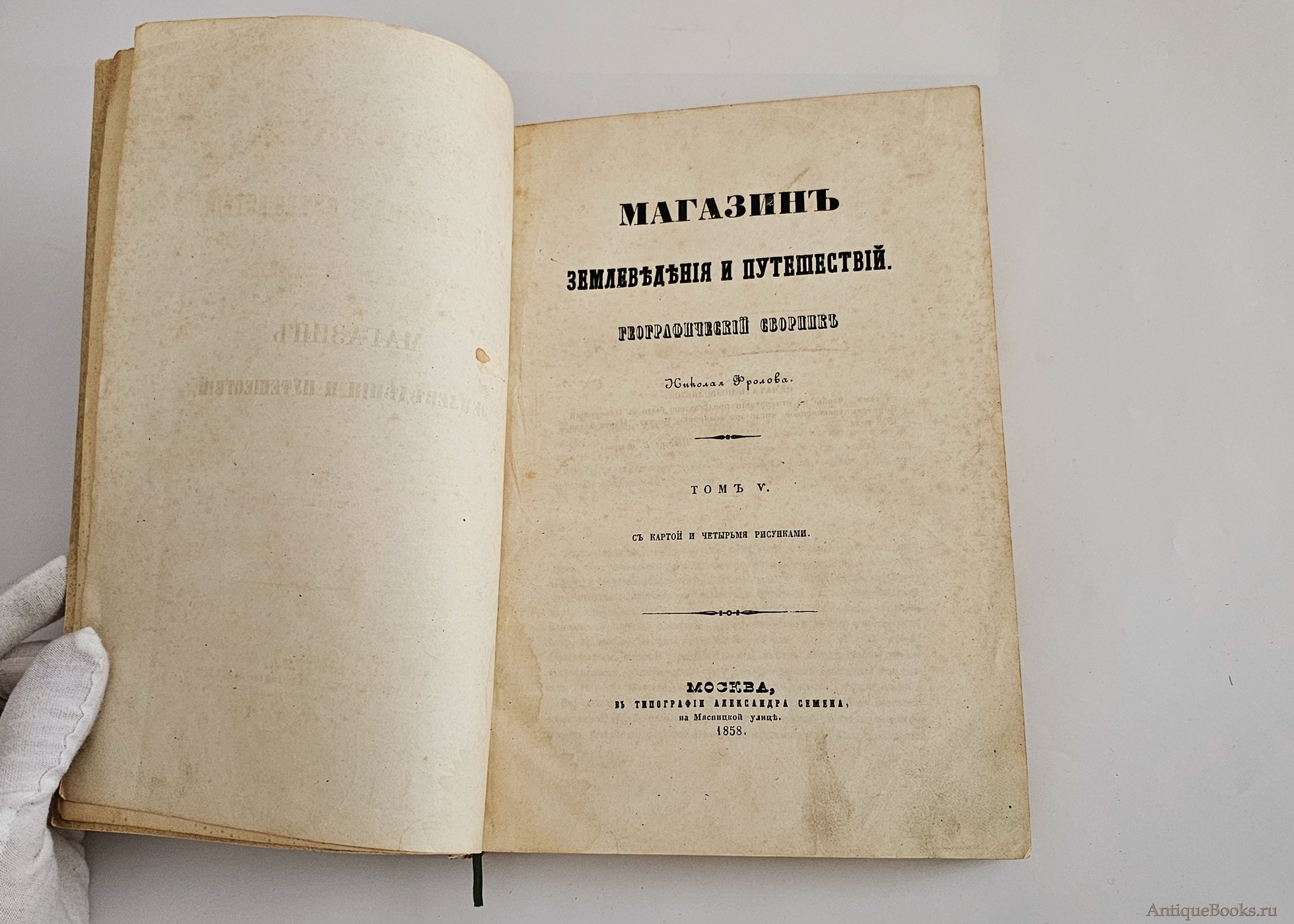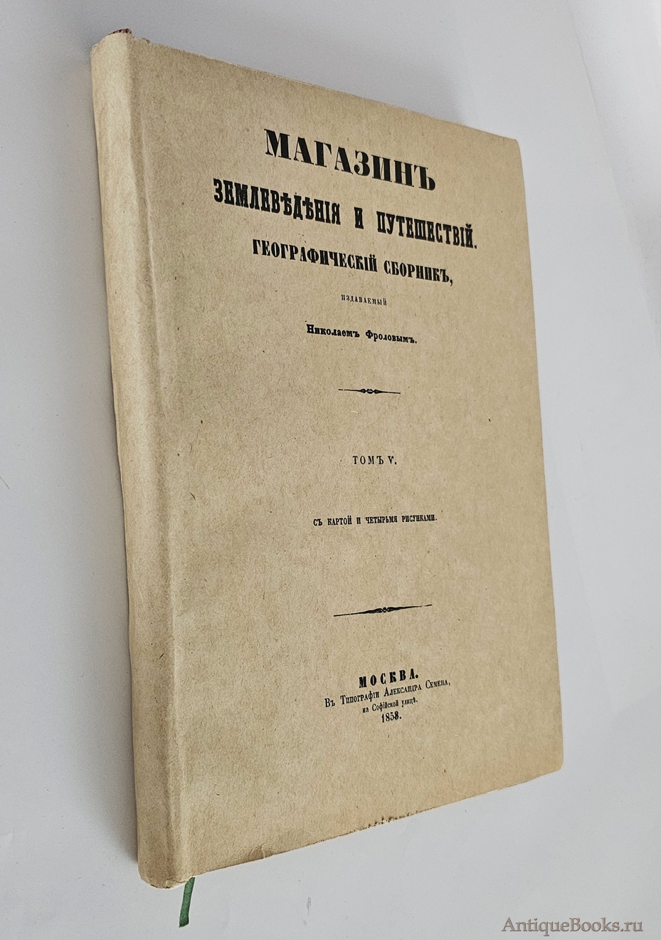 «Магазин землеведения и путешествий. Географический сборник» (в 6 томах), издаваемый Николаем Фроловым, — значимое научно‑популярное издание середины XIX века, популяризировавшее географические знания в России. Том 5 вышел в 1858 году в Москве в типографии Александра Семена.