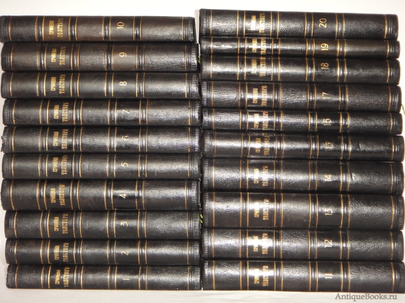Экземпляр в красивых старинный полукожаных переплётах работы известного московского мастера переплётного искусства Г.М.Григорьева. Круглёные бинтовые корешки с золотым тиснением: имени автора, названия издания и порядкового номером тома. Крышки оклеены тёмно-зелёным коленкором с золотой надписью - Левъ Толстой - на передних крышках и глубоким блинтовым клеймом переплётчика на задних.