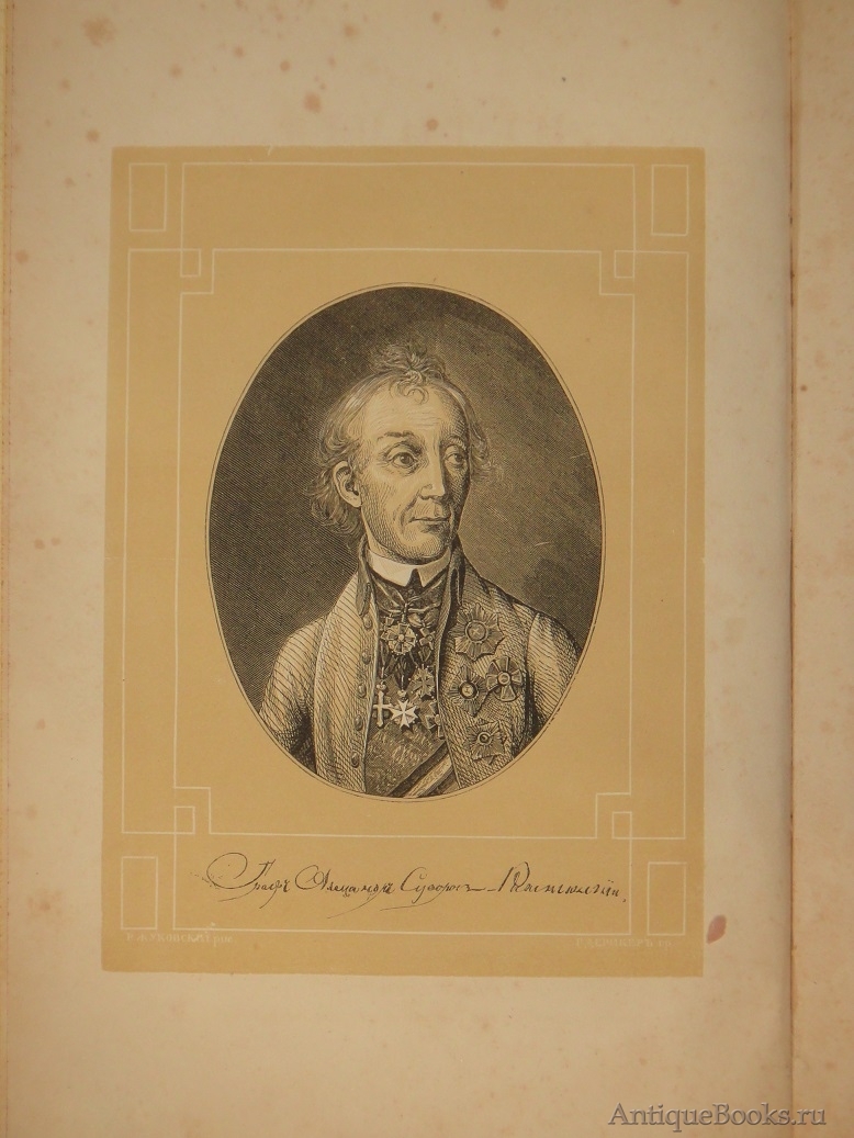 На фронтисписе овальный погрудный портрет А.В.Суворова с его собственноручной факсимильной подписью. Одет генералиссимус в расстёгнутый белый мундир с воротником и с пуговицами в один ряд. На левой груди четыре звезды орденов Андрея Первозванного, Св. Георгия и др. На шее на ленте орден Св. Анны и на лентах 6 крестов. Под мундиром видна лента ордена Андрея Первозванного.