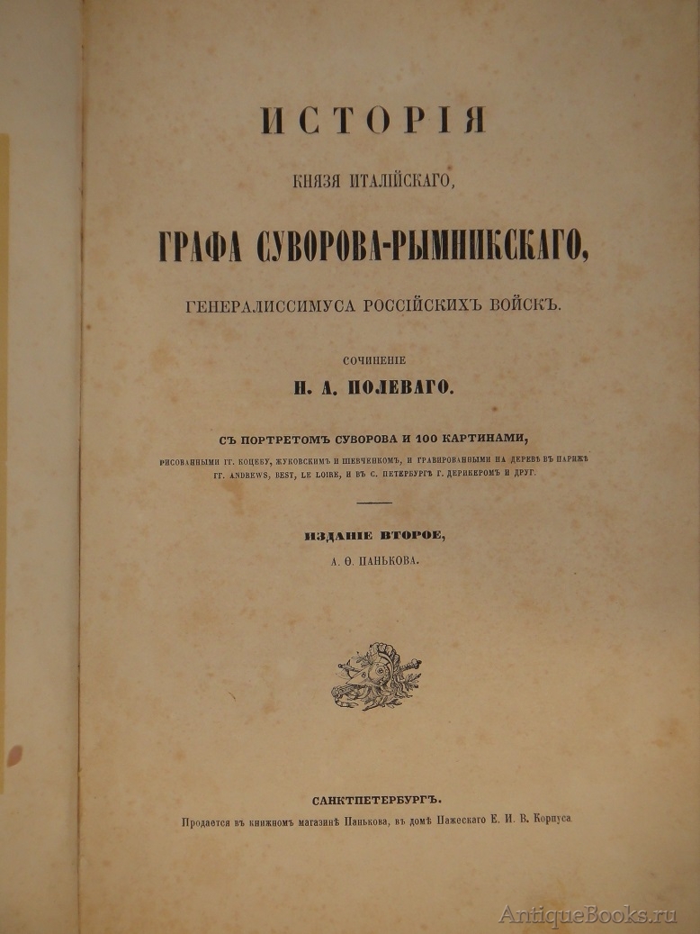 "История князя Италийского графа Суворова-Рымникского генералиссимуса Российских войск" Н.А.Полевой Москва, В Типографии Императорской Академии Наук, 1858г.