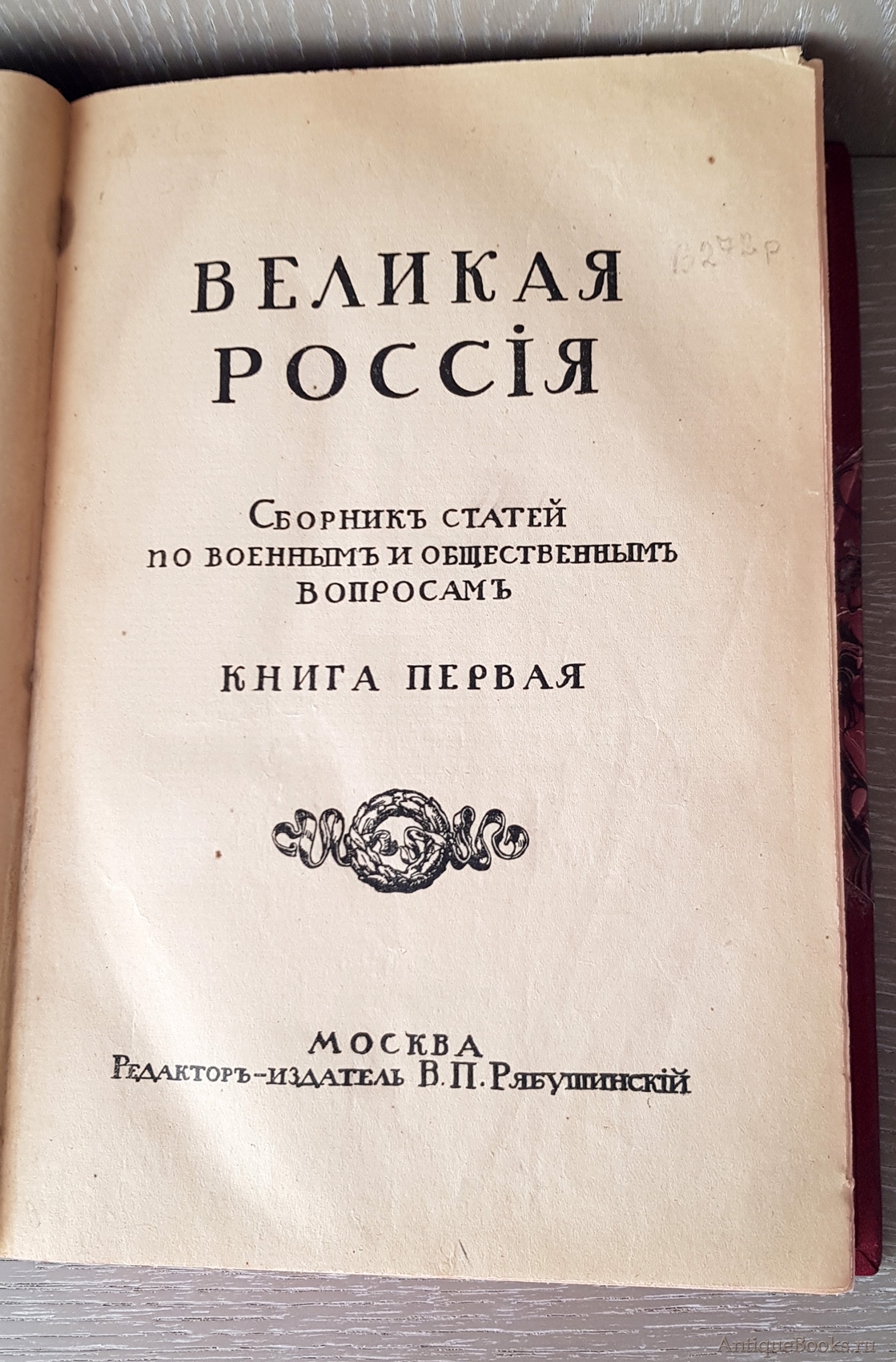 "Великая Россия. Сборник статей по военным и общественным вопросам" Редактор-издатель В. П. Рябушинский Москва, Типография В.П.Рябушинского, 1910-1911 г.г.