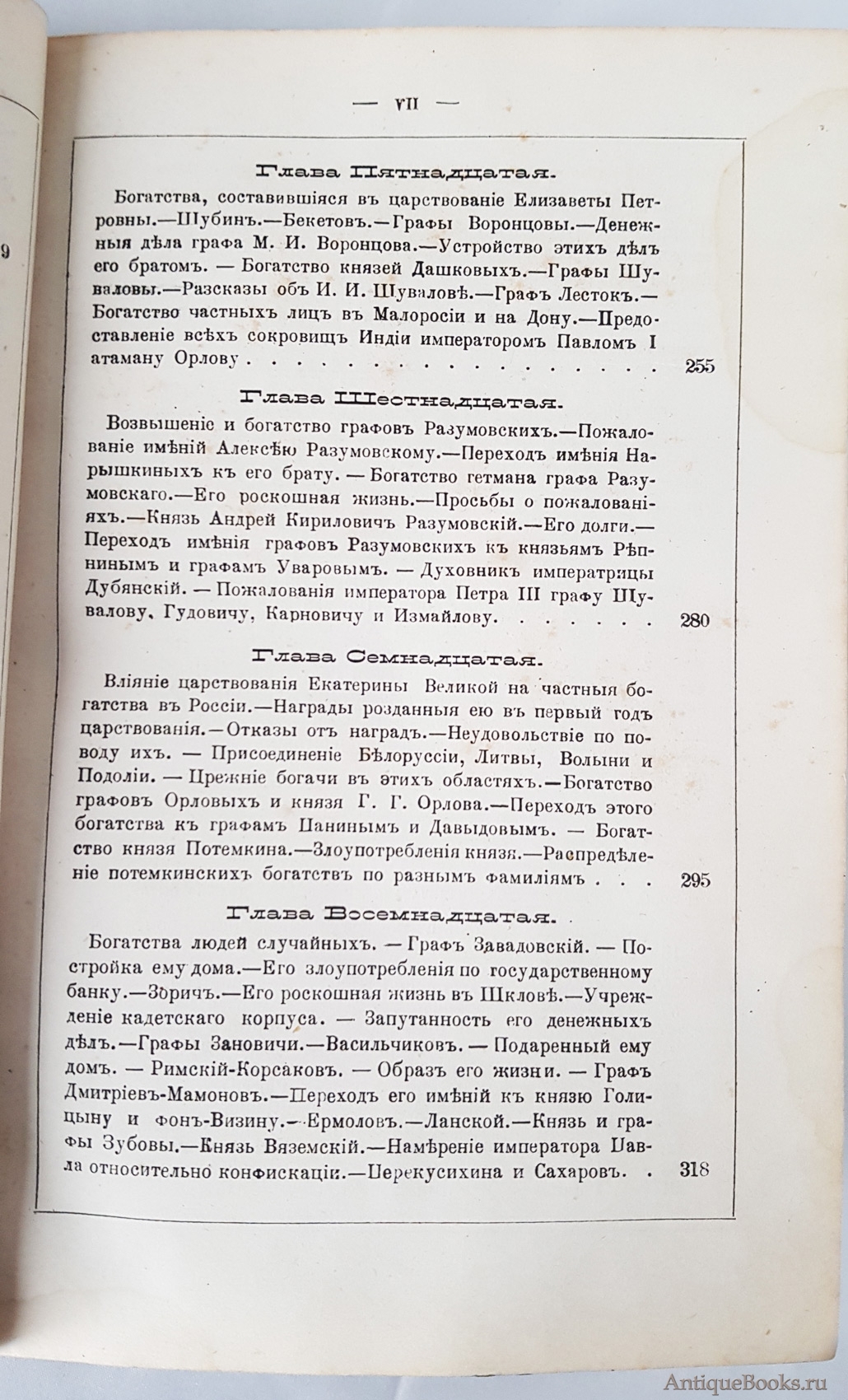 Издание повествует о том, как складывались состояния аристократов при дворе Елизаветы Петровны, кто владел наиболее значительными ресурсами во времена Екатерины Великой и насколько велика была угроза конфискаций при Павле I, упомянуты некоторые богатые иностранцы, состояния частных лиц в Малороссии. Отмечен неодинаковый образ жизни богачей.