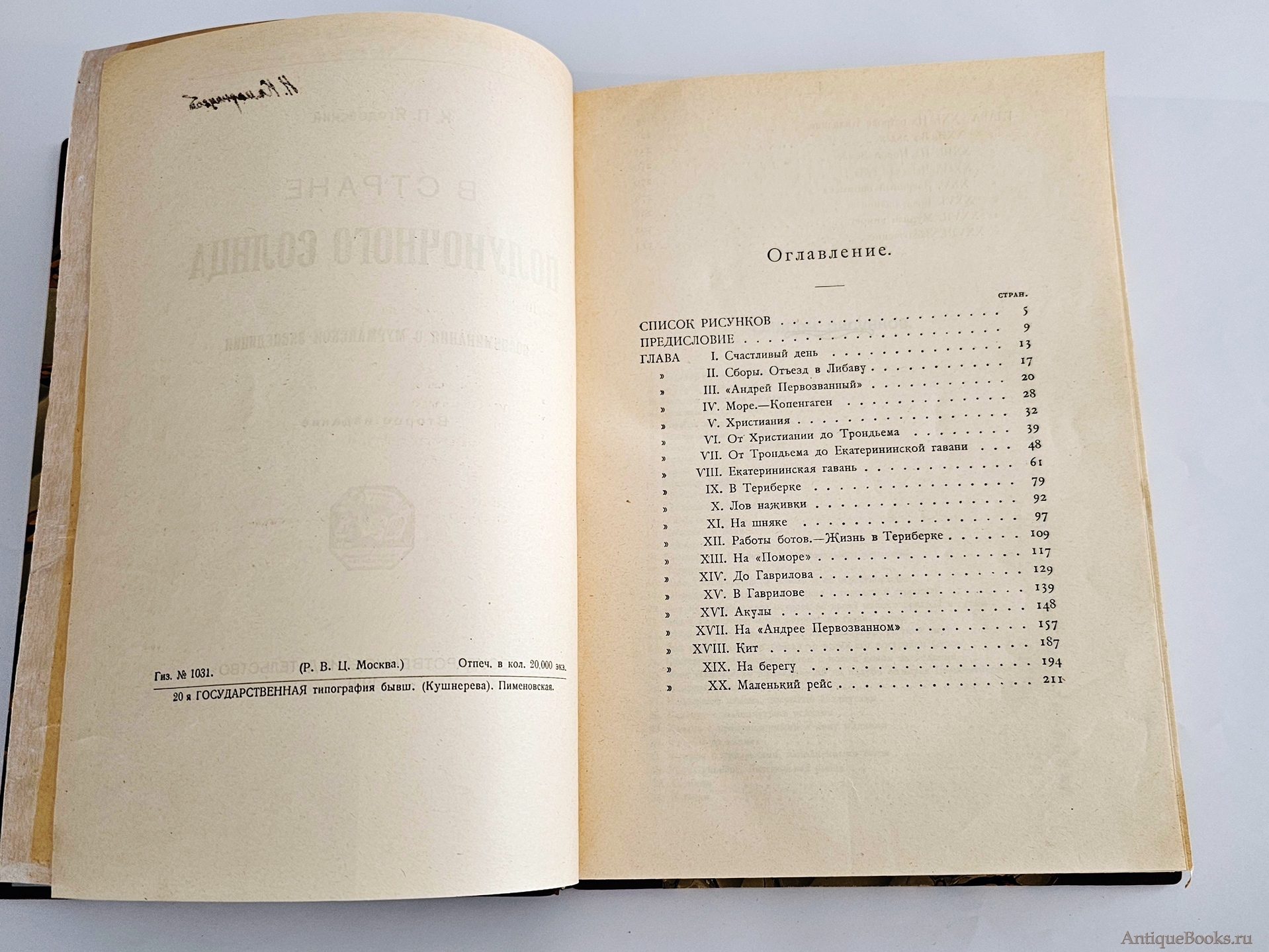 Ягодовский Константин Павлович [1877 – 1943], педагог, естествоиспытатель. В 1899–1901 – участник Мурманской научно-промысловой экспедиции на судах «Андрей Первозванный» и «Помор». Книга «В стране полуночного солнца», создана на основе дневниковых записей; в ней описаны география, природа и население Кольского Севера, быт, работа и участники экспедиции, в т. ч. Н. М. Книпович. Цена: 35 000 руб.
