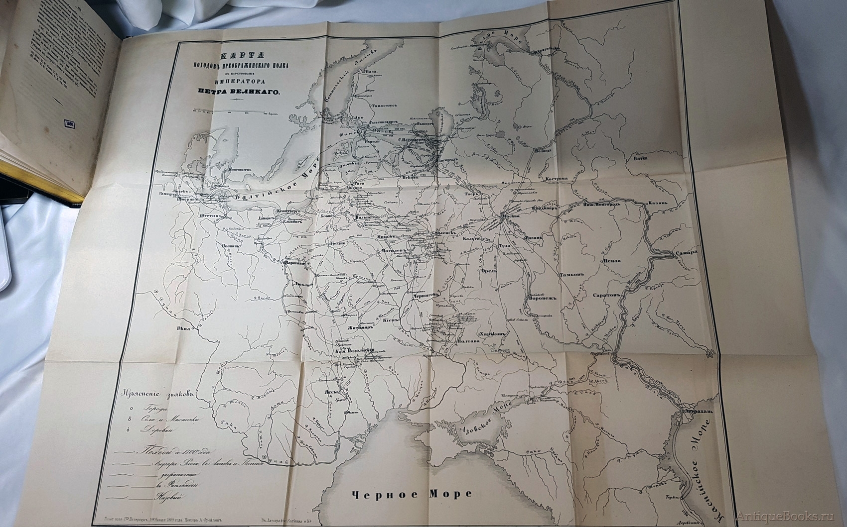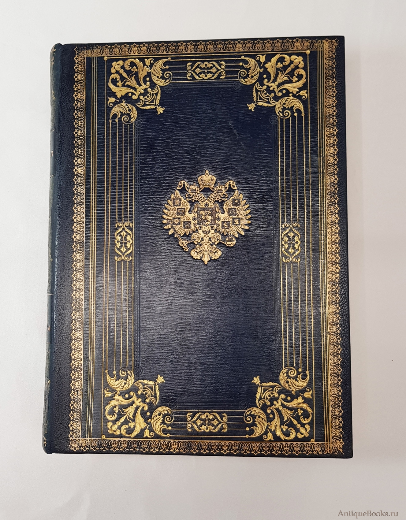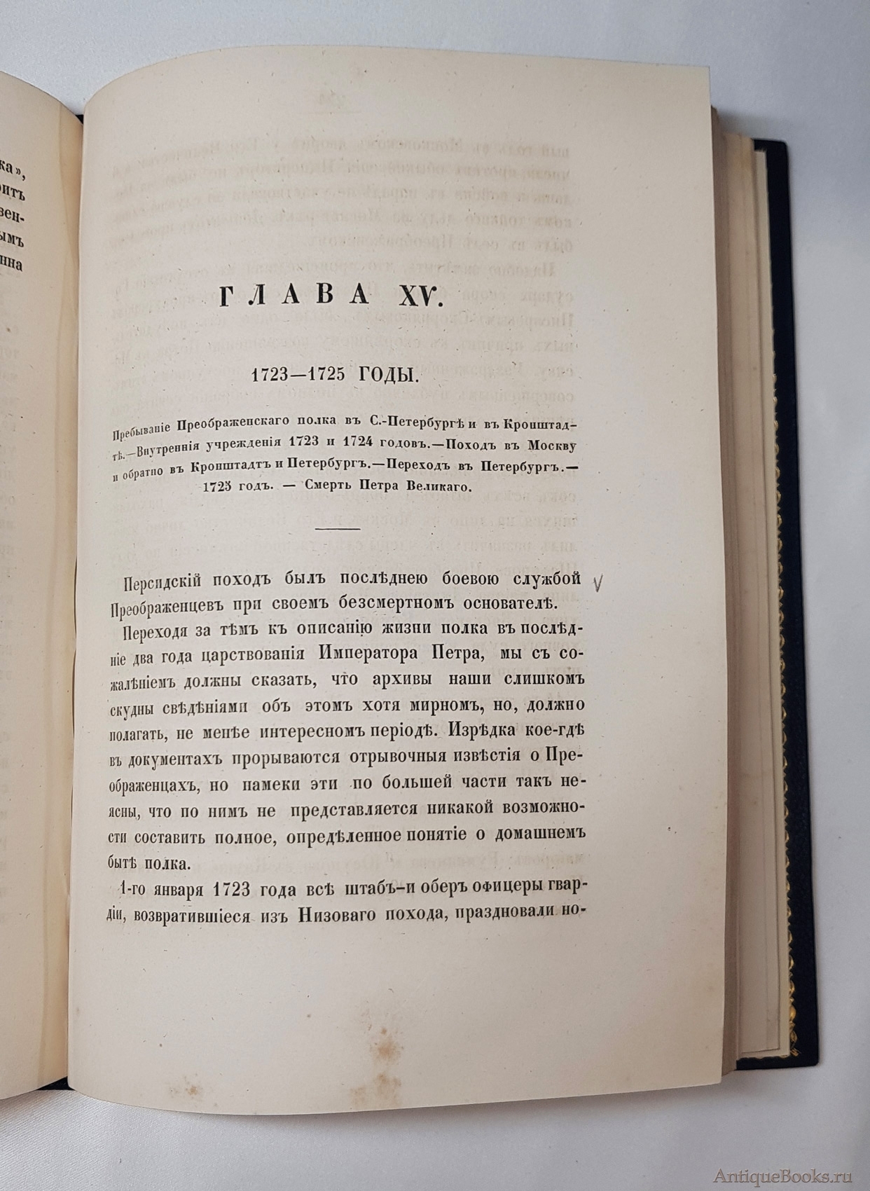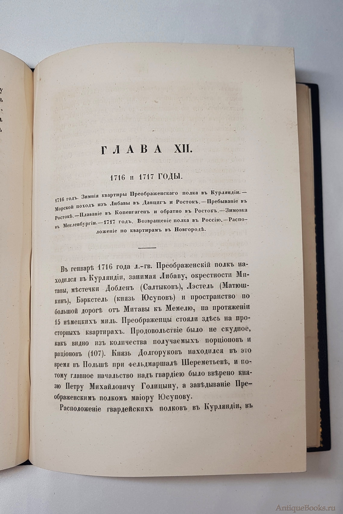 Экземпляр в роскошном цельнокожаном переплёте середины XIX века. Увеличенный формат: 22х16 см.; [XXII], 232, 142 стр. С литографированной большой картой. С тройным золотым обрезом. Круглёный корешок украшен золотым художественным тиснением. Крышки обрамлены изящными симметричными декоративными рамками, тиснёные золотом. С двуглавым орлом на передней покрышке. В конце, после основного текста, помещена большая в несколько разворотов литографированная карта: Карта походов Преображенского полка в царствование Императора Петра Великого. Тираж книги составил 1000 экземпляров.