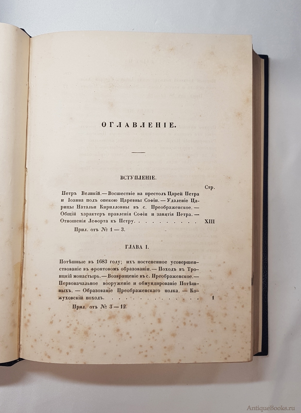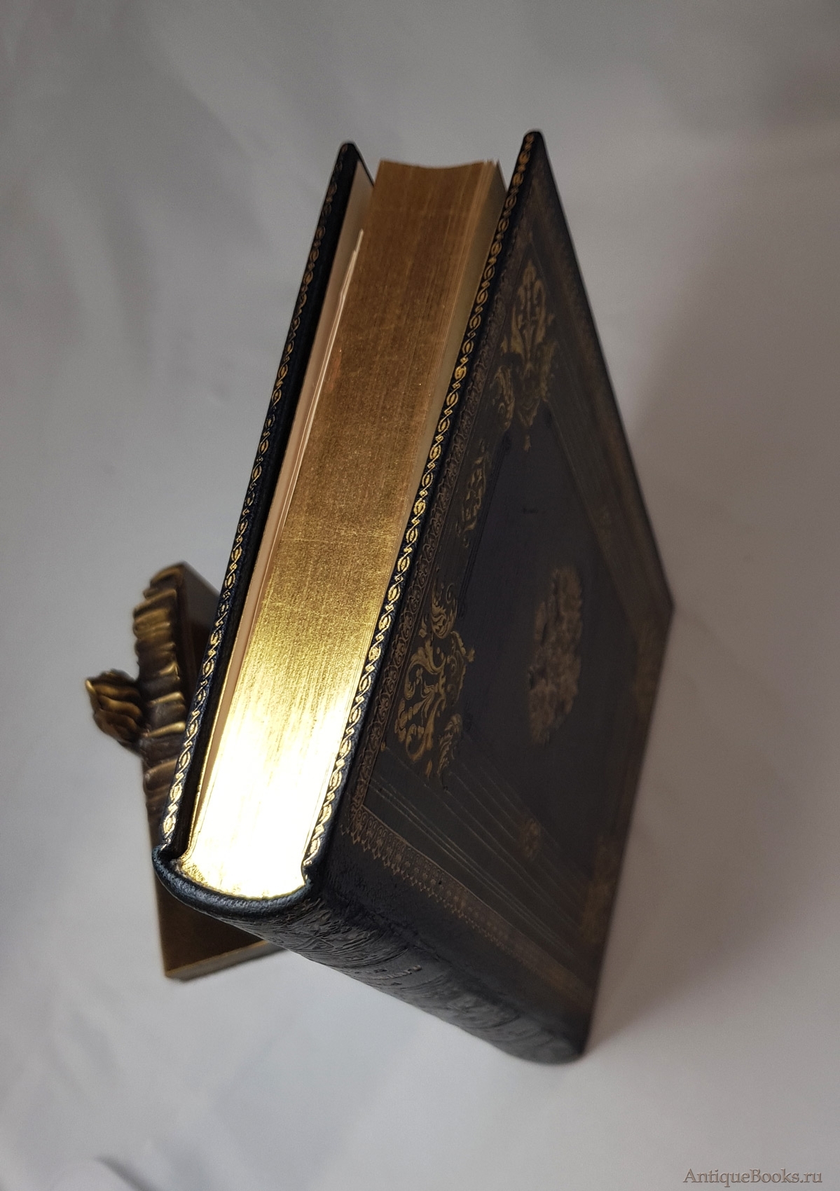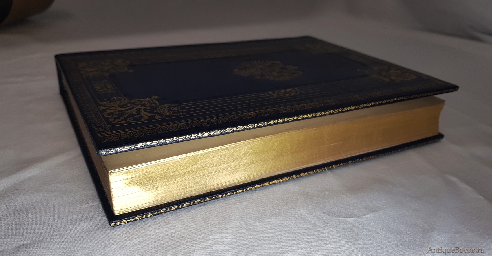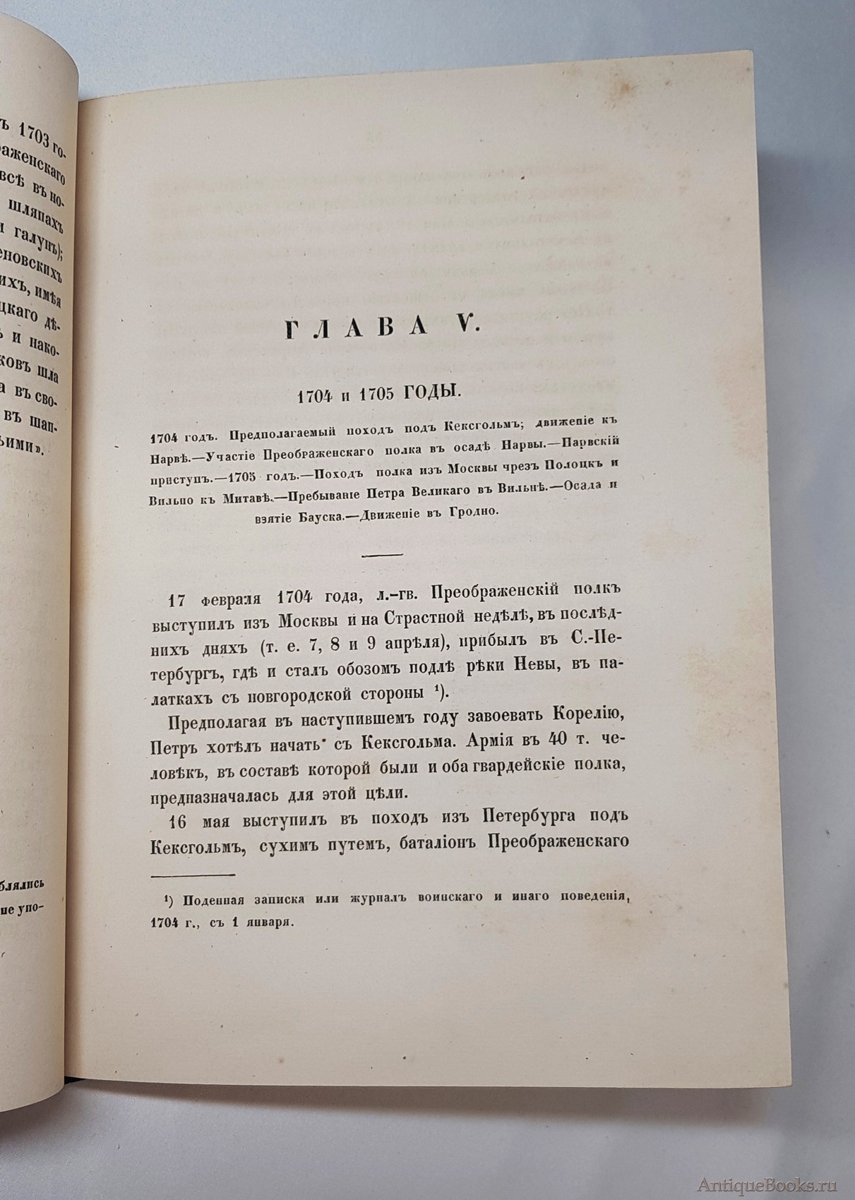 Экземпляр в роскошном цельнокожаном переплёте середины XIX века. Увеличенный формат: 22х16 см.; [XXII], 232, 142 стр. С литографированной большой картой. С тройным золотым обрезом. Круглёный корешок украшен золотым художественным тиснением. Крышки обрамлены изящными симметричными декоративными рамками, тиснёные золотом. С двуглавым орлом на передней покрышке. В конце, после основного текста, помещена большая в несколько разворотов литографированная карта: Карта походов Преображенского полка в царствование Императора Петра Великого. Тираж книги составил 1000 экземпляров.