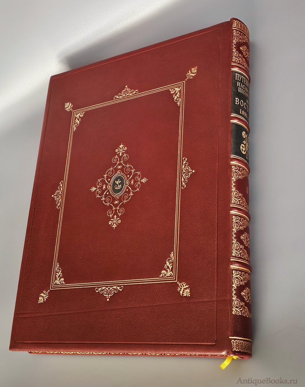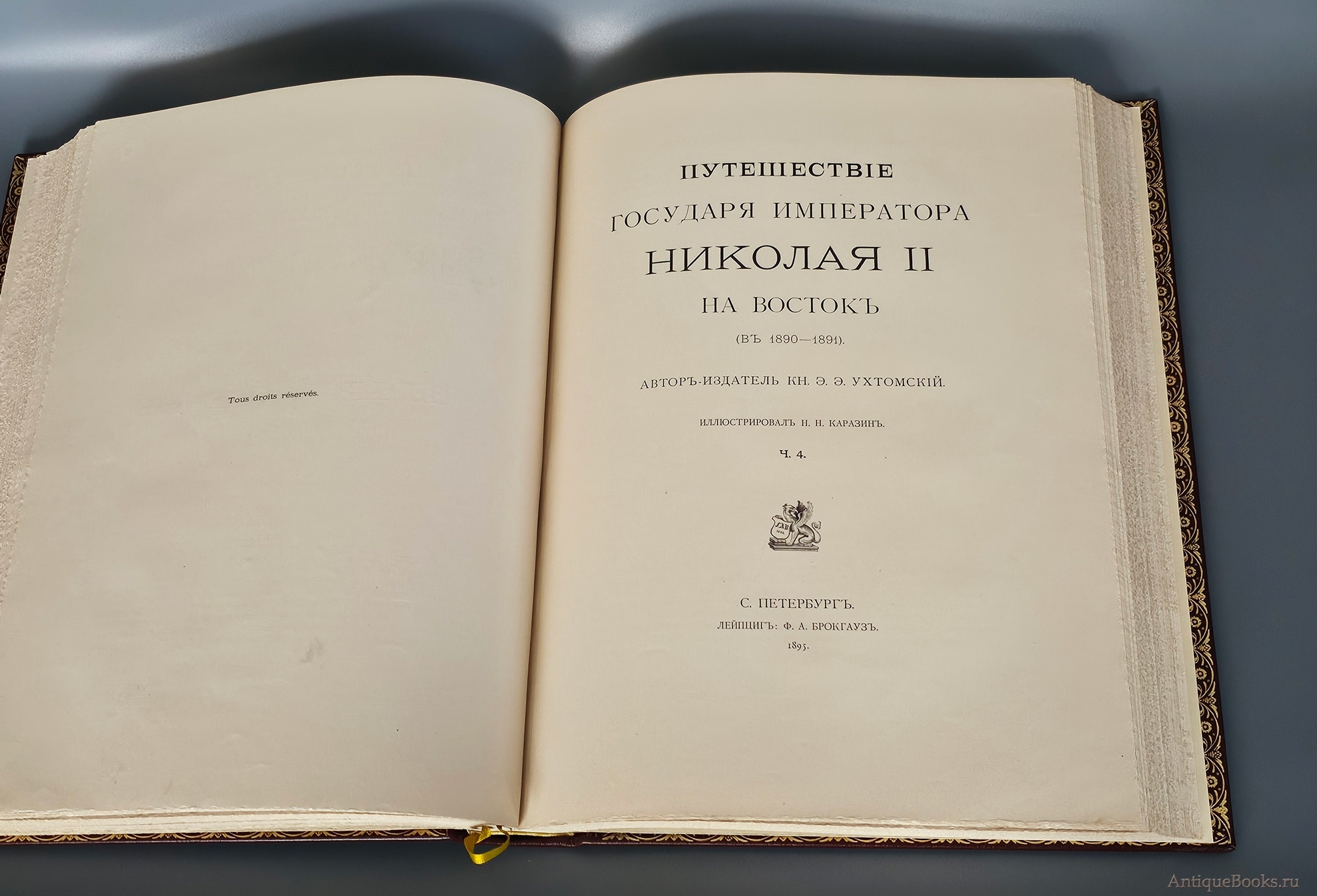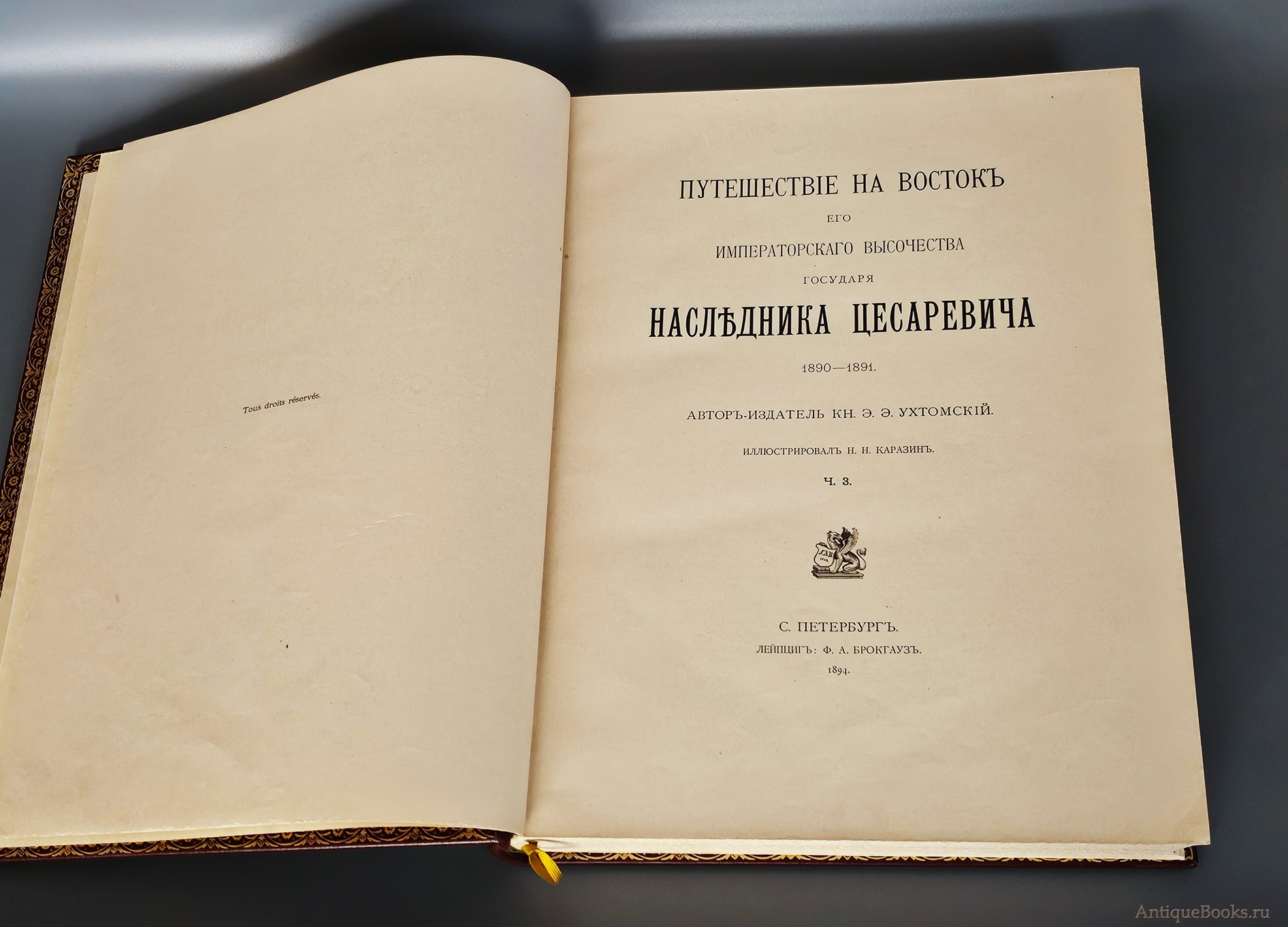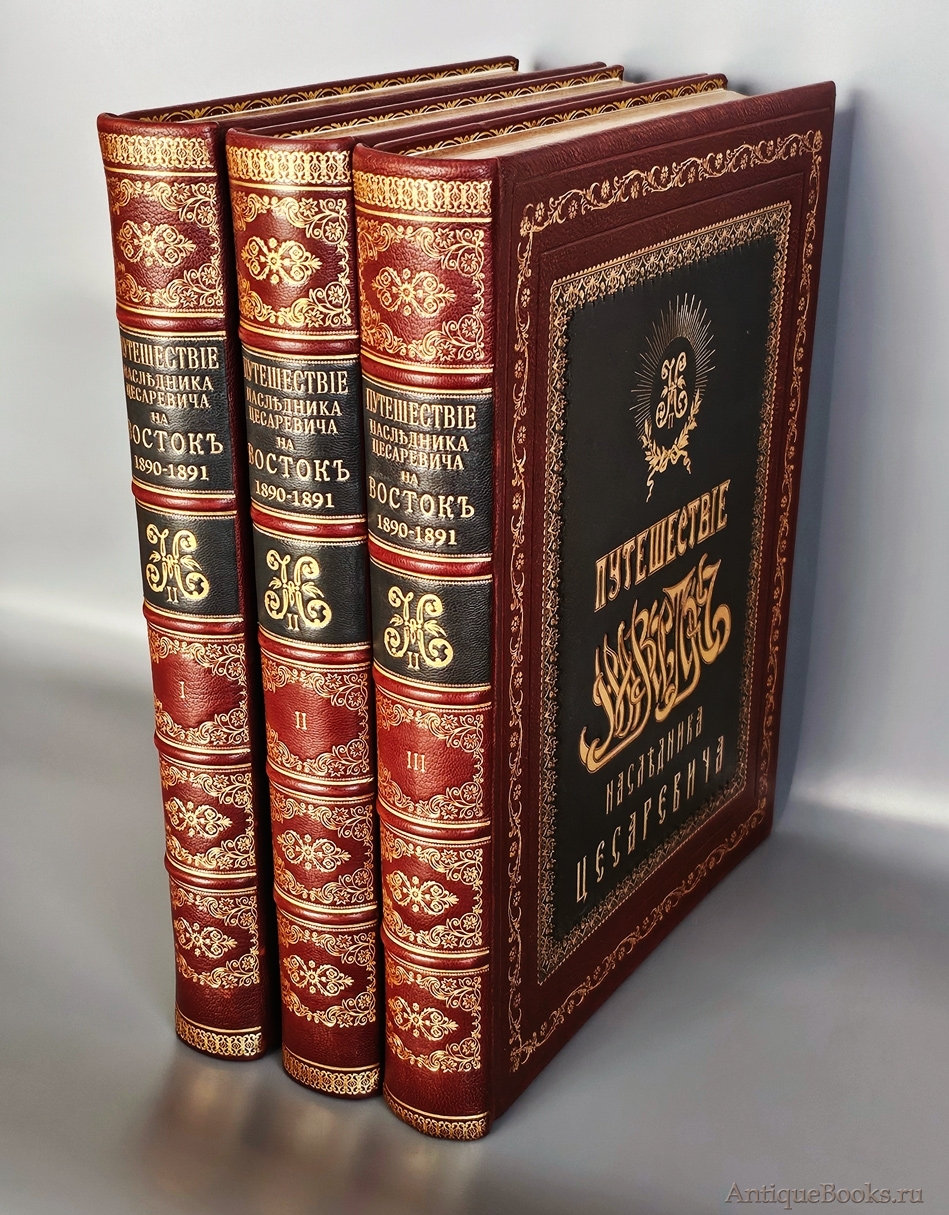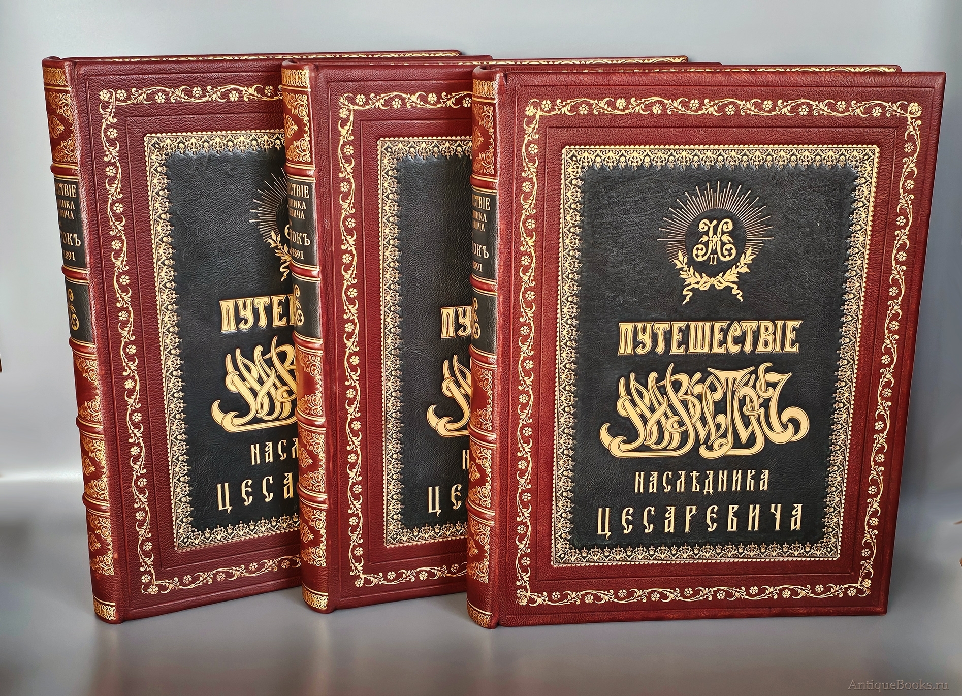 Роскошное издание, посвященное путешествию Цесаревича Николая (будущего Императора Николая II) на Восток, которое продолжалось с 23 октября 1890 г. по 4 августа 1891 г.: это путешествие задумывалось как заключительный этап образования наследника российского императора, одновременно являясь важнейшим дипломатическим шагом со стороны императора-отца. Э. Ухтомский, издавший подробное описание этого путешествия, сопровождал наследника среди прочих членов его свиты. Первый том "Путешествия" вышел в свет в 1893 году, второй и третий тома - в 1895 и 1897 гг. И немедленно после этого книга была переведена на английский, немецкий и французский. Помимо занимательных описаний увиденных мест, произошедших во время путешествия событий и встреч, а также ценнейших сведений по истории и культуре восточных народов - наследник со свитой посетил Египет, Индию, Сиам, Китай и Японию, - книга замечательна и многочисленными иллюстрациями, выполненными Н.Н. Каразиным, знаменитым художником, получившим прозвание "русский Доре". В книге более 700 иллюстраций Н.Н.Каразина - многочисленные текстовые и полностраничные рисунки.